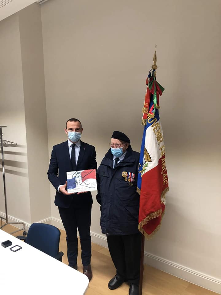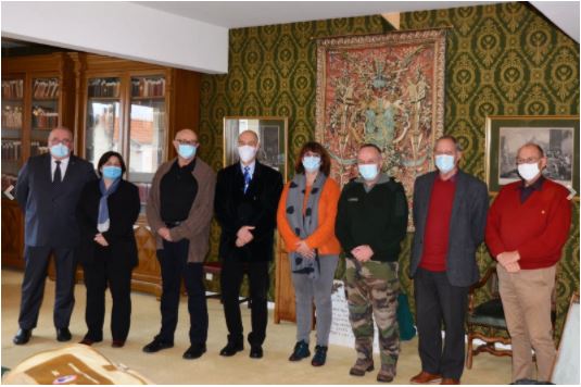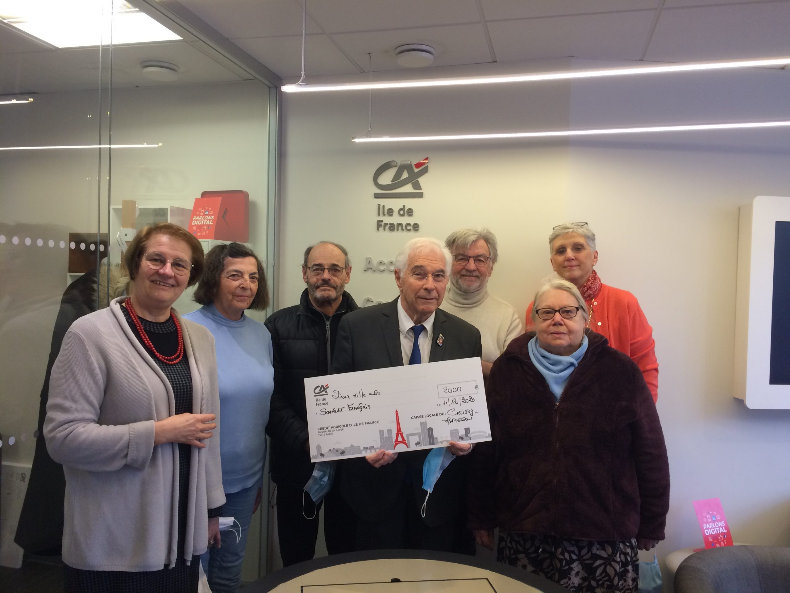 Remise d’un chèque de la part du Crédit Agricole au comité du Souvenir Français de Rueil-Malmaison (Hauts-de-Seine), dans le cadre du mécénat pour les travaux liés à 1870, menés par ce comité, le 5 décembre 2020.