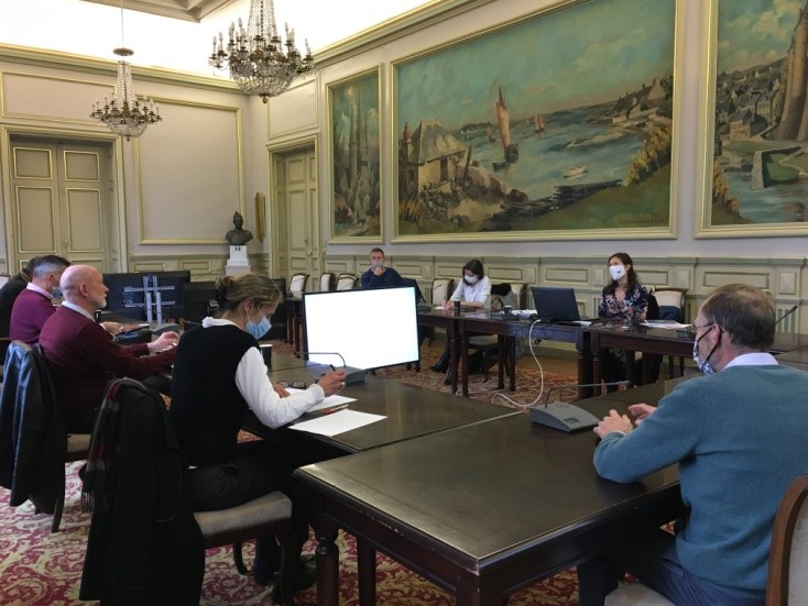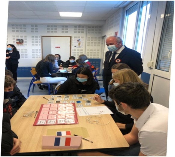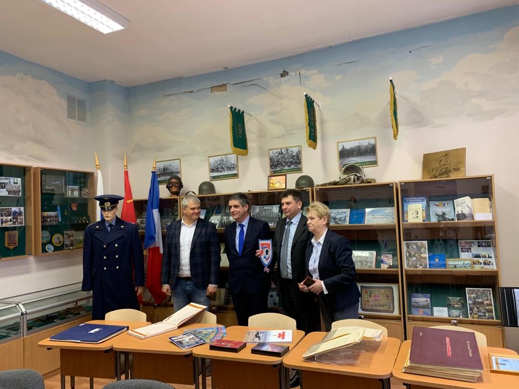 Rencontre de travail entre le Souvenir Français de Moscou et l’école moscovite Romain Rolland, qui possède un musée de la résistance en Russie, en présence de Roman Poutine, neveu du Président de la République, Ivan Martin, attaché de la défense, Vincent Fougère attaché de l’armée de l’air. A l’ordre du jour : le partenariat entre cette école et le Souvenir Français, sur le travail en Russie, sur le régiment de chasse Normandie-Niemen et sur les guerres napoléoniennes.
