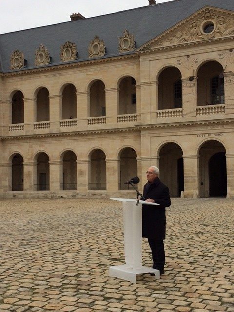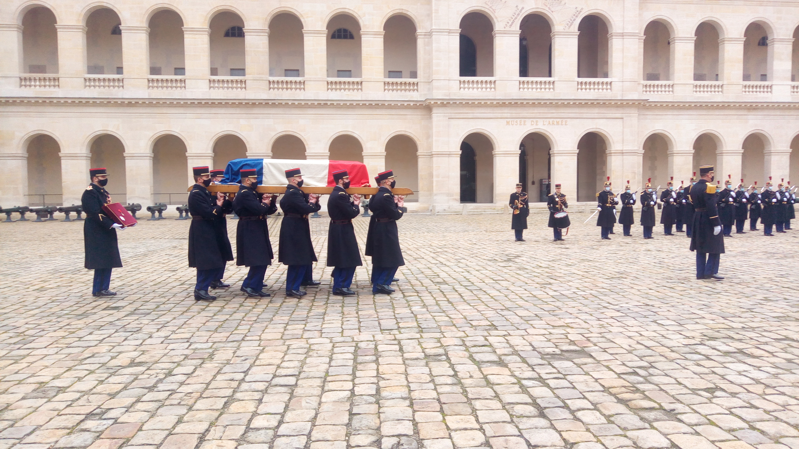 Célébration des obsèques de Pierre Morel, grand résistant et président d’honneur du Comité d’Action de la Résistance décédé le 28 décembre 2020, dans la Cour des Invalides le 11 janvier 2021. Le Président général du Souvenir Français, le contrôleur général des armées (2s) Serge Barcellini a prononcé l’éloge funèbre.