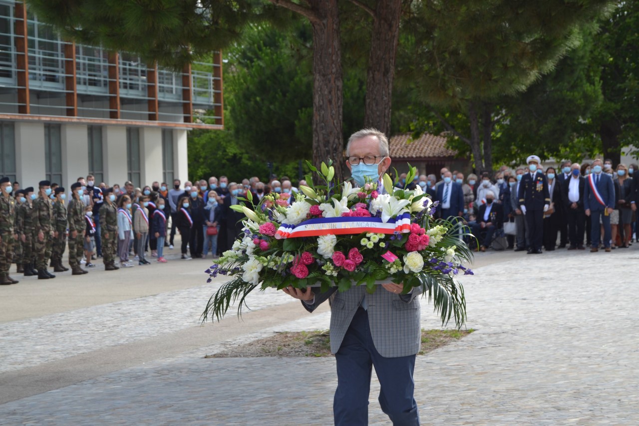 Participation de la délégation générale des Pyrénées Orientales à l’hommage rendu à Louis Torcatis, compagnon de la Libération, et à Pierre Lauret, résistant mort au combat à Perpignan le 19 août 1944, organisé par la commune de Perpignan le 19 août 2021, lors de la cérémonie commémorant la libération de Perpignan.