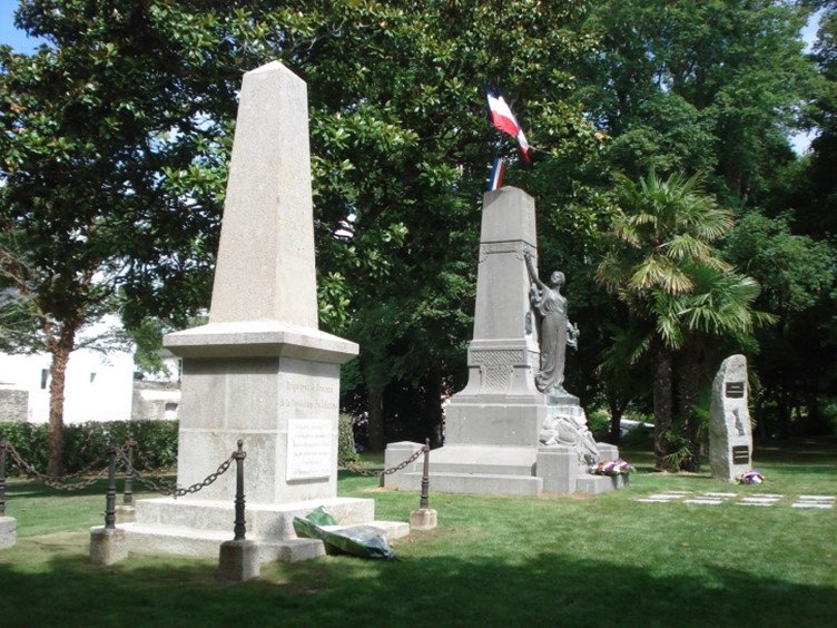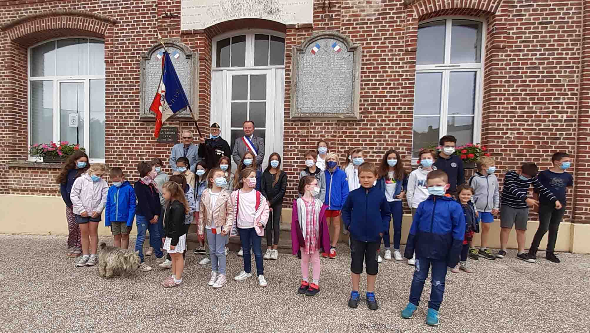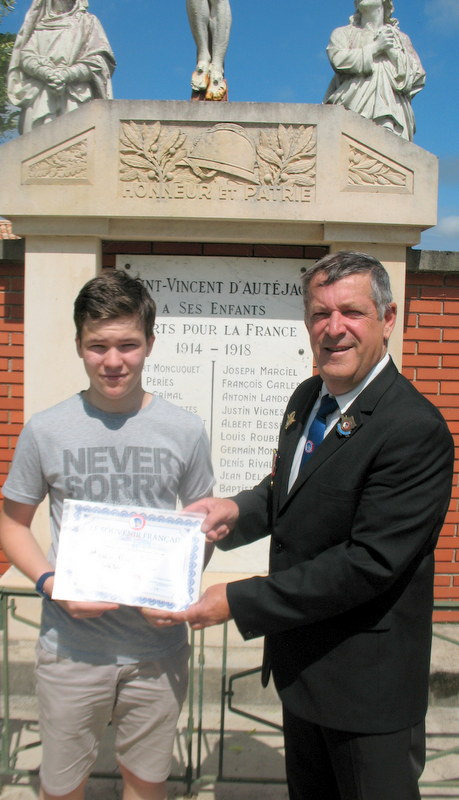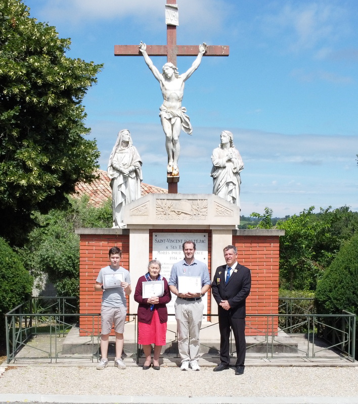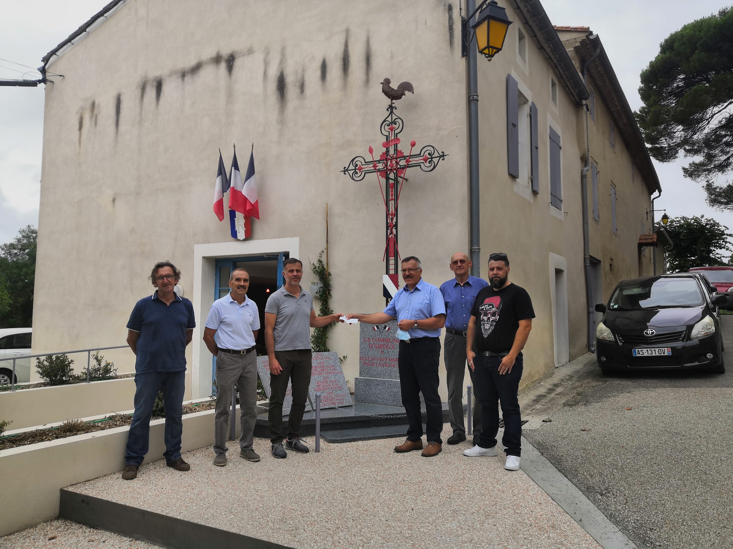 Remise d’un chèque du Souvenir Français à la commune d’Airoux (Aude) le 6 août 2021 par le président du comité de Castelnaudary, pour aider la commune à rénover son monument aux Morts, sur lequel Le Souvenir Français a demandé l’ajout du nom d’un airouxois, mort au cours du conflit franco-prussien de 1870-1871.