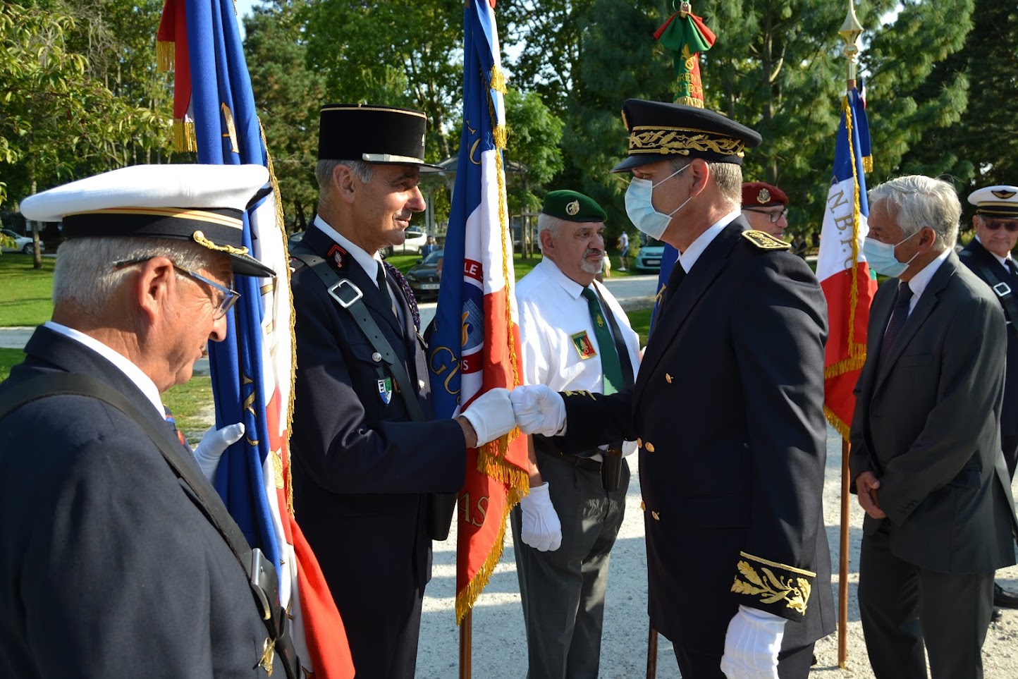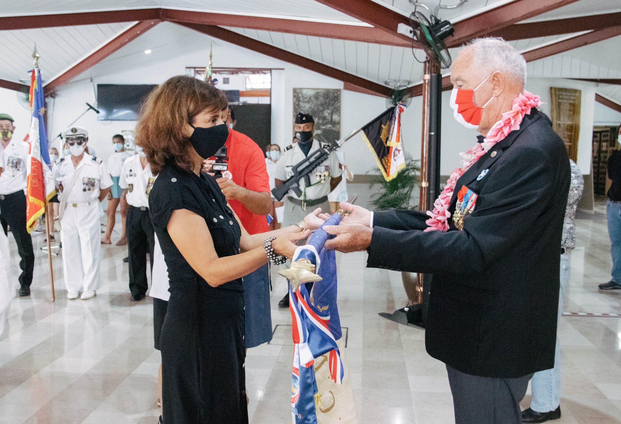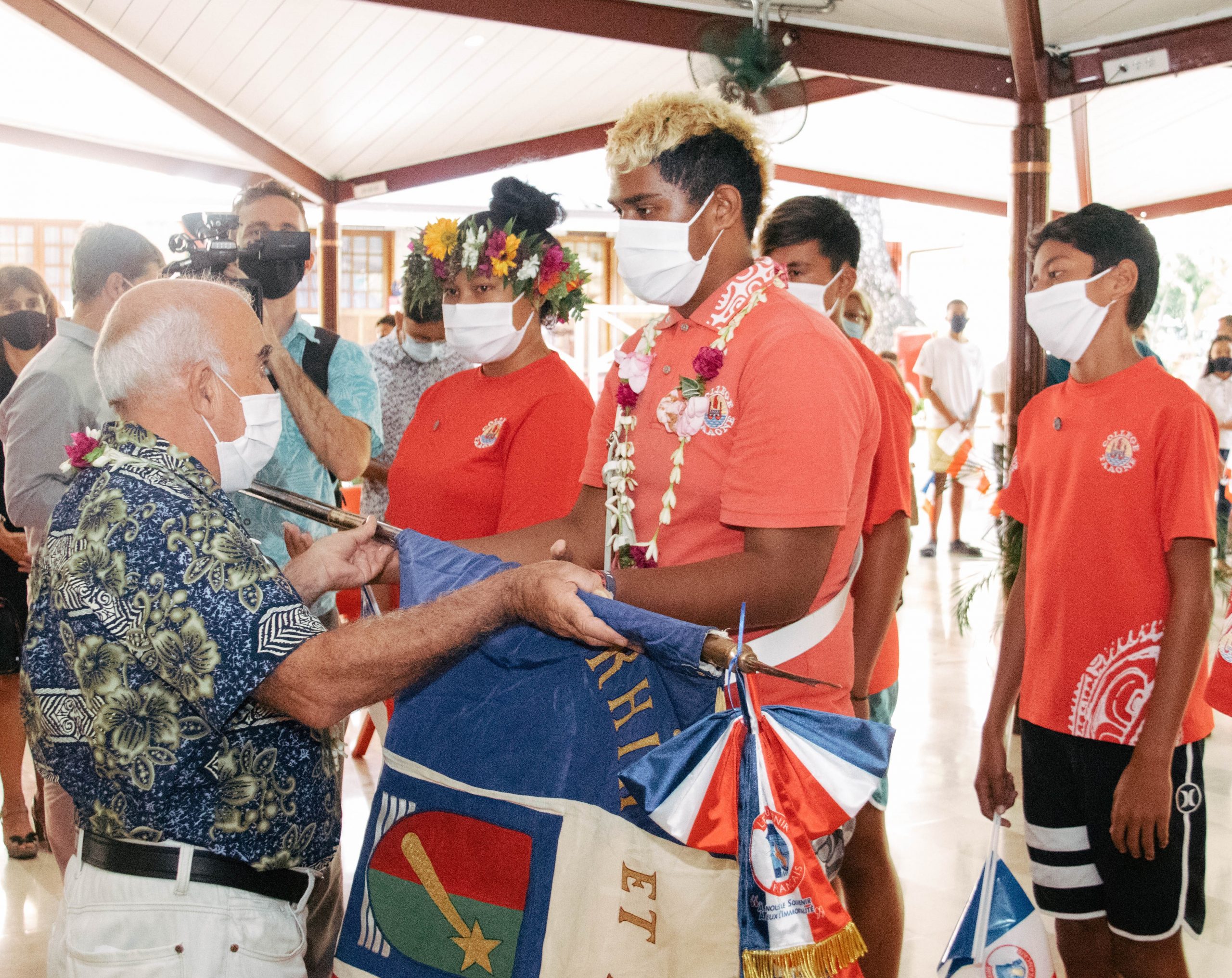 Remise de drapeaux aux établissements scolaires de Tahiti, le drapeau de l’association Rhin et Danube pour le collège de Taaone, et le drapeau de l’Association des combattants volontaires de la Résistance pour le collège de Tipaerui, au mois de juillet 2021.