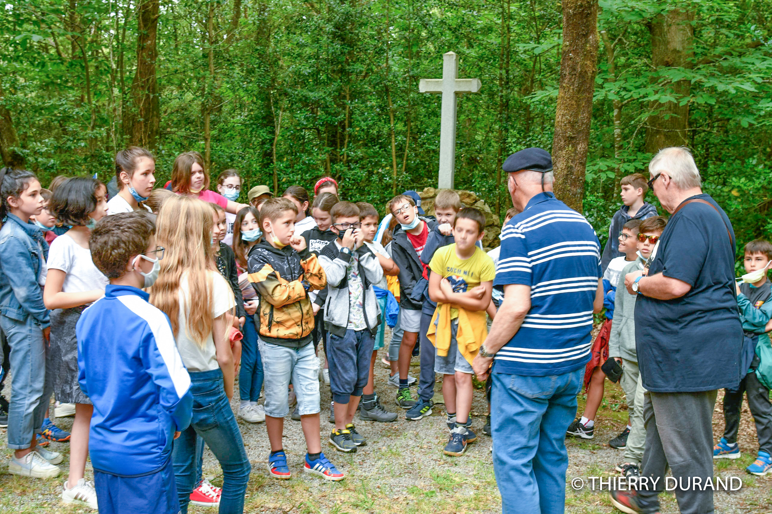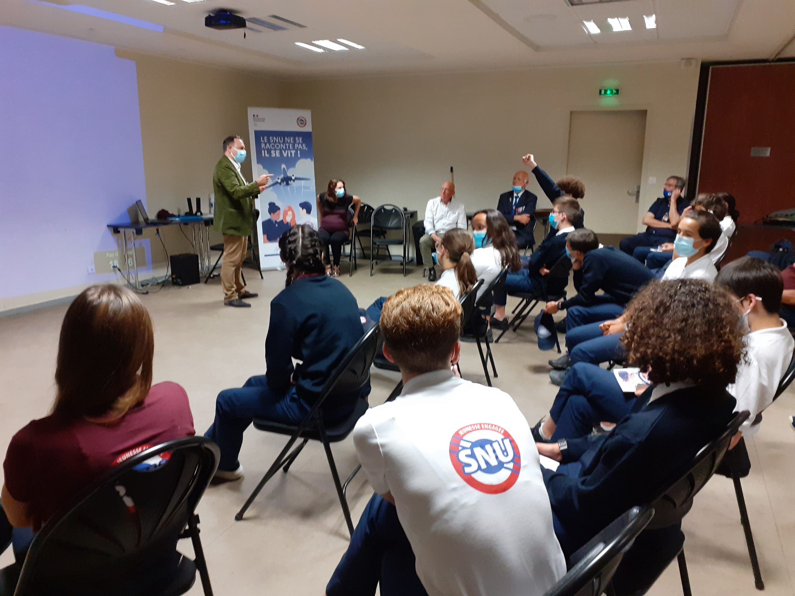 Intervention d’un groupe de recherche d’adhérents de la délégation du Souvenir Français de la Haute-Garonne, auprès de volontaires du SNU, pour leur présenter le travail du Souvenir Français et leur travail de recherche autour de l’identité de cinq résistants inconnus du Bois de la Reulle à Gragnague, le 30 juin 2021.