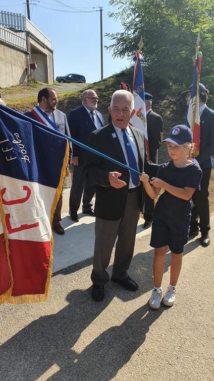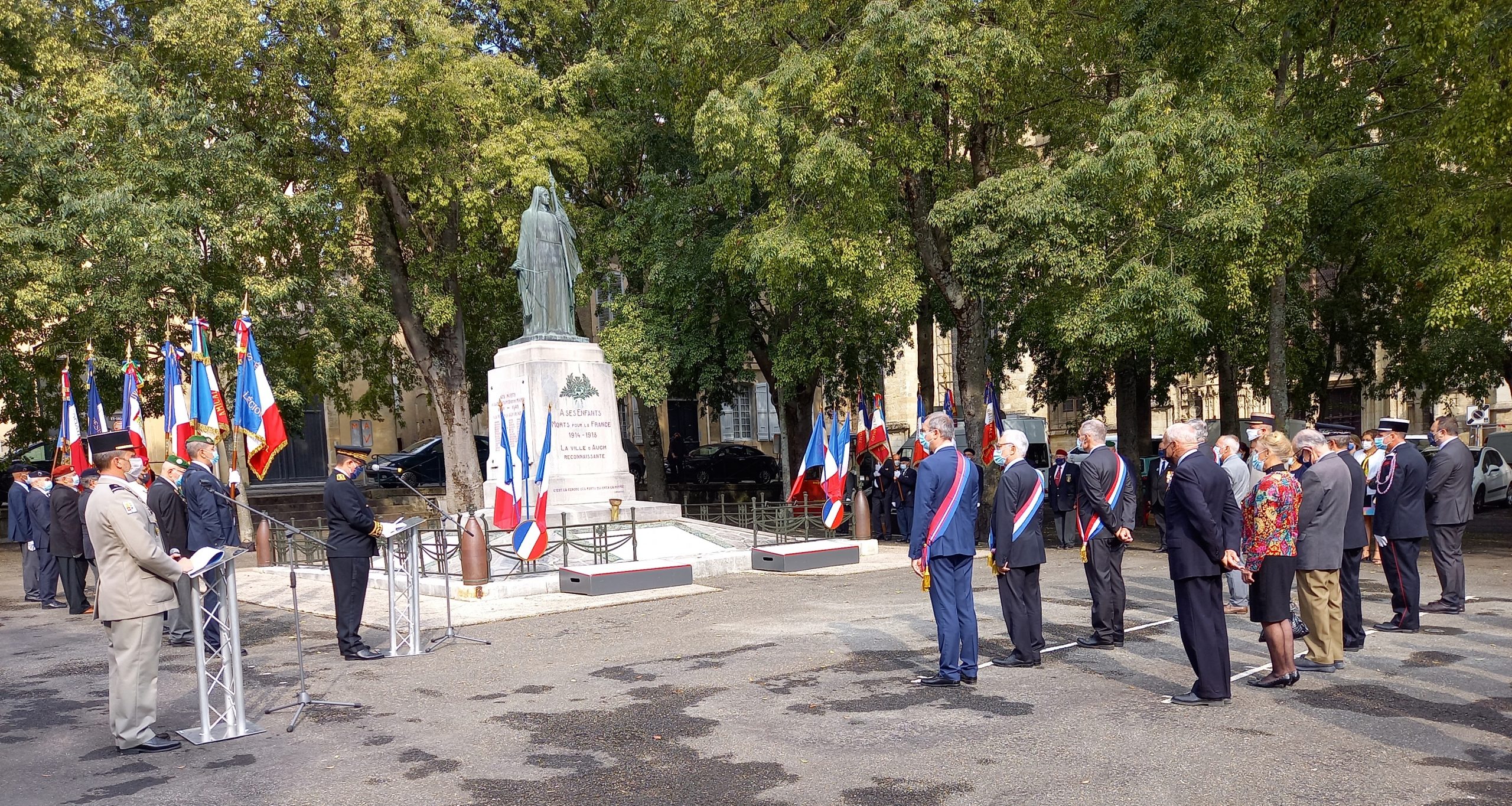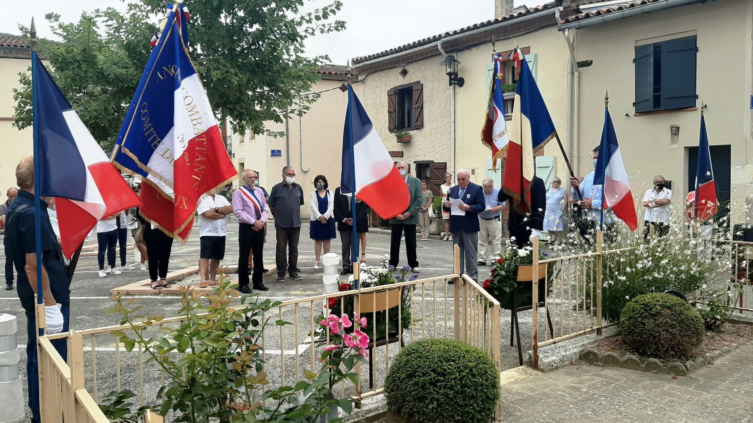 Cérémonie devant le monument aux Morts de Caignac (Haute-Garonne) à laquelle le comité du Souvenir Français du Lauragais a participé au mois d’août 2021, en présence du maire de la commune, des élus locaux, des autorités civiles et militaires, et des représentants d’associations d’anciens combattants.