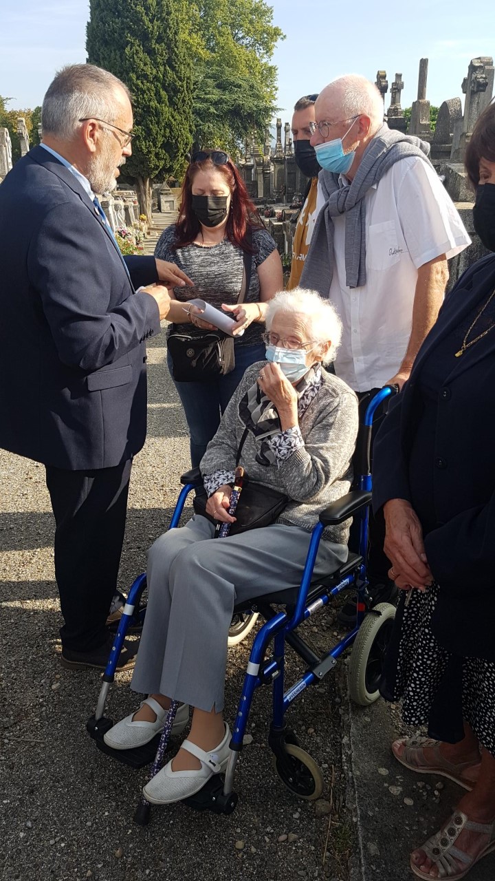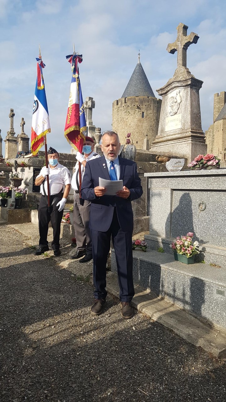 Cérémonie en hommage au gendarme André Daubercies, tué par les Allemands en août 1944, organisée par la délégation générale du Souvenir Français de l’Aude et le comité de Carcassonne au cimetière de la Cité à Carcassonne, le 18 septembre 2021, en présence de la famille Daubercies, des autorités civiles et militaires et des élus locaux.