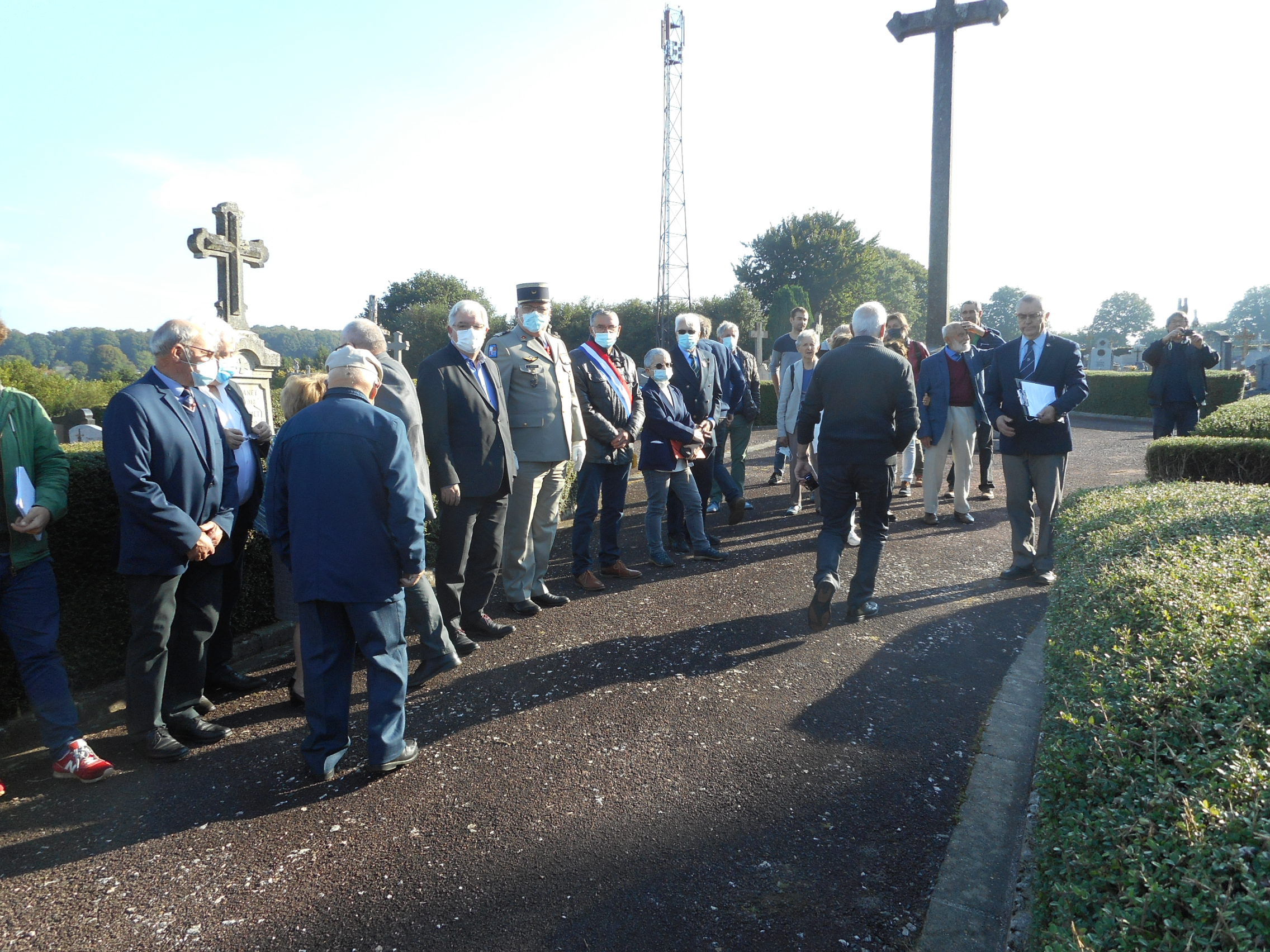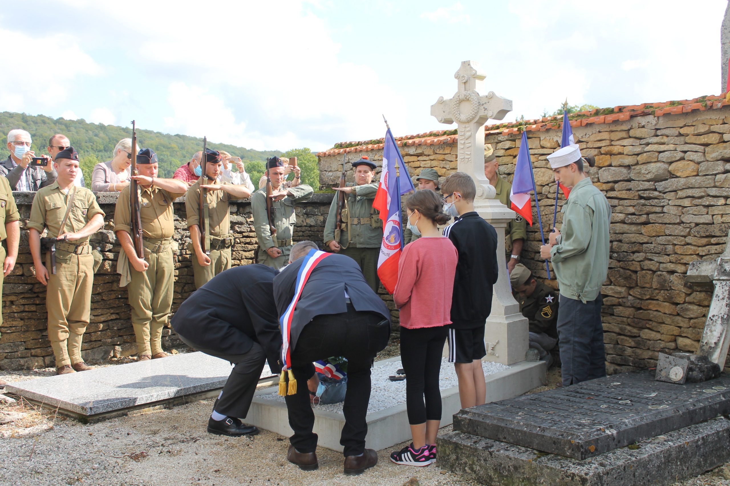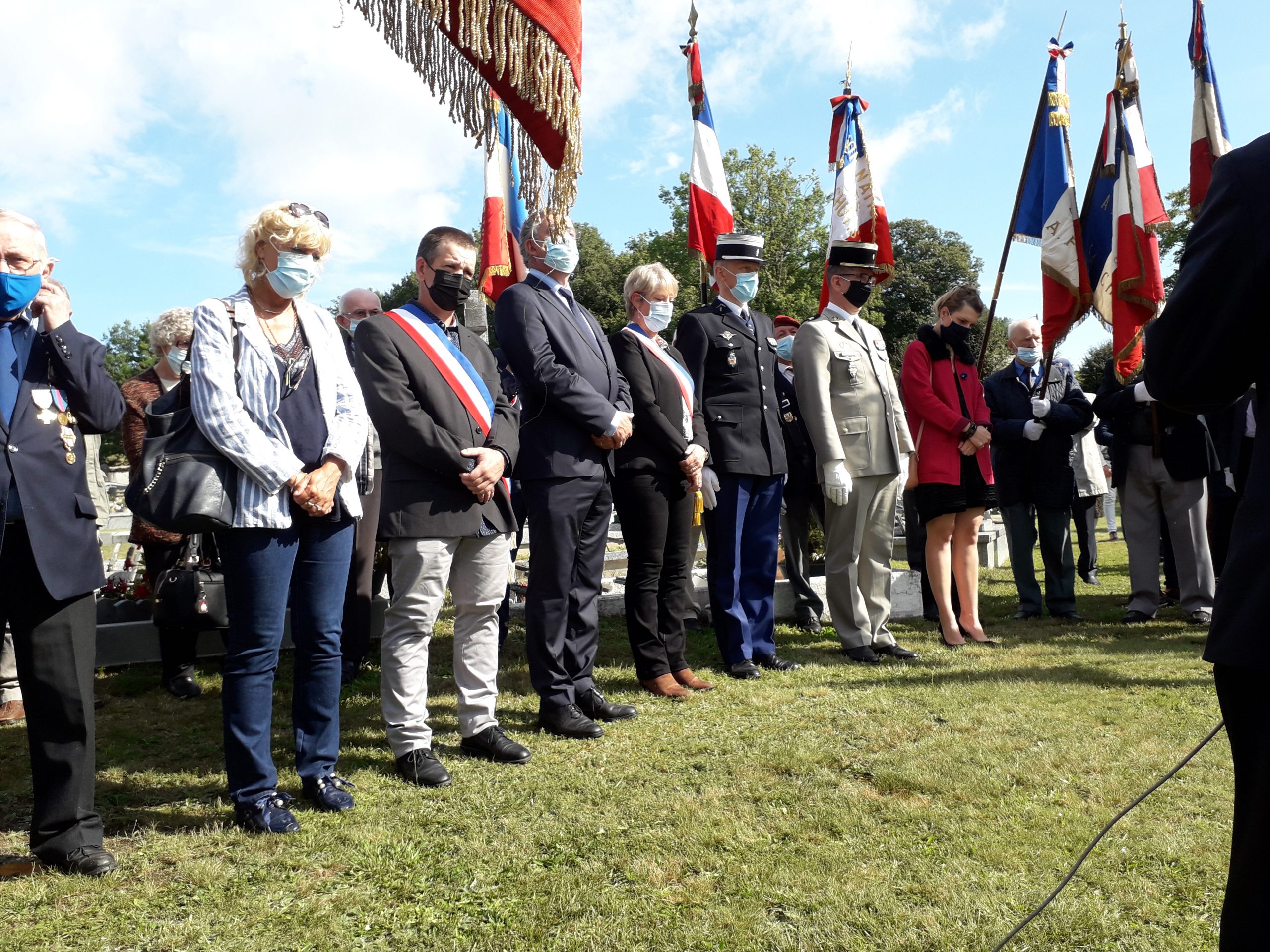 Cérémonie en hommage à deux combattants morts au combat durant la Bataille de France, organisée par la mairie de Leucamp (Cantal) et le comité du Souvenir Français, le 18 septembre 2021, au cimetière de la commune.