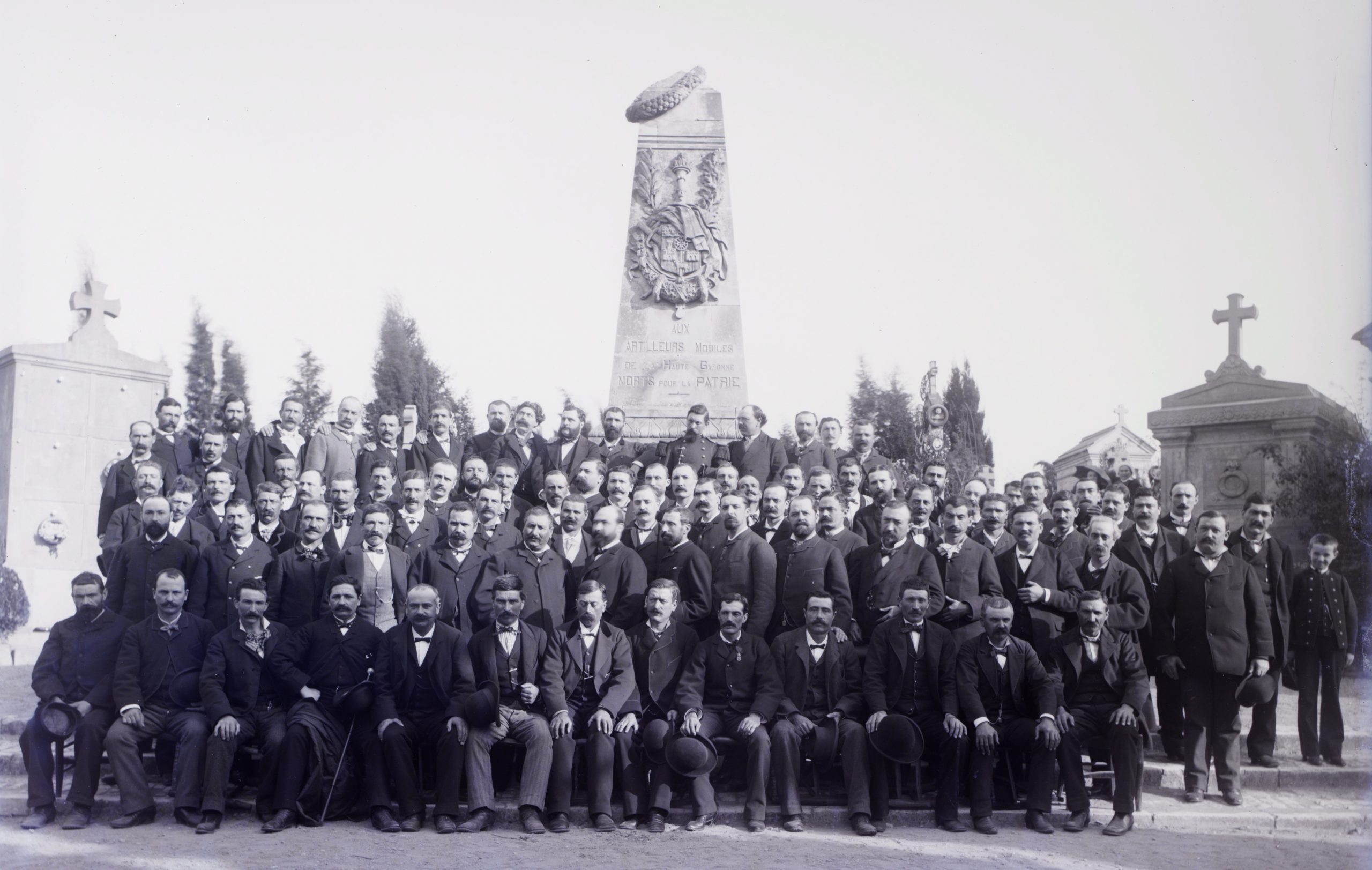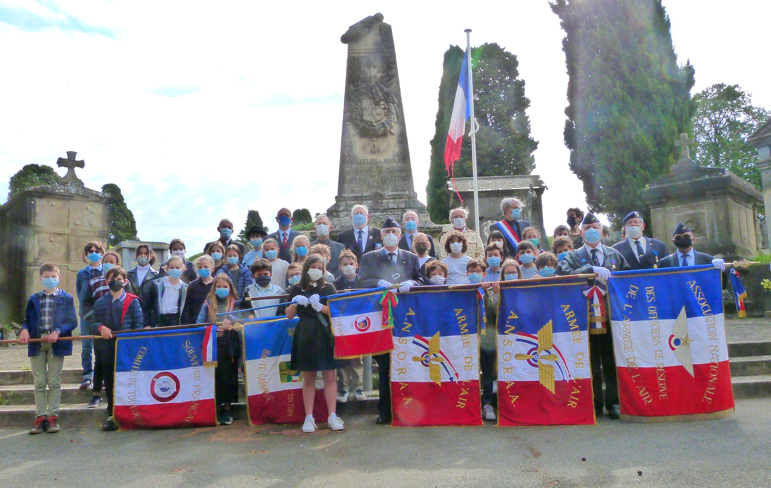 Cérémonie en hommage aux tirailleurs toulousains de 1870 devant le monument érigé à leur mémoire au cimetière de Terre-Cabade à Toulouse, le 8 septembre 2021. Le comité du Souvenir Français de Toulouse (Haute-Garonne) a choisi de reproduire la photo prise en 1884 avec les survivants des combats, avec des élèves du Caousou.
