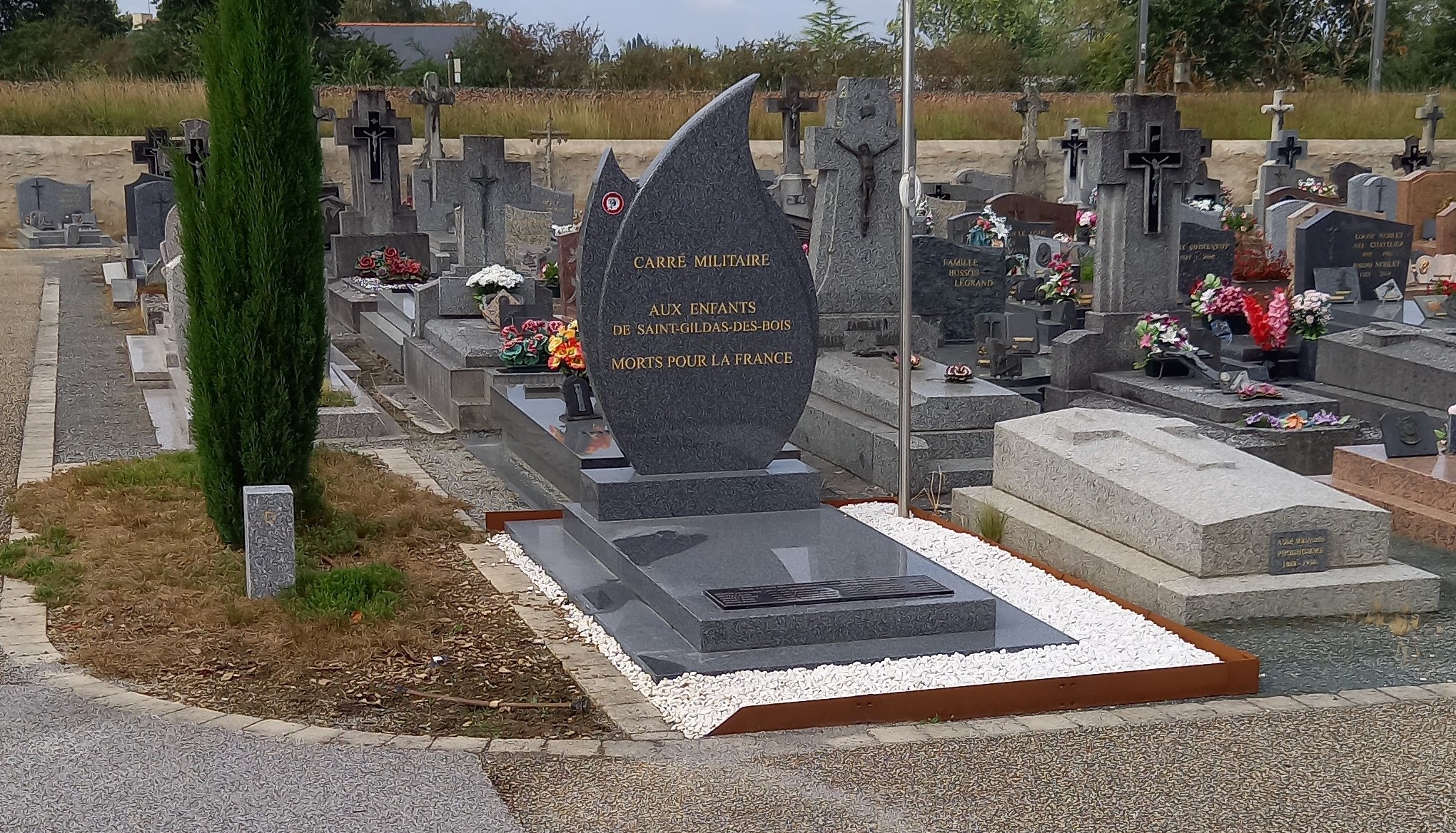 Inauguration du carré militaire de Saint-Gildas-des-Bois au cours d’une cérémonie d’hommage aux 15 « Morts pour la France » de ce cimetière de Loire-Atlantique, en présence du comité de Pontchateau, le 25 septembre 2021. La création de ce carré militaire est à l’initiative du comité du Souvenir Français.