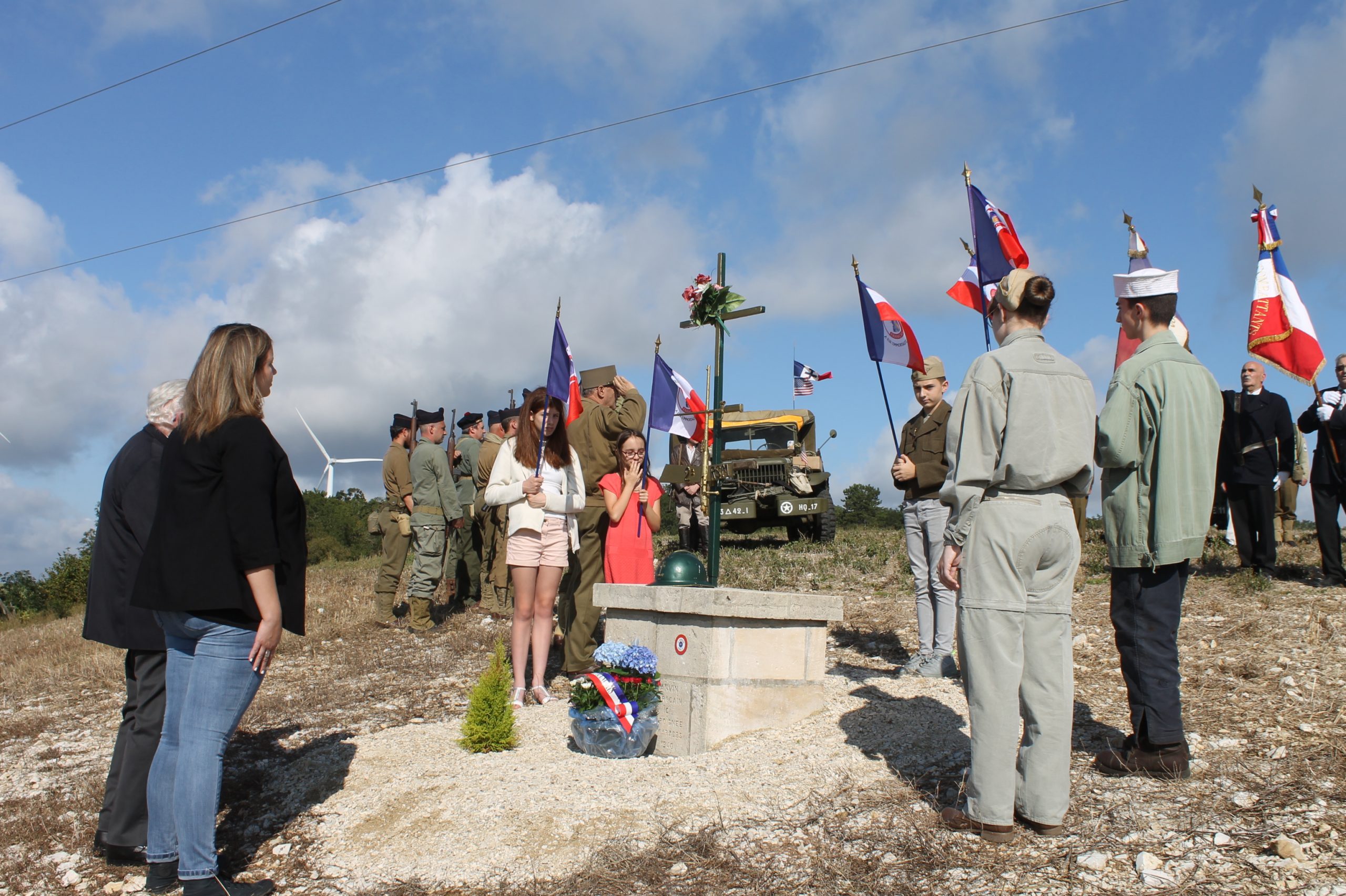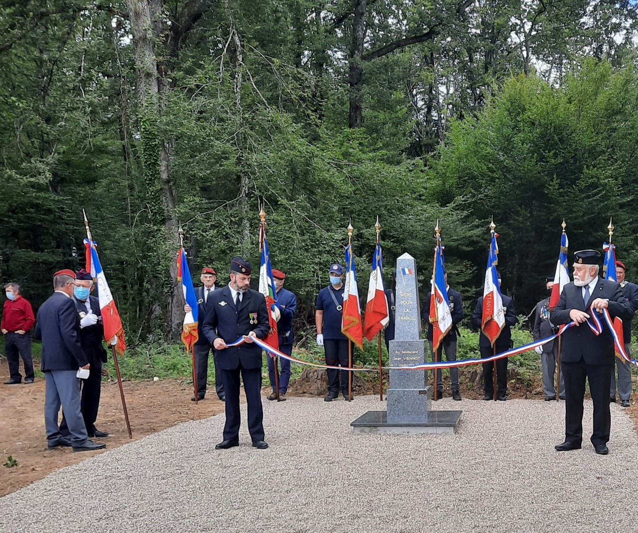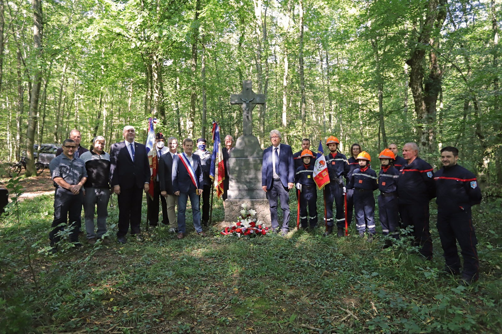 Cérémonie d’inauguration de la stèle Jean Cornet au lieu-dit le Grand Saucois à Cromary (Doubs), récemment rénovée par le Souvenir Français, en présence des élus locaux, des adhérents du Souvenir Français, le 5 septembre 2021.