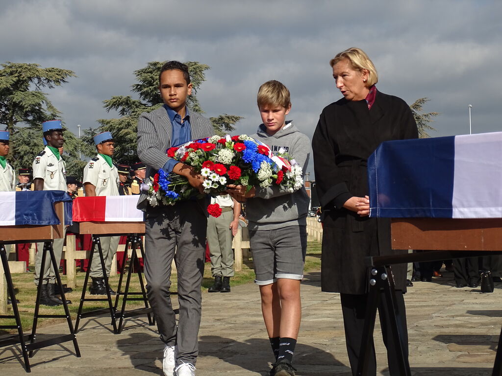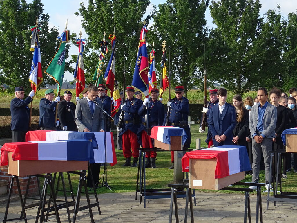 Cérémonie d’inhumation de 9 poilus inconnus à la nécropole de Saint-Charles-de-Potyze (Ypres en Belgique) organisée le 23 septembre 2021, en présence de Madame l’Ambassadrice de France, de nombreux comités du Souvenir Français de la Belgique et du nord de la France, et d’une classe de primaire d’Ypres et une classe de 3ème du Lycée Jean Monnet de Bruxelles.