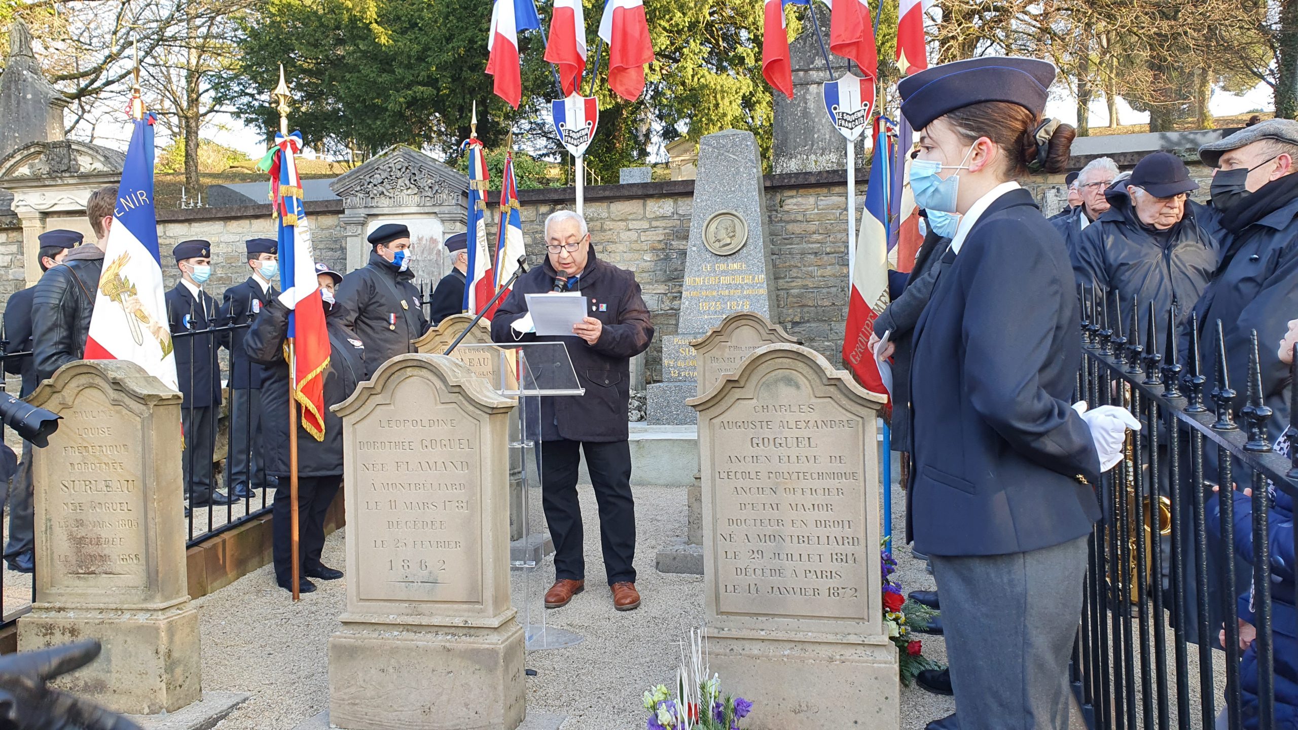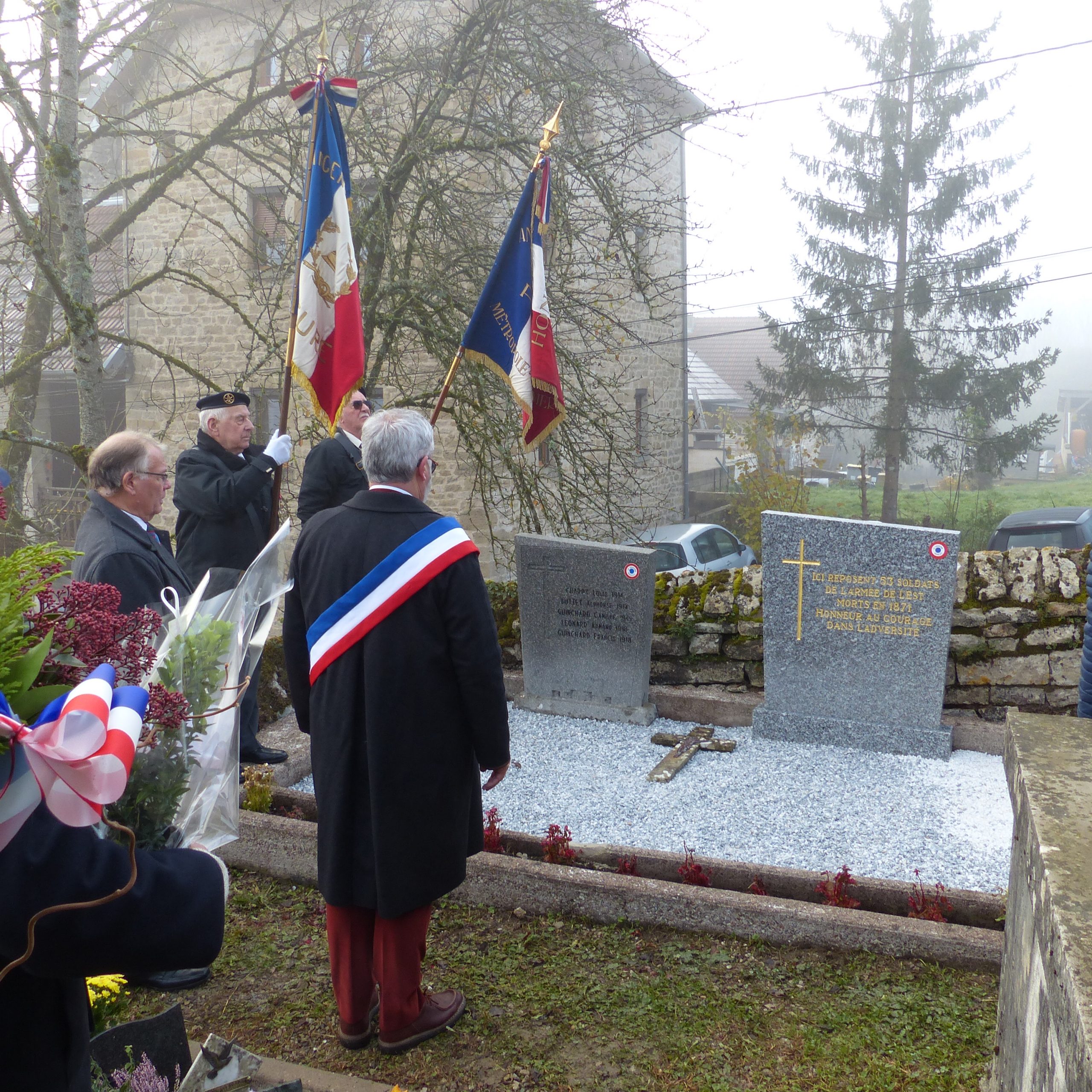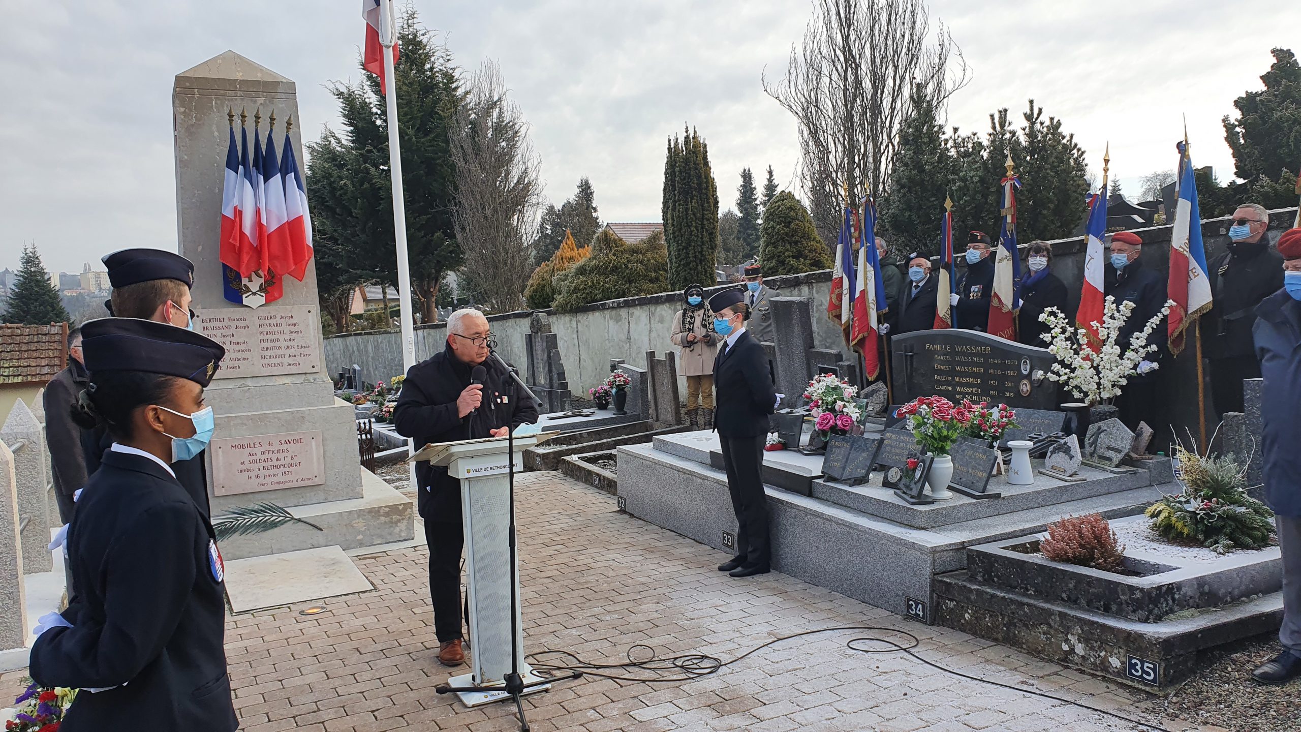 Cérémonie commémorative de la guerre de 1870-1871 à Bethoncourt (Doubs) organisée par le comité du Souvenir Français de Montbéliard le 16 janvier 2022, en présence notamment du maire de Bethoncourt et du délégué général du Souvenir Français du Doubs, et qui s’est conclue par une visite d’une exposition d’objets militaires.