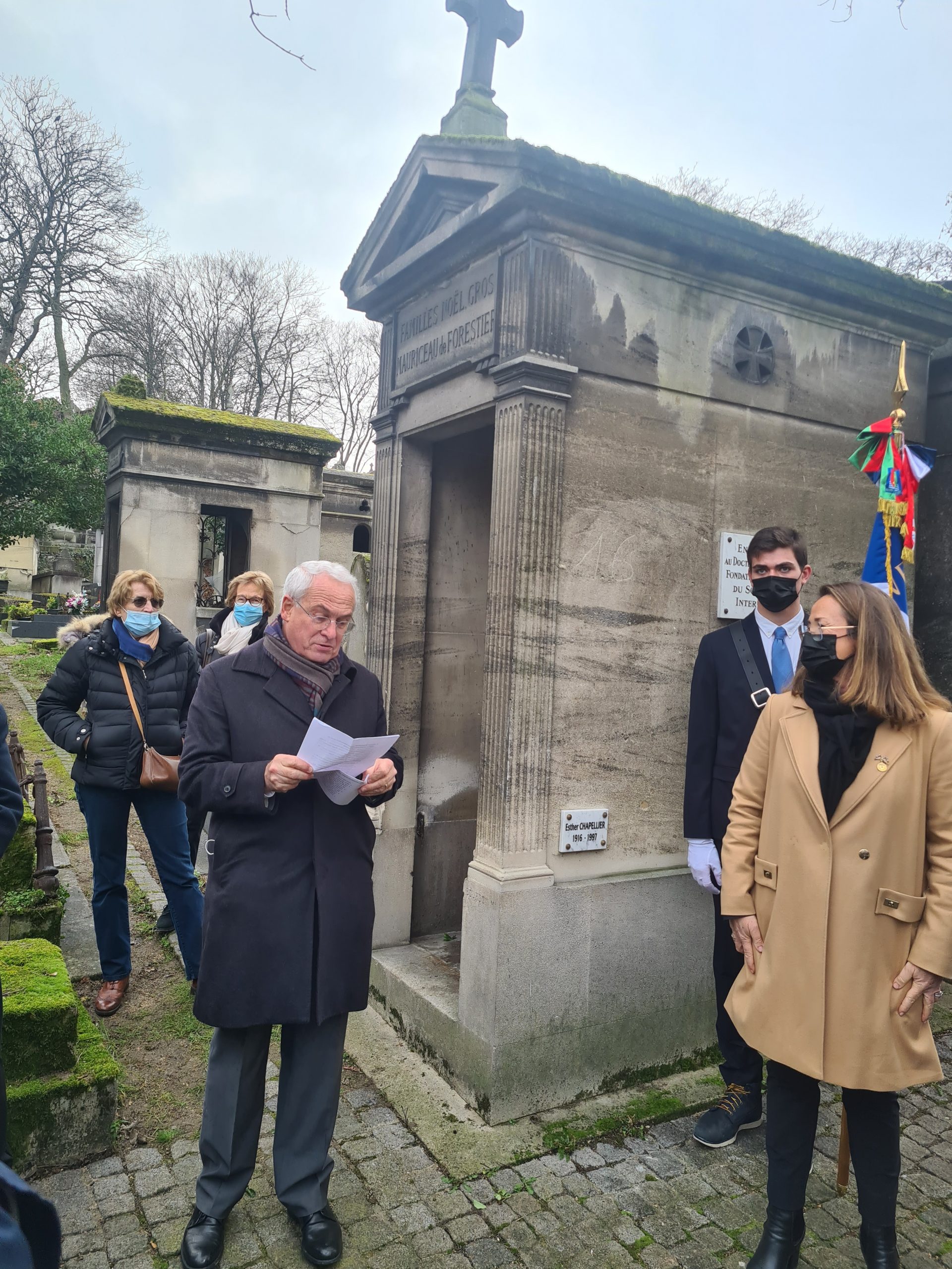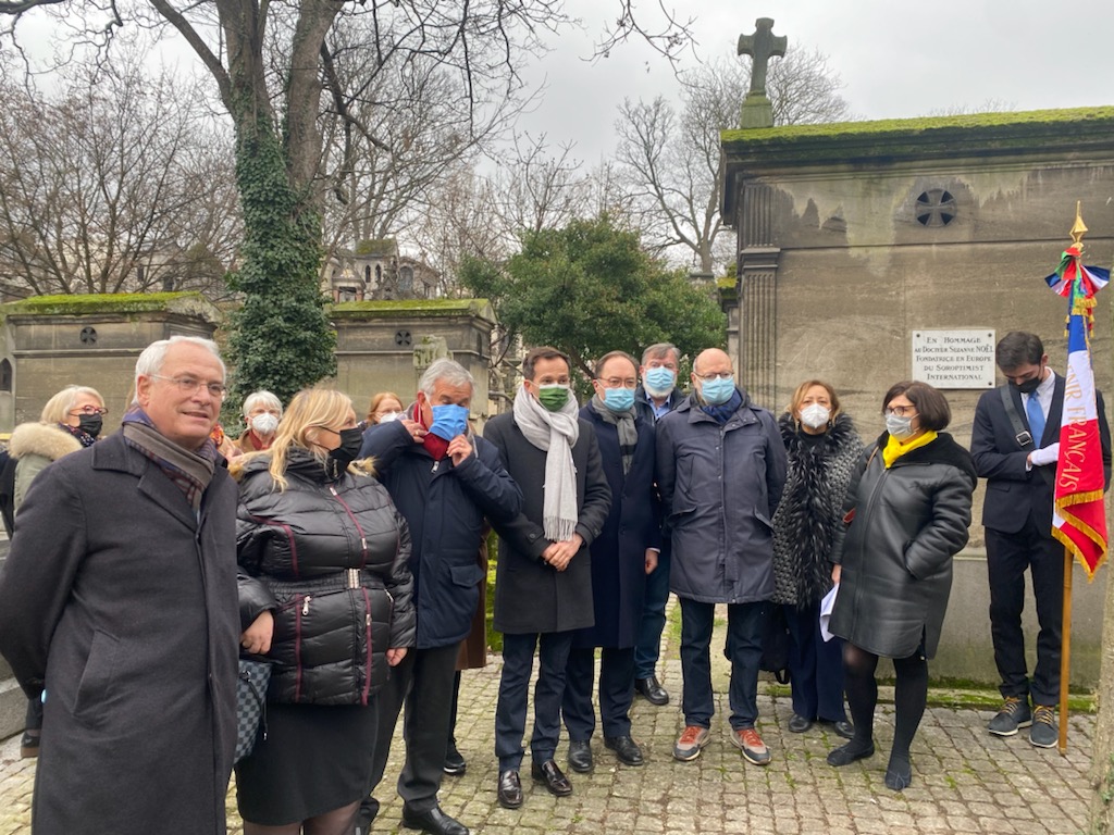 Cérémonie en hommage à Suzanne Noël, médecin pionnière de la chirurgie esthétique, membre du club Soroptimist, qui a soigné les gueules cassée durant la Grande Guerre, organisée par le Club Soroptimist Paris-Fondateur, Le Souvenir Français et les Gueules Cassées (UBFT), le 19 janvier 2022 devant la tombe de Suzanne Noël au cimetière de Montmartre, en présence notamment de Monsieur le député de Paris Pierre-Yves Bournazel, de Monsieur le Maire du 18ème arrondissement de Paris, Eric Lejoindre des présidents et d’adhérents des trois associations.