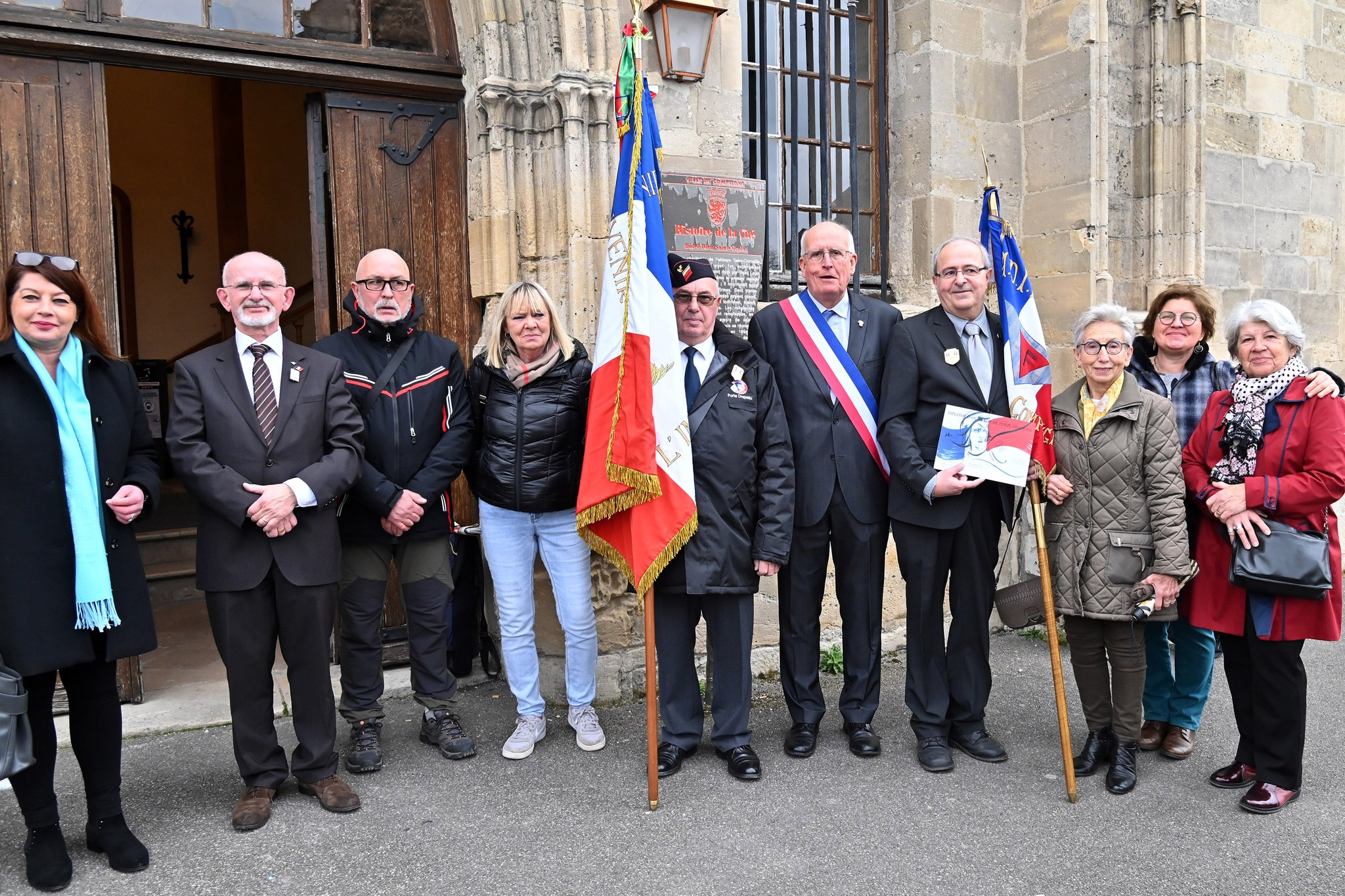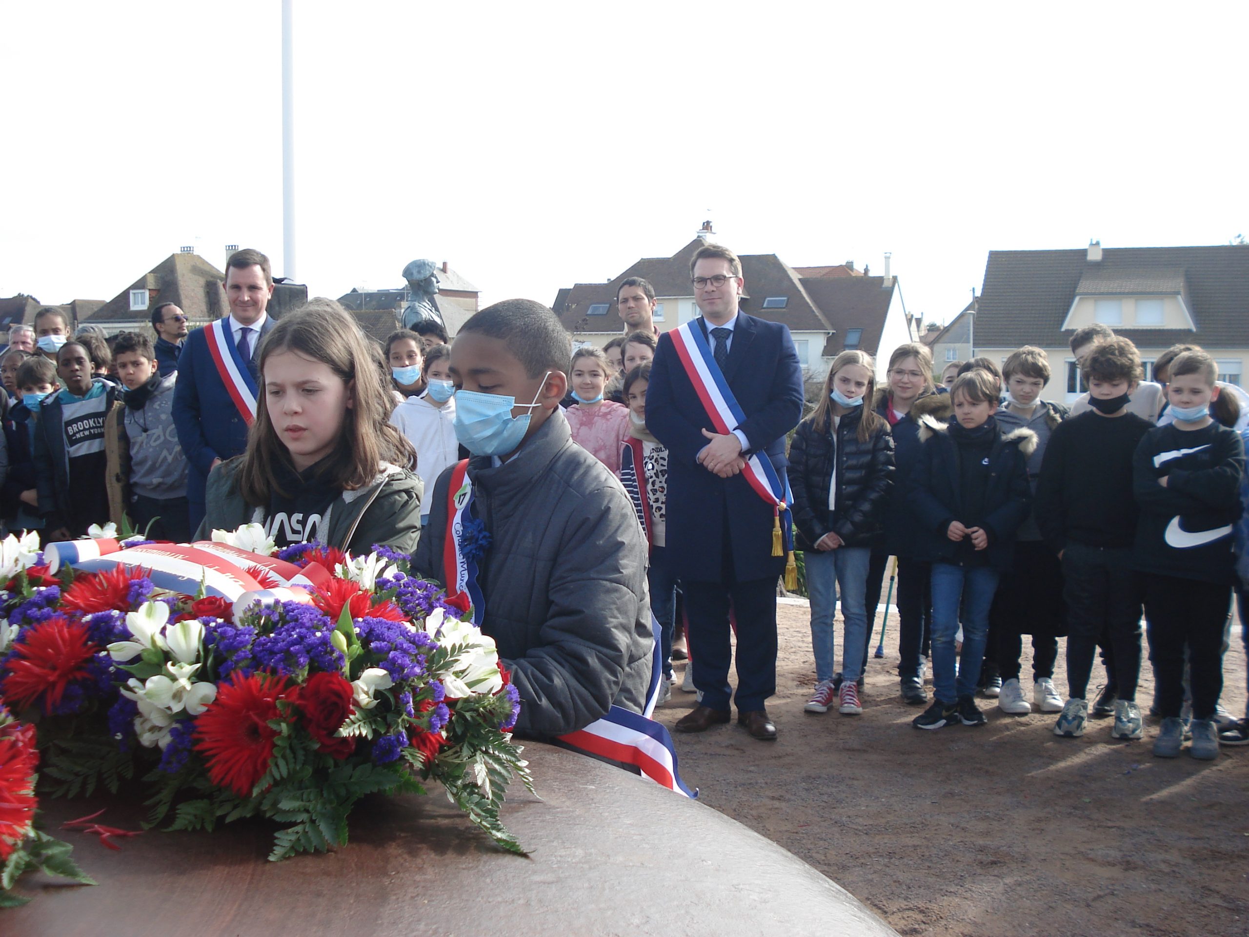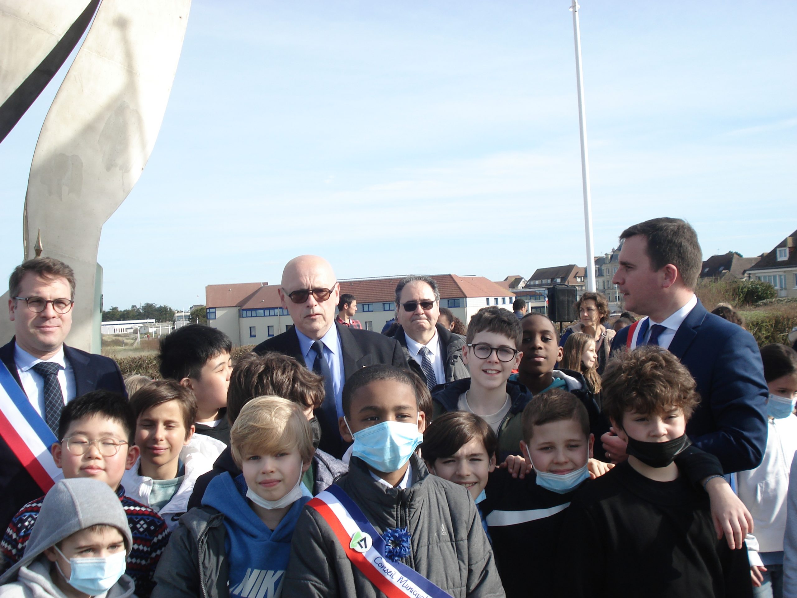 Cérémonie organisée à Ouistreham (Calvados) pour des enfants du 17ème arrondissement de Paris par les comités du Souvenir Français de Ouistreham et du 17ème arrondissement de Paris, en présence des élus locaux, du délégué général du Calvados, et du maire du 17ème arrondissement de Paris, le 14 mars 2022.