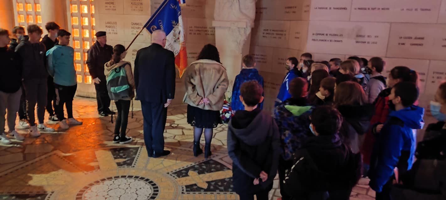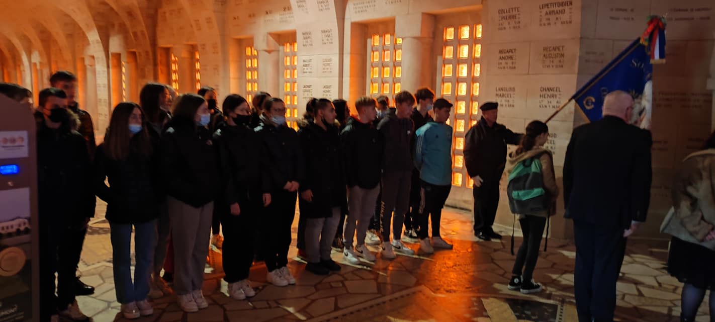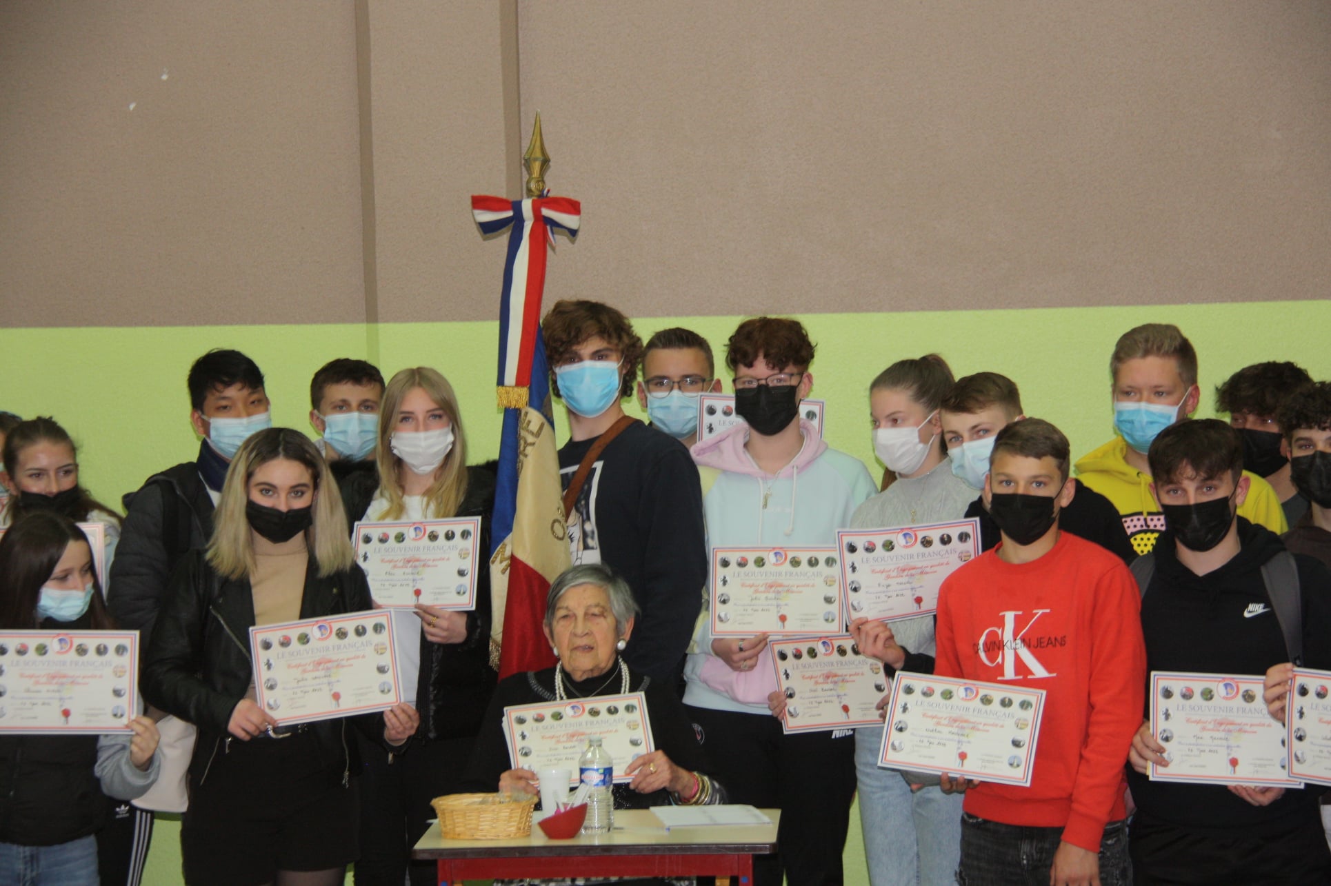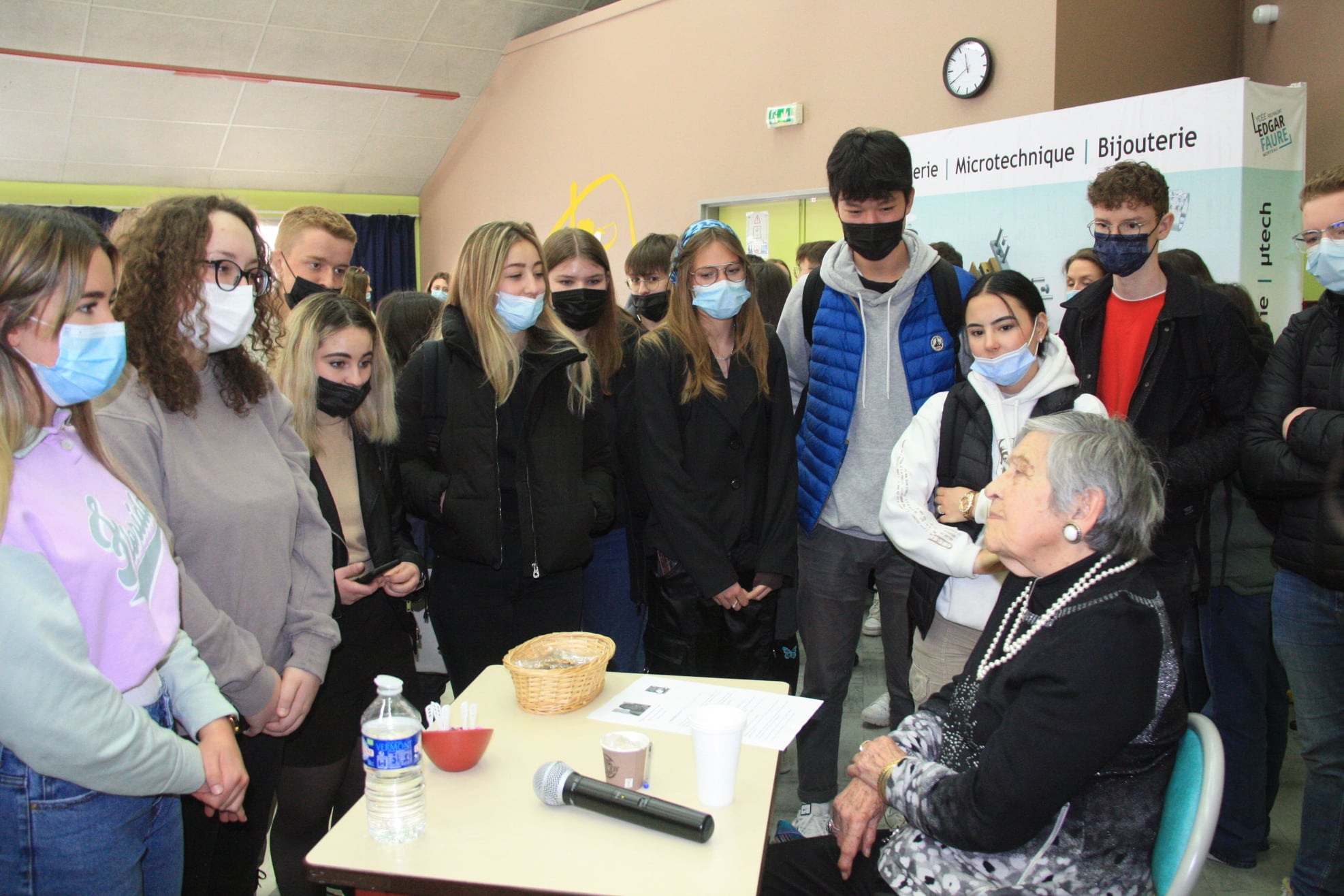 Remise des diplômes de certificat d’engagement en qualité de gardien de la mémoire du Souvenir Français pour une soixantaine de lycéens pour leur participation à la quête nationale du 1er novembre 2021, et des actions mémorielles conduites avec le comité du Souvenir Français de Morteau (Doubs) tout au long de l’année, par Ginette Kolinka, qui témoignait ce jour-là au lycée Morteau, le 11 avril 2022.