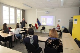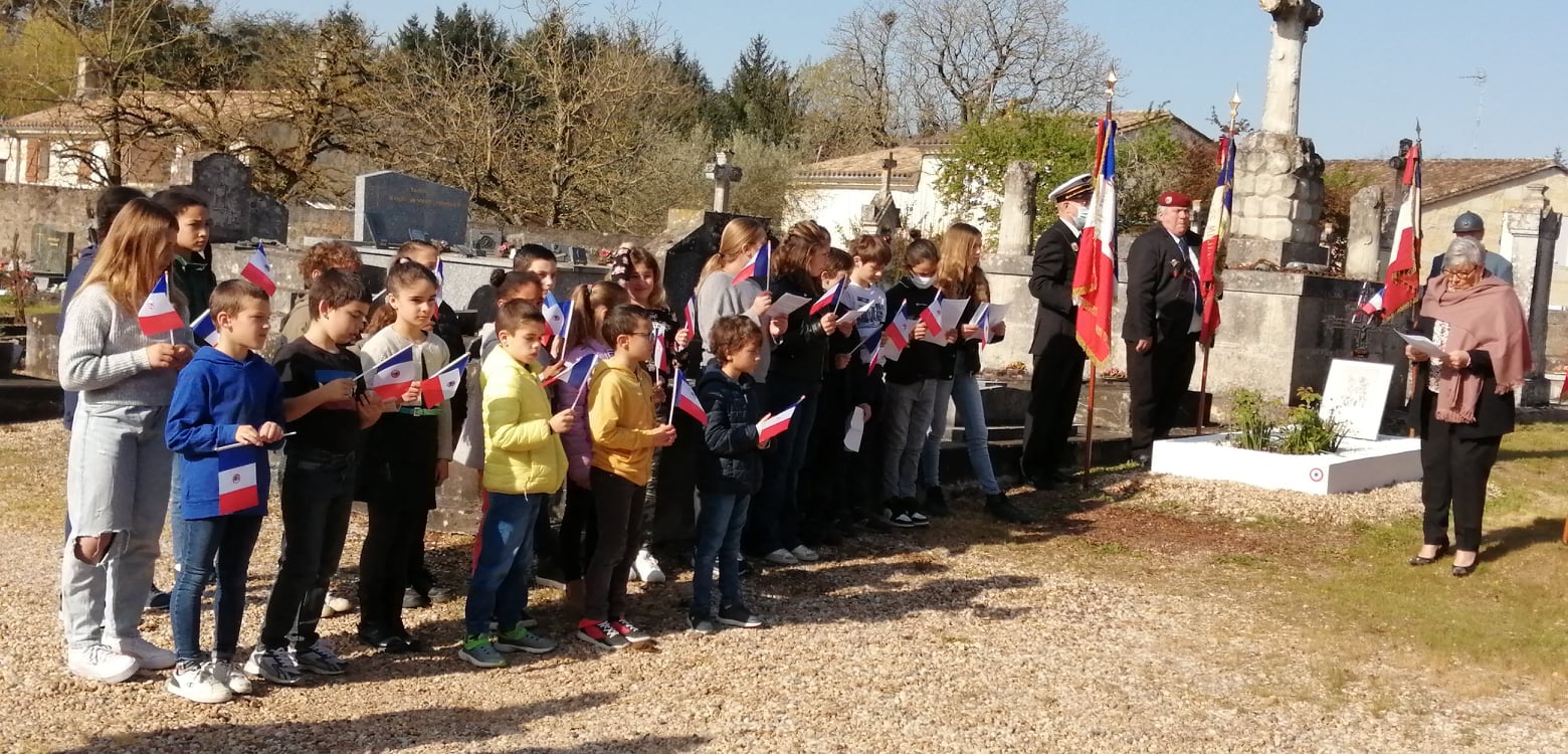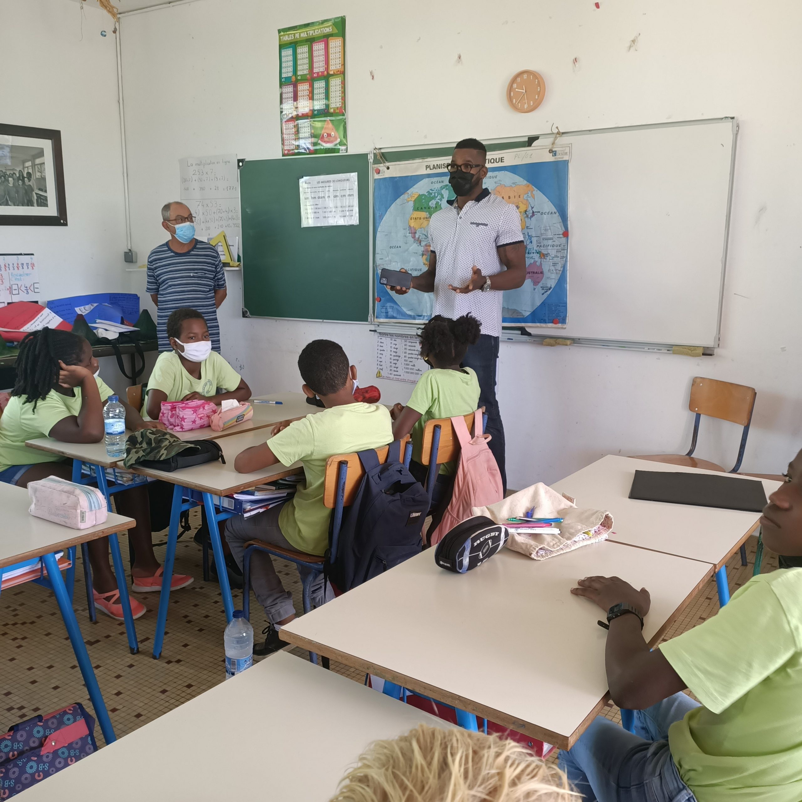 Intervention du comité du Souvenir Français de Basse-Terre (Guadeloupe) dans une classe de CM2 d’une école primaire de la commune pour sensibiliser les enfants au devoir de mémoire, et sur le patrimoine mémoriel après les récentes dégradations des Monuments aux Morts dans les départements d’Outre-Mer, le 1er avril 2022.