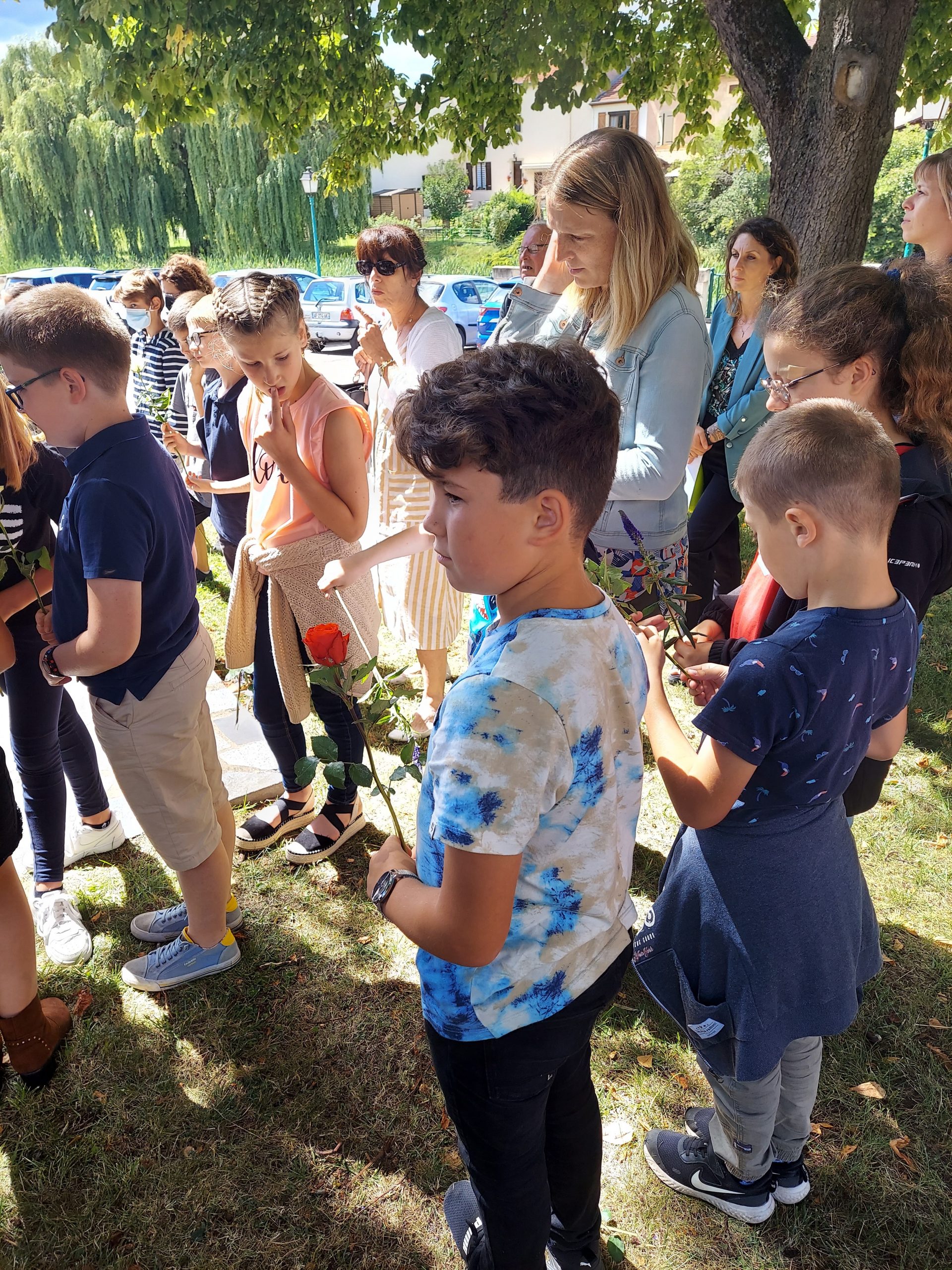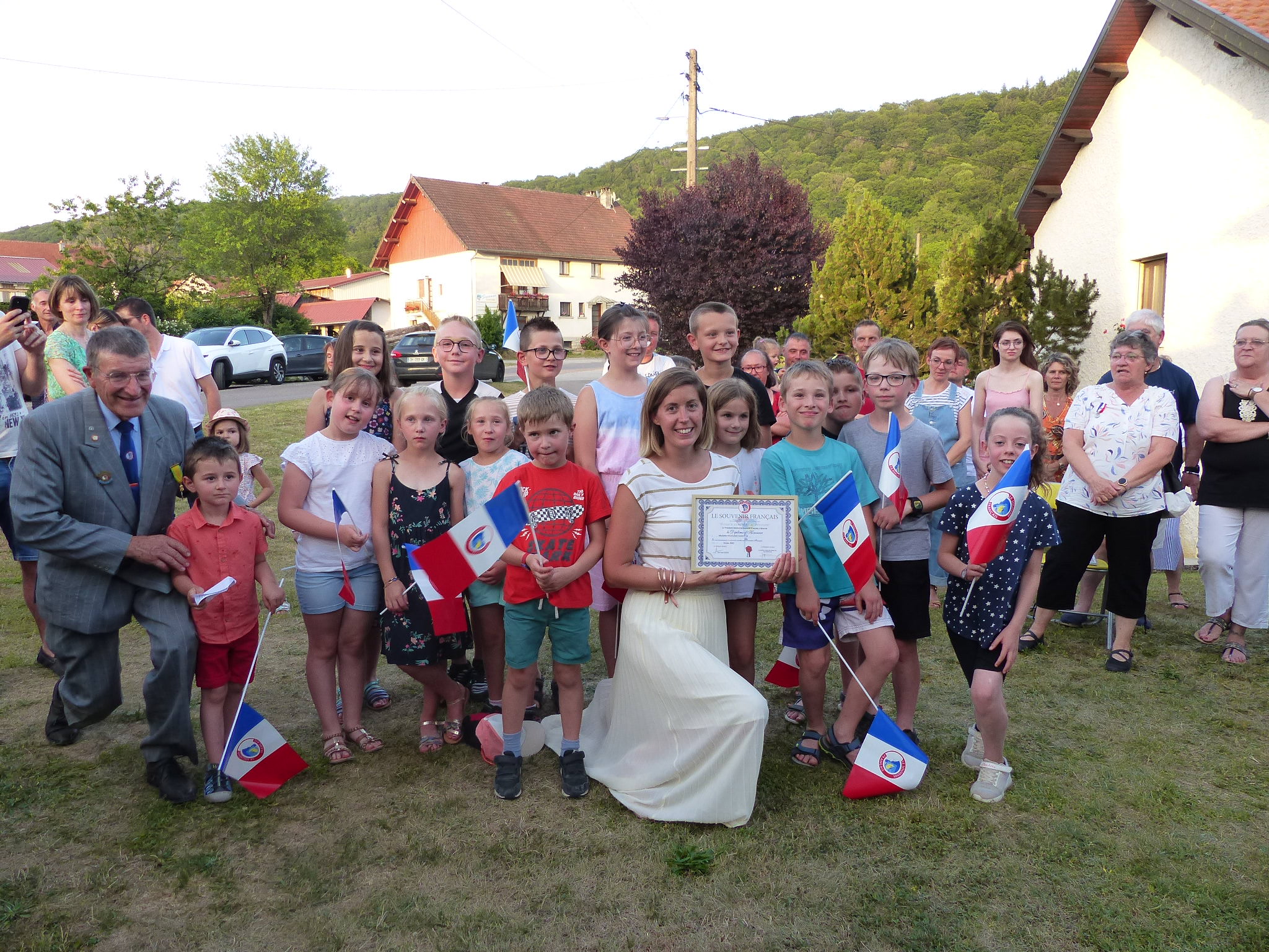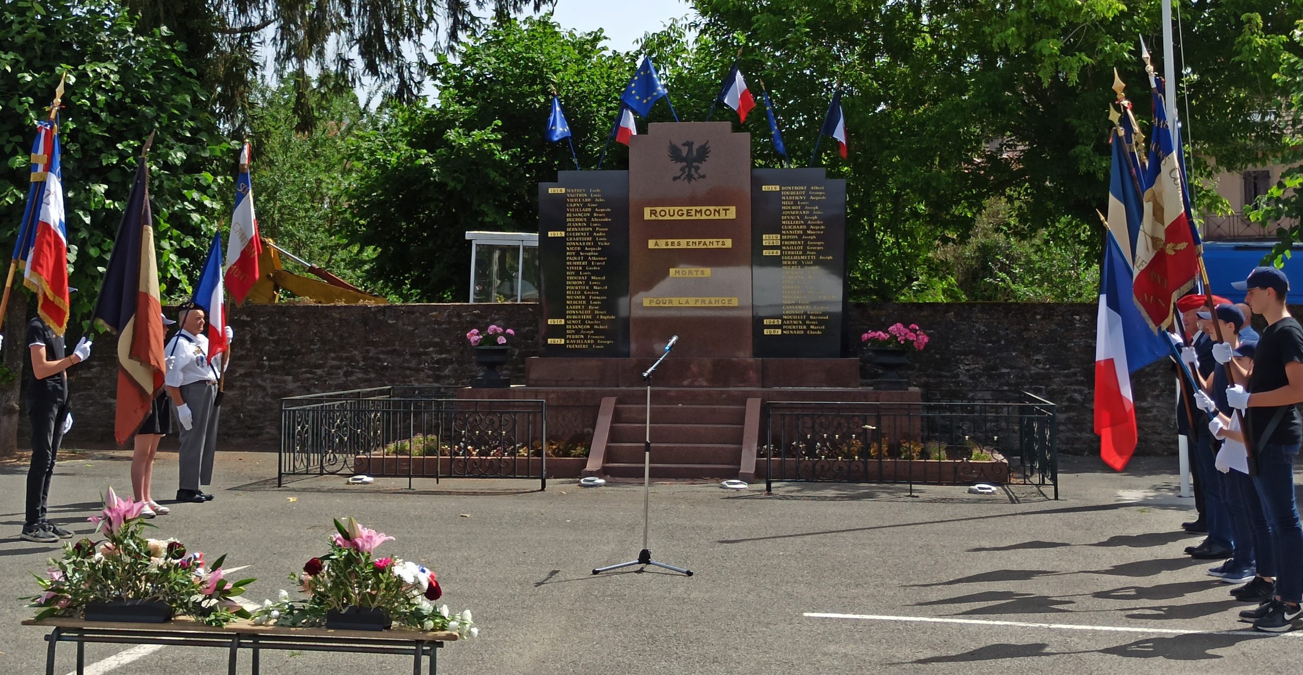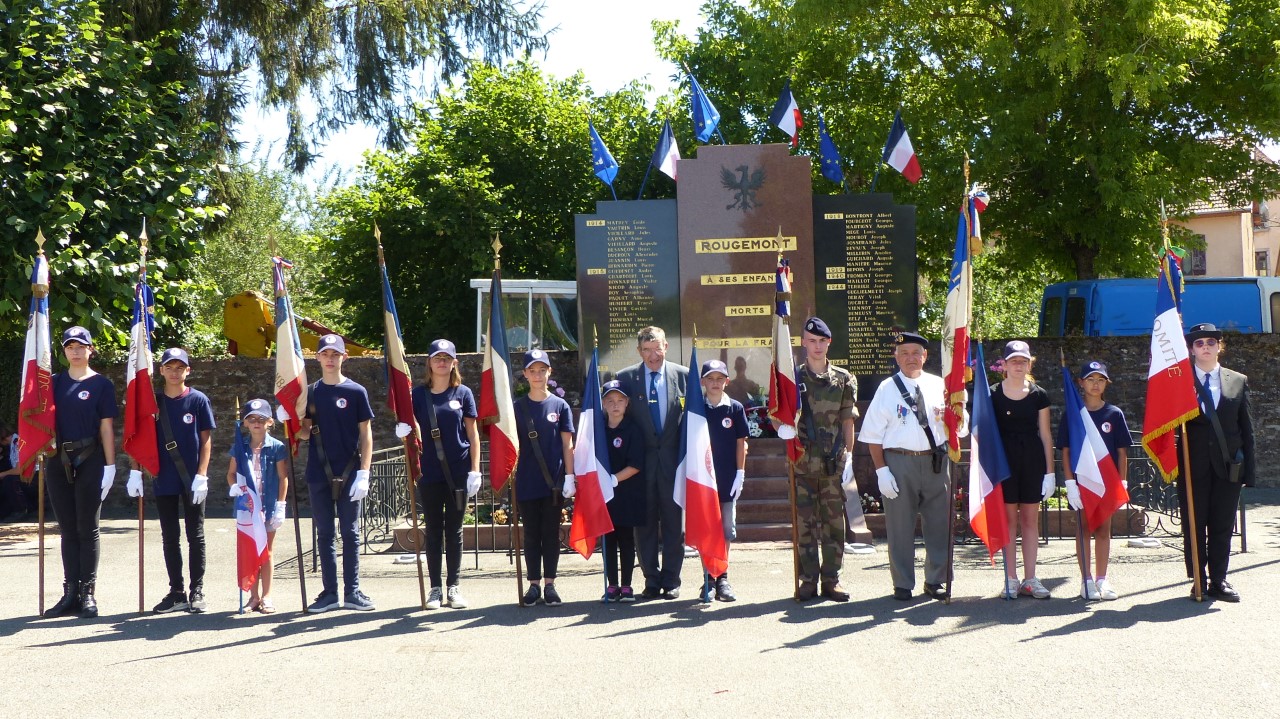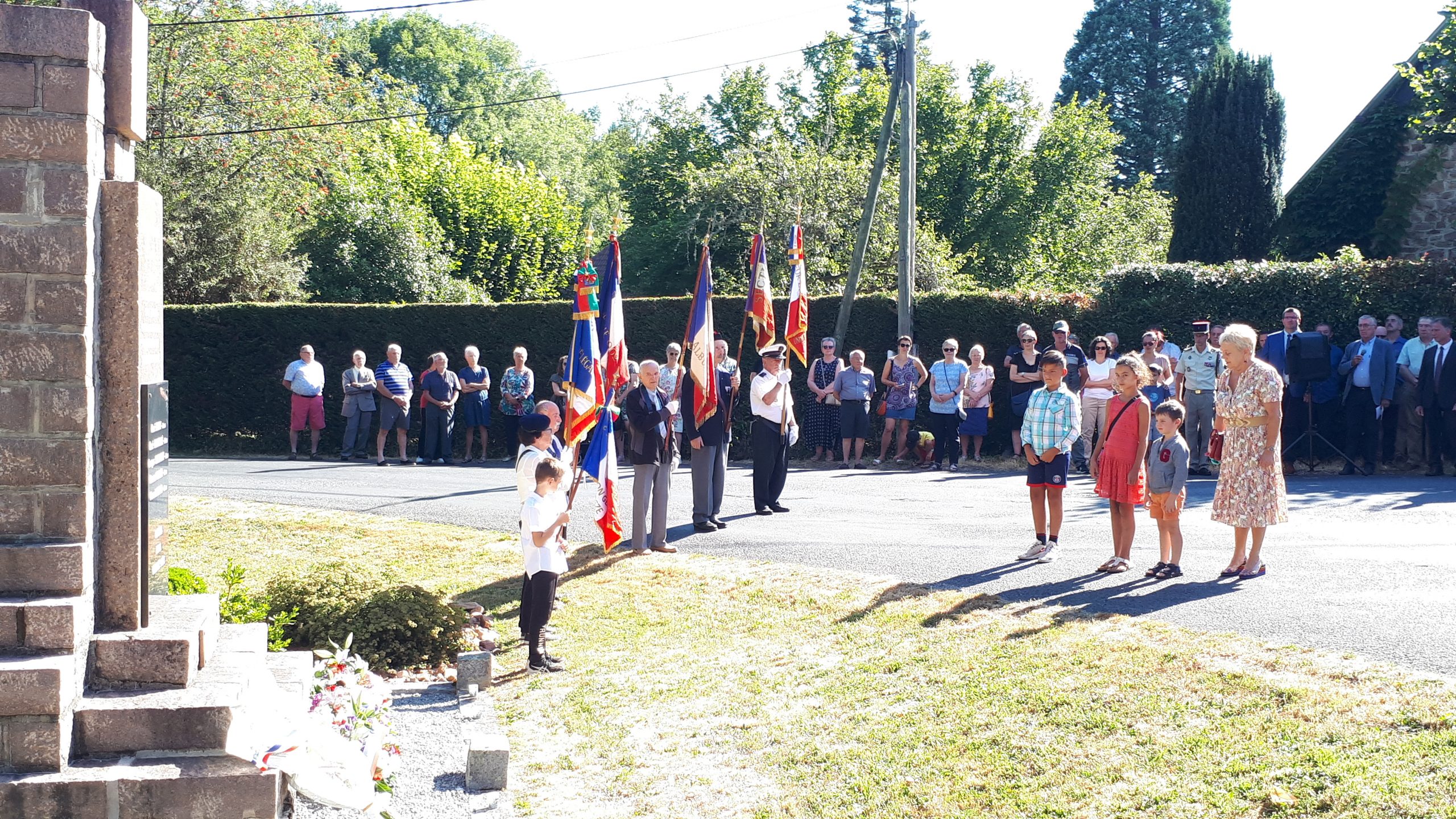 Cérémonie au monument des 32 victimes militaires décédées le 18 juin 1940, à Aïssey, organisée par le comité de Baume-les-Dames-Rougemont (Doubs), en présence des arrière-petits-enfants de l’épouse du maire du village tuée également le 18 juin 1940, des autorités et des élus locaux, des élèves de l’école primaire de la commune et des porte-drapeaux du comité de Roulans, le 18 juin 2022.
