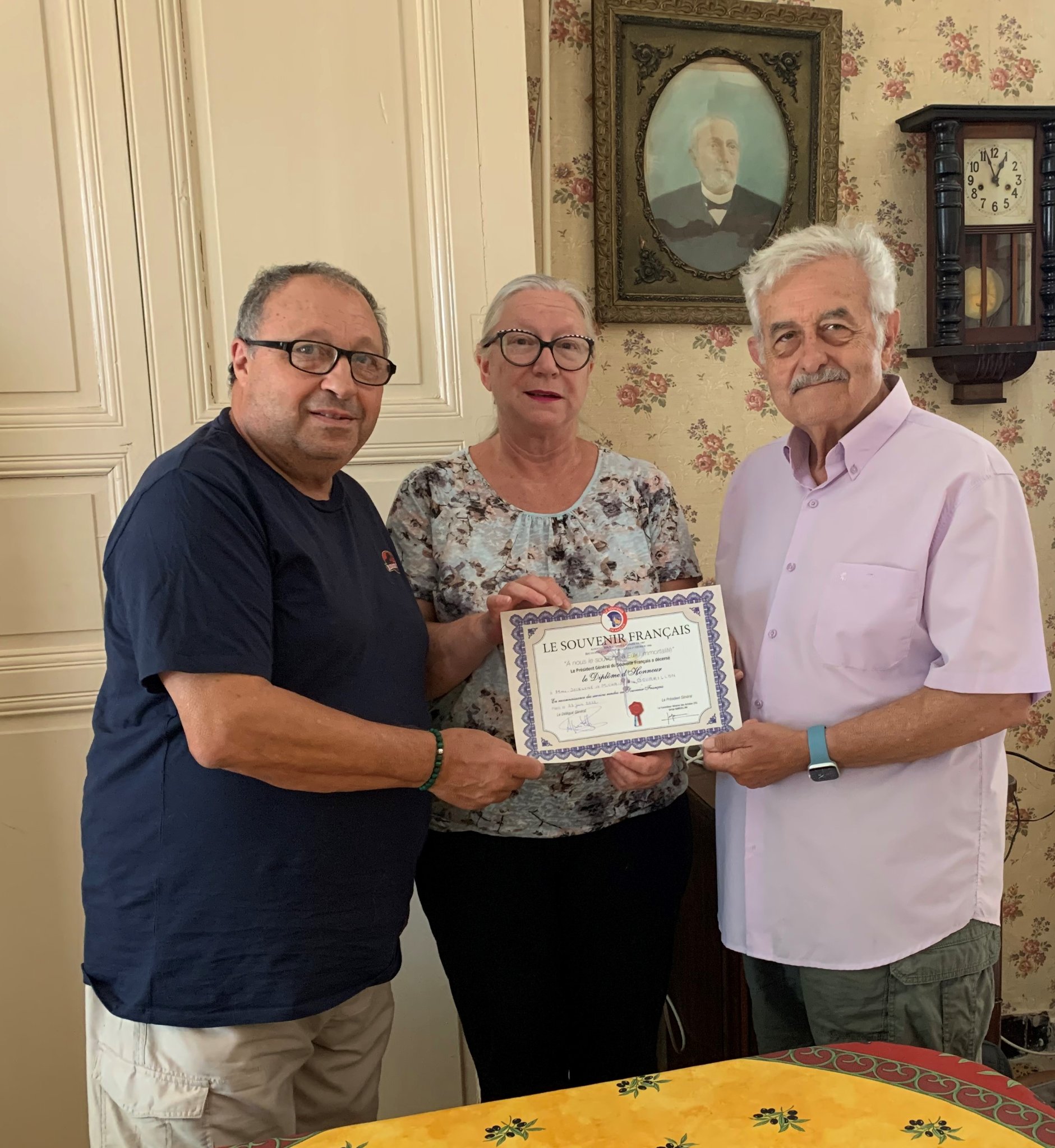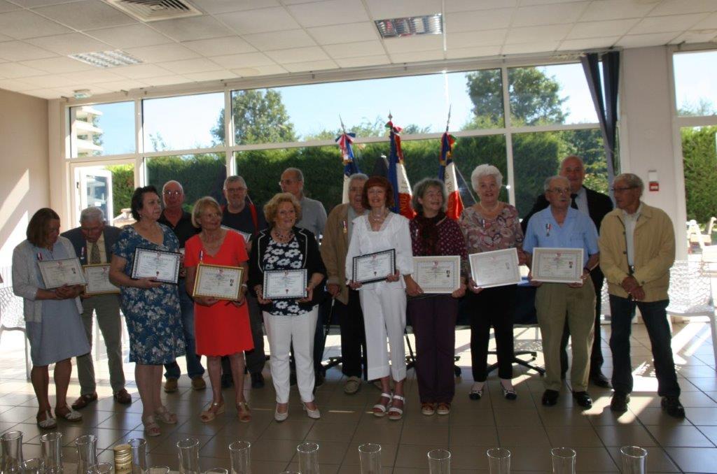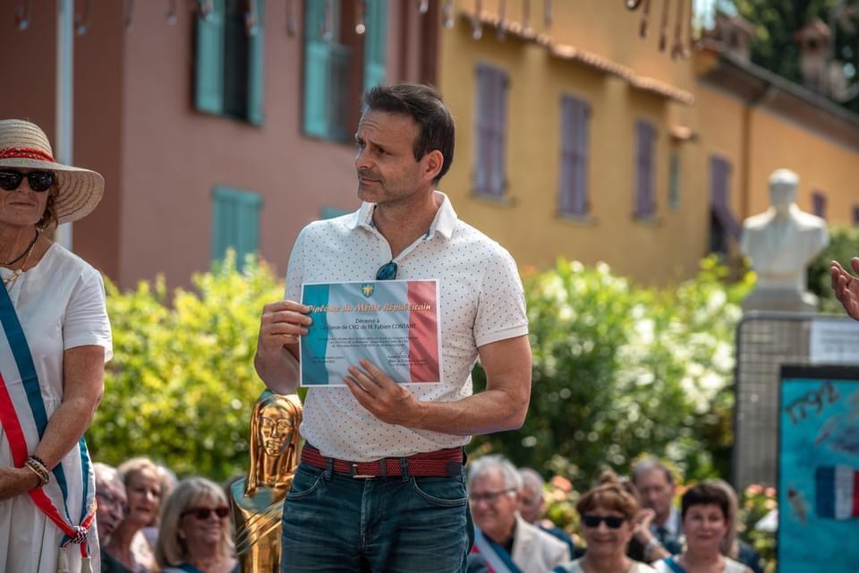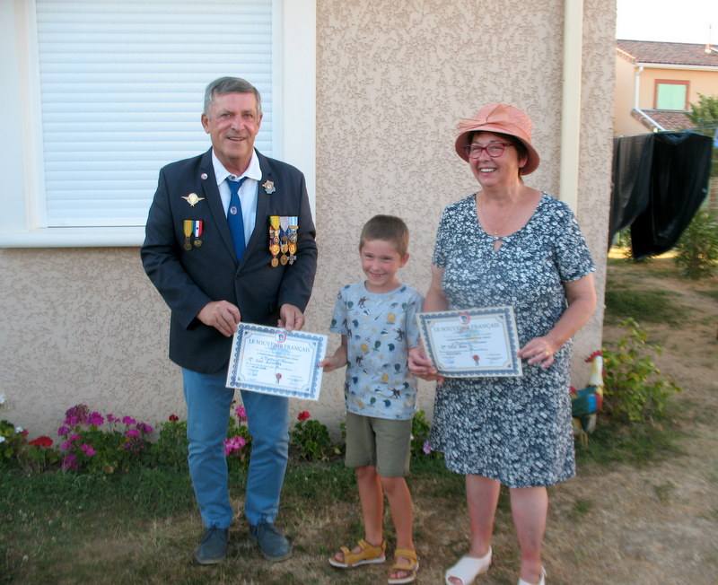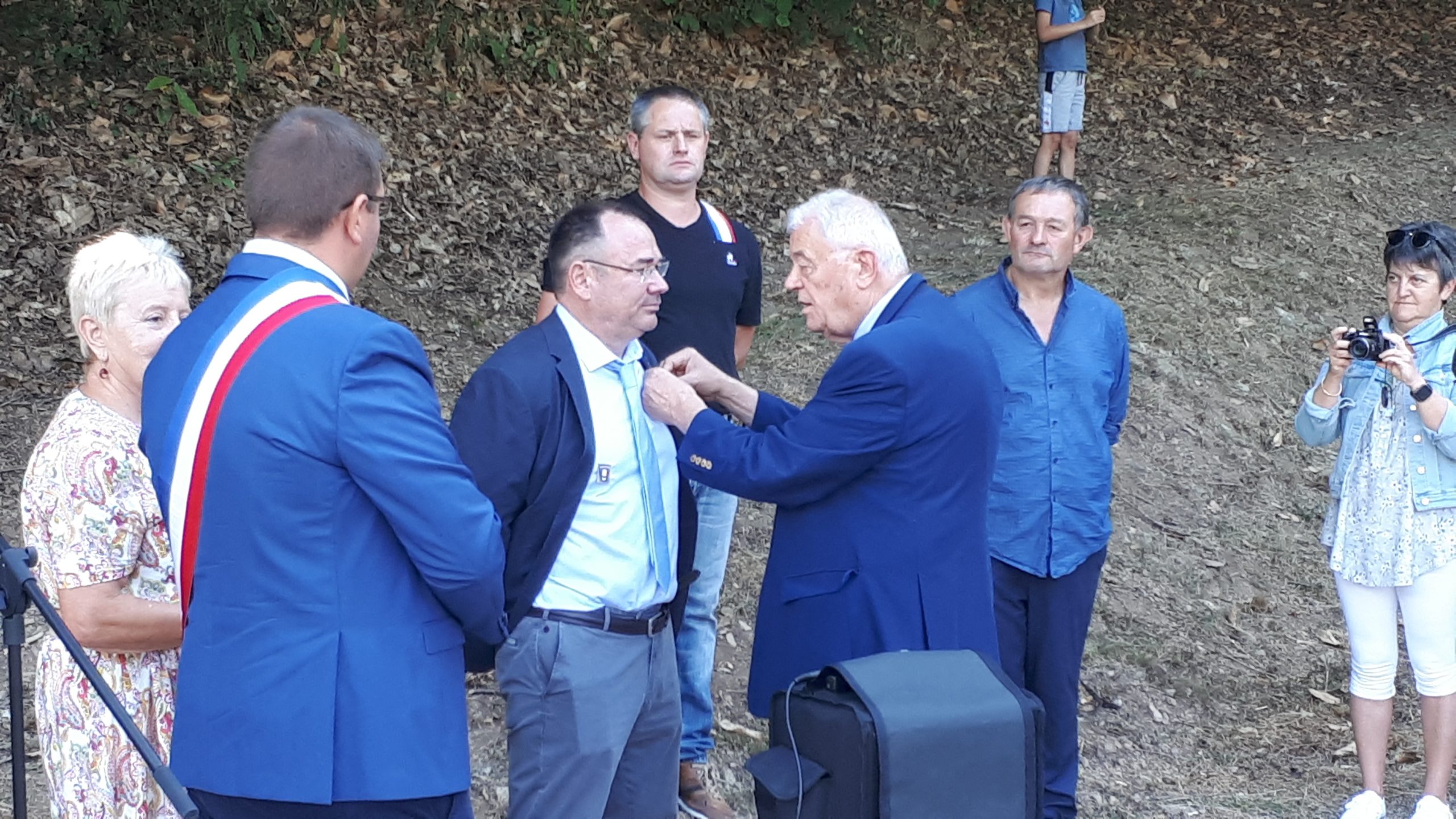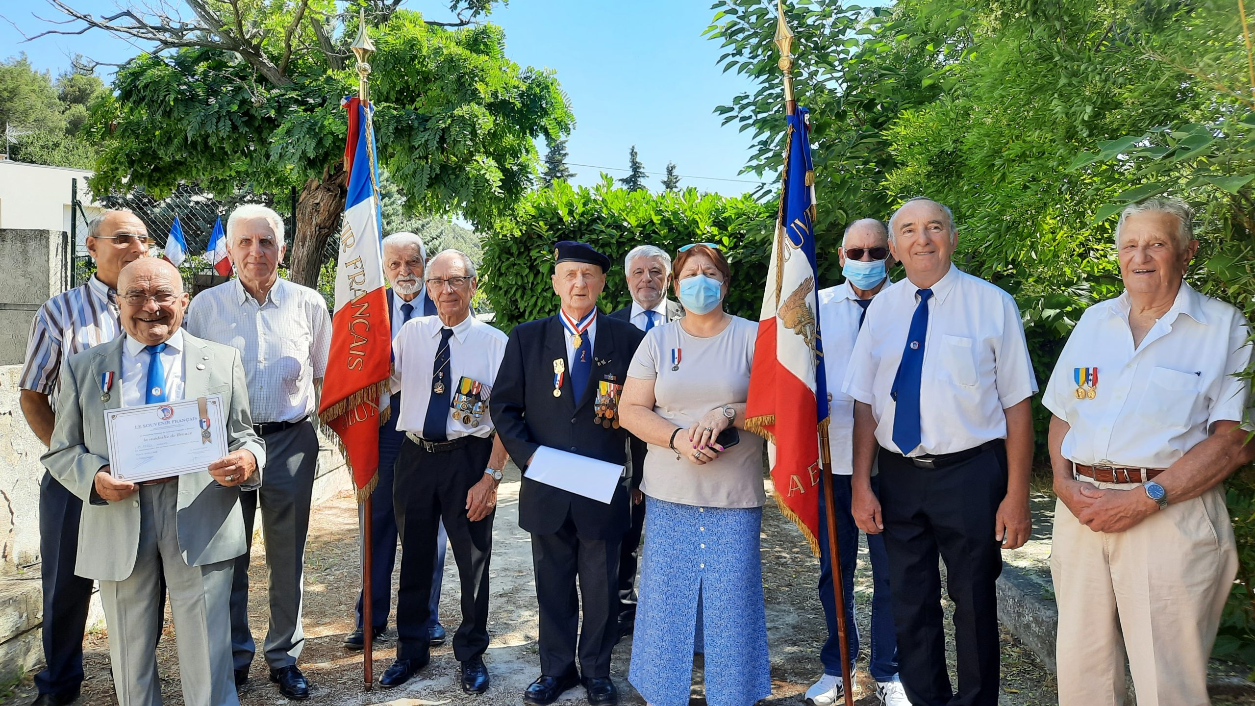 Remise de récompenses par le président du comité de Carnoux (Bouches-du-Rhône) à des adhérents du comité, le 9 juillet 2022, en présence notamment des élus locaux et du délégué général du département. Une cravate du Souvenir Français, la plus haute distinction de l’association a notamment été remise au porte-drapeau du comité.