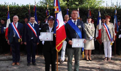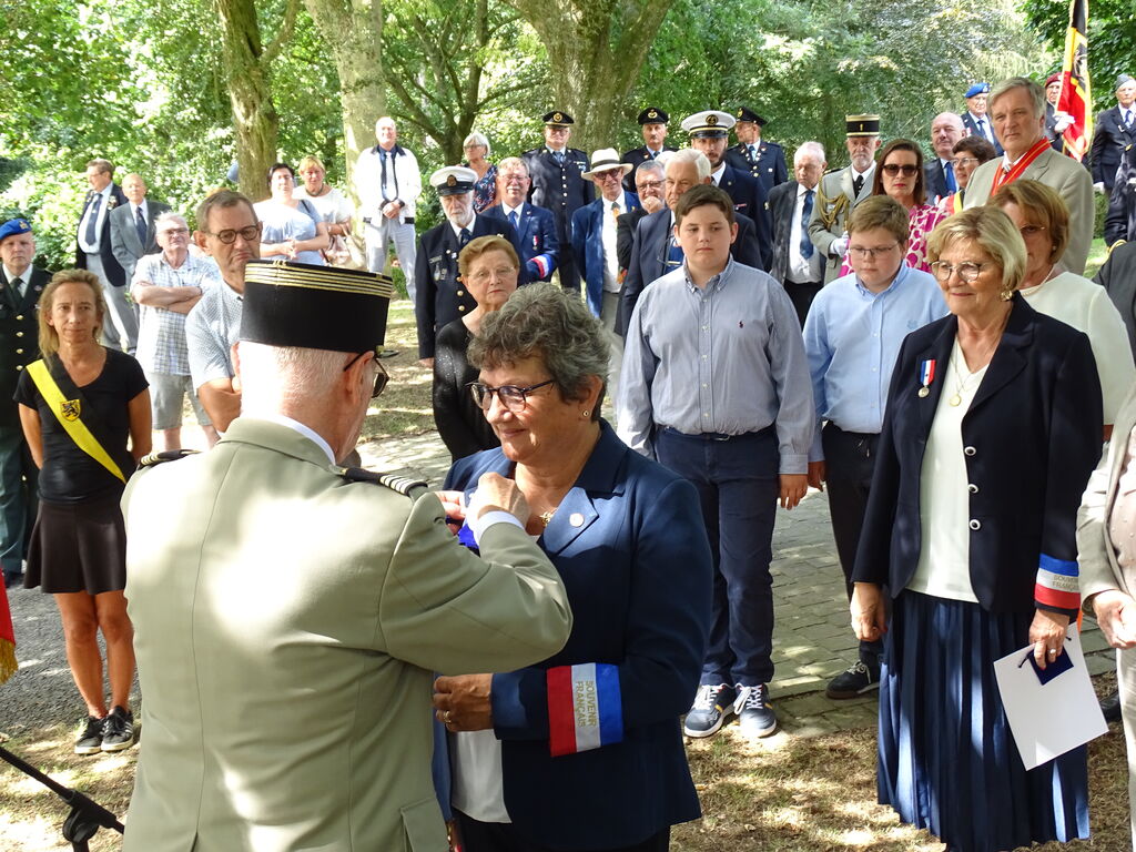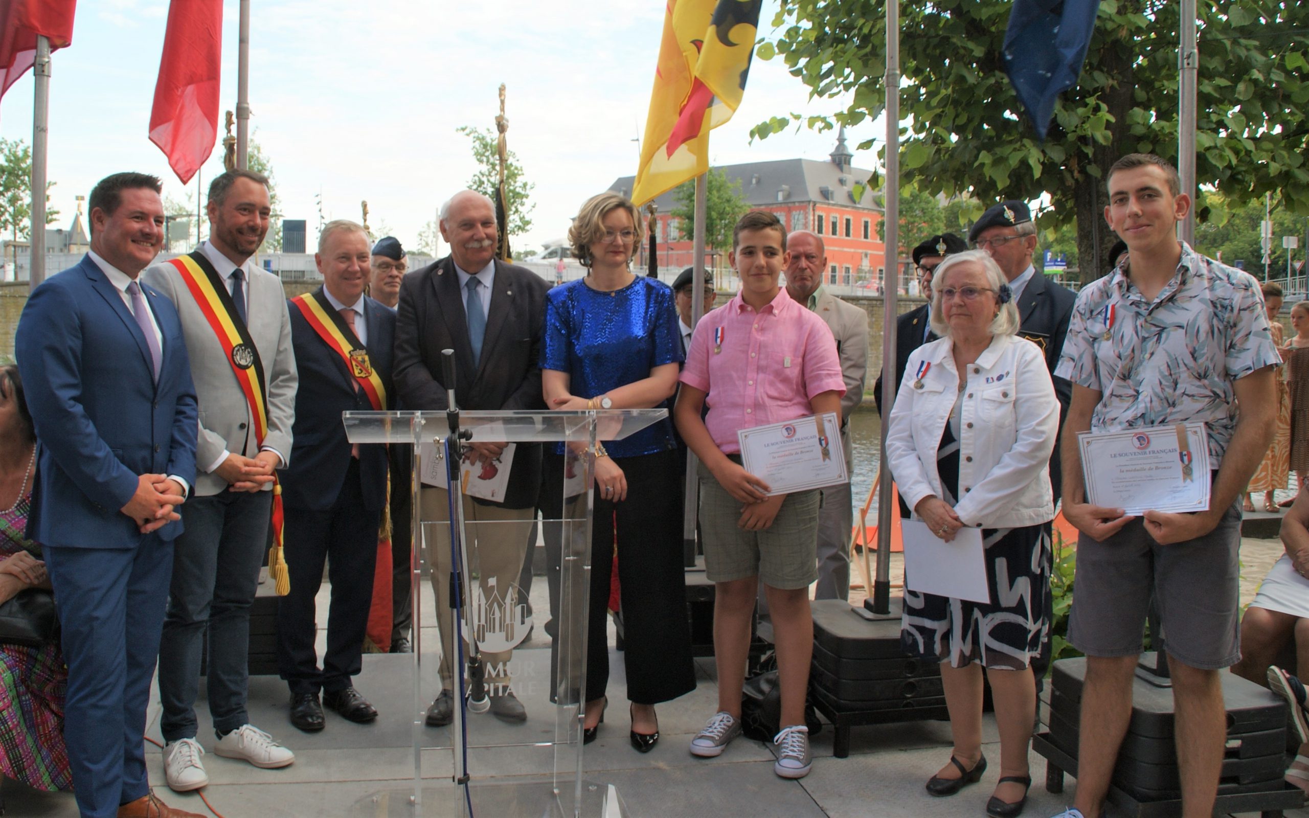 Remise de récompenses du Souvenir Français à des adhérents du comité de Namur (Belgique) par Madame la Consule générale de France et par le président du comité du Souvenir Français de l’Entre-Sambre-et-Meuse (Belgique), à l’issue de la cérémonie du 14 juillet 2022.