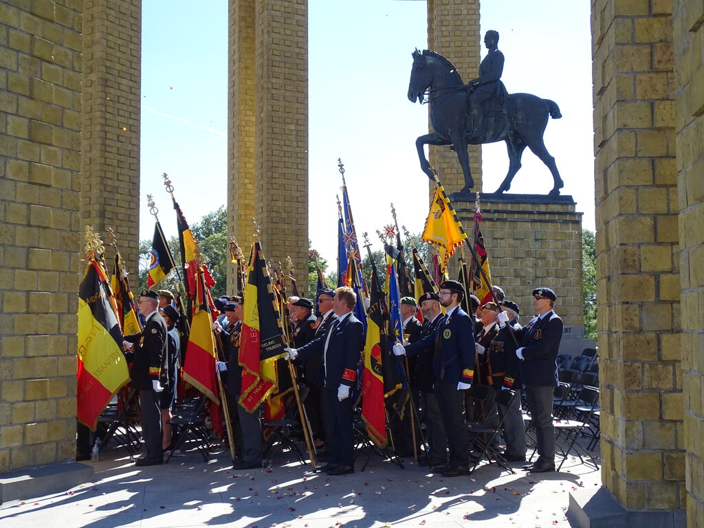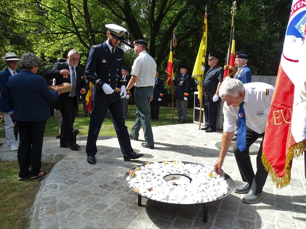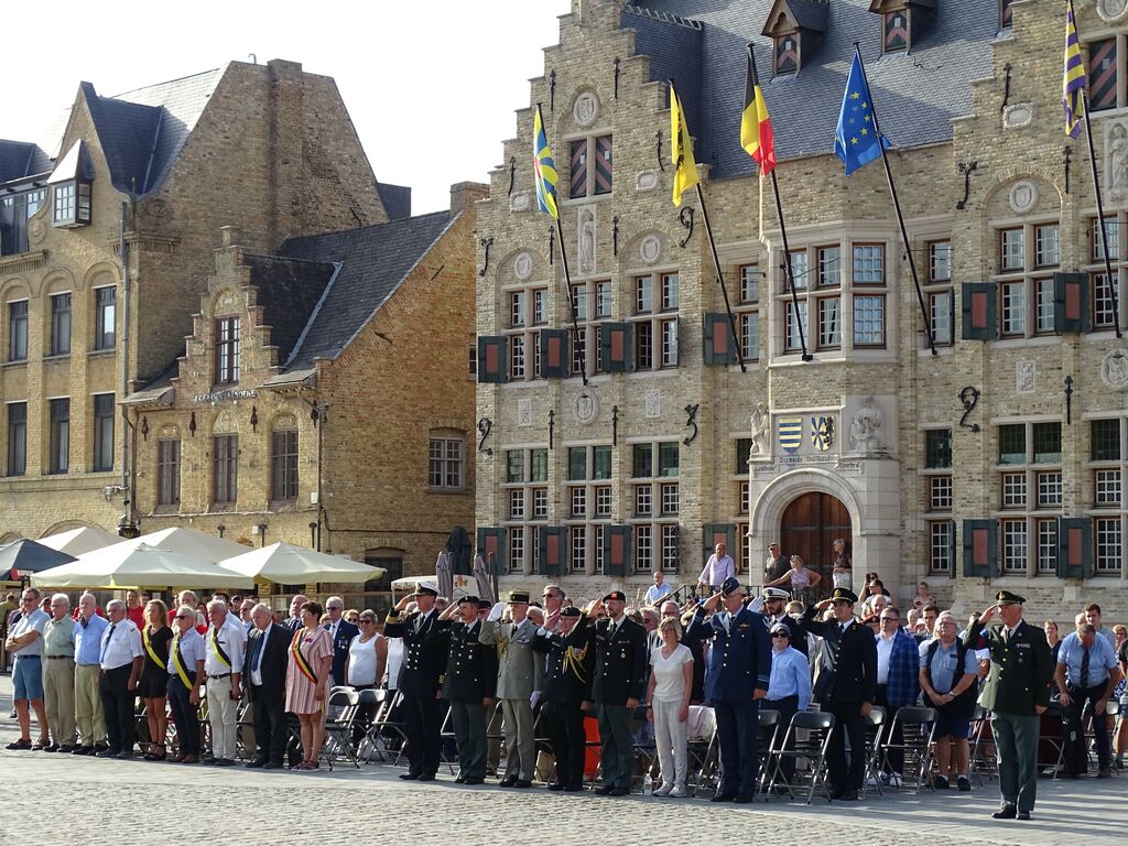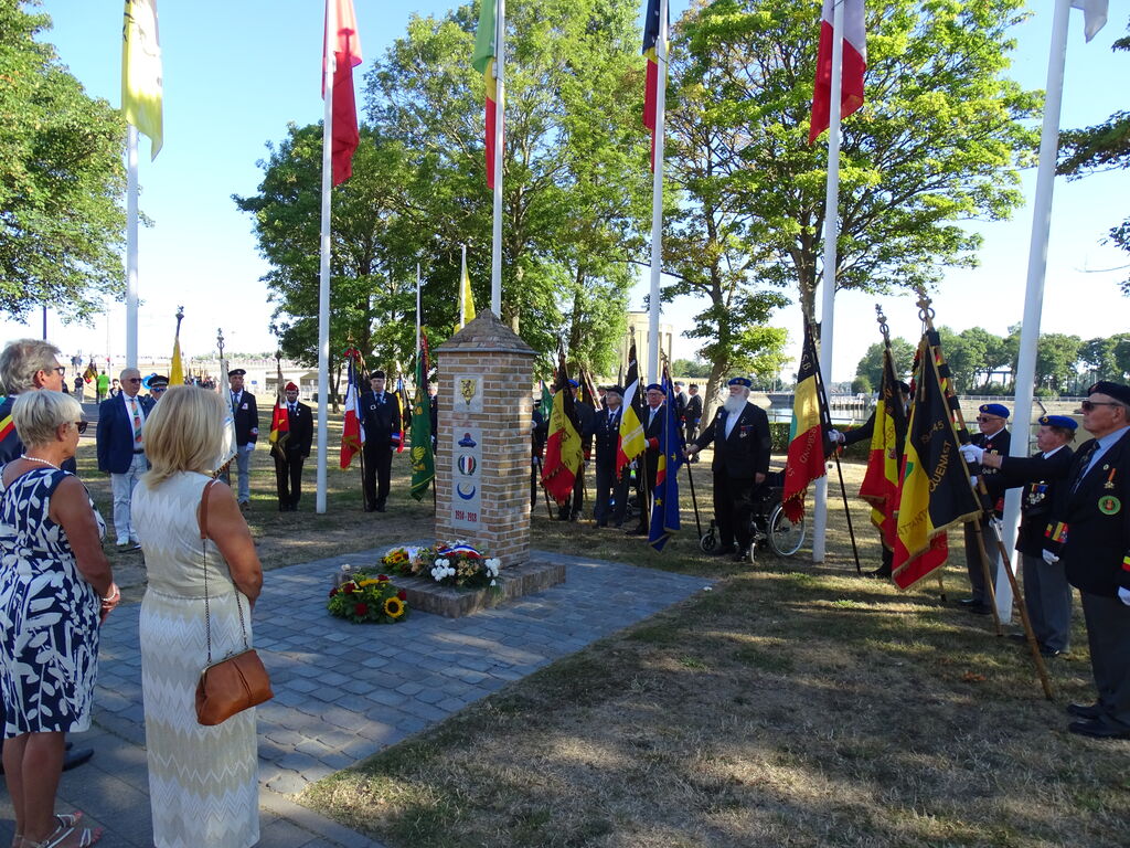 Participation du comité du Souvenir Français en Flandre Occidentale (Belgique) aux cérémonies commémoratives annuelles de Nieuport (Belgique) au Roi-Chevalier Albert 1er de Belgique, en présence des autorités civiles et militaires, de représentants des pays alliés dont la France, de diplomates et de militaires, le 7 août 2022.