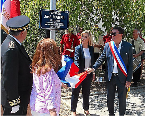 Cérémonie de dévoilement d’une plaque de rue renommée « Passage José Marfil 1921-2018 survivant du camp de Mauthausen-Gusen », en hommage à José Marfil, dans la commune de Maureillas-Las-Illas (Pyrénées-Orientales) le 14 juillet 2022, en présence du Souvenir Français, des autorités civiles et militaires et des élus locaux.