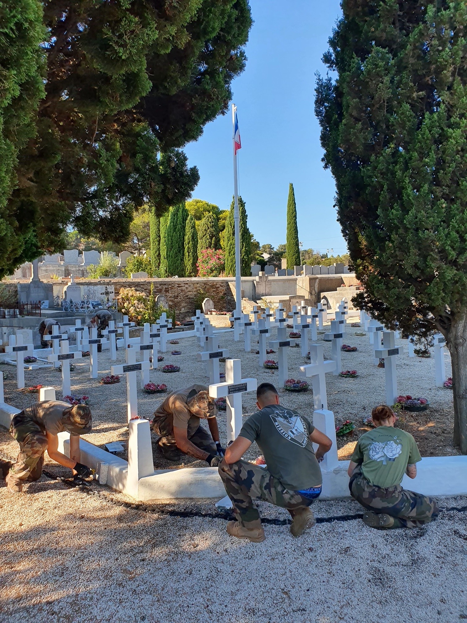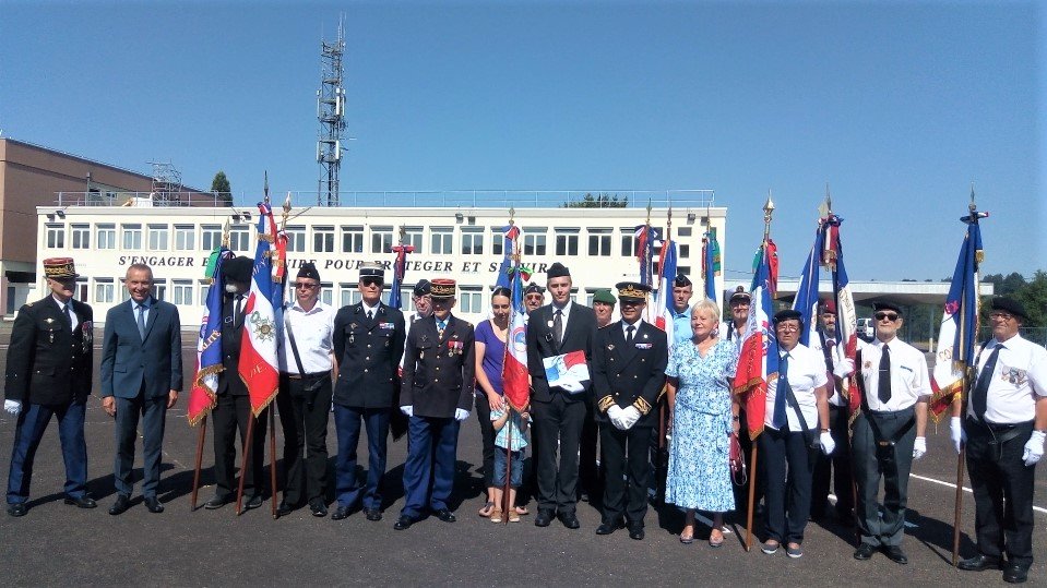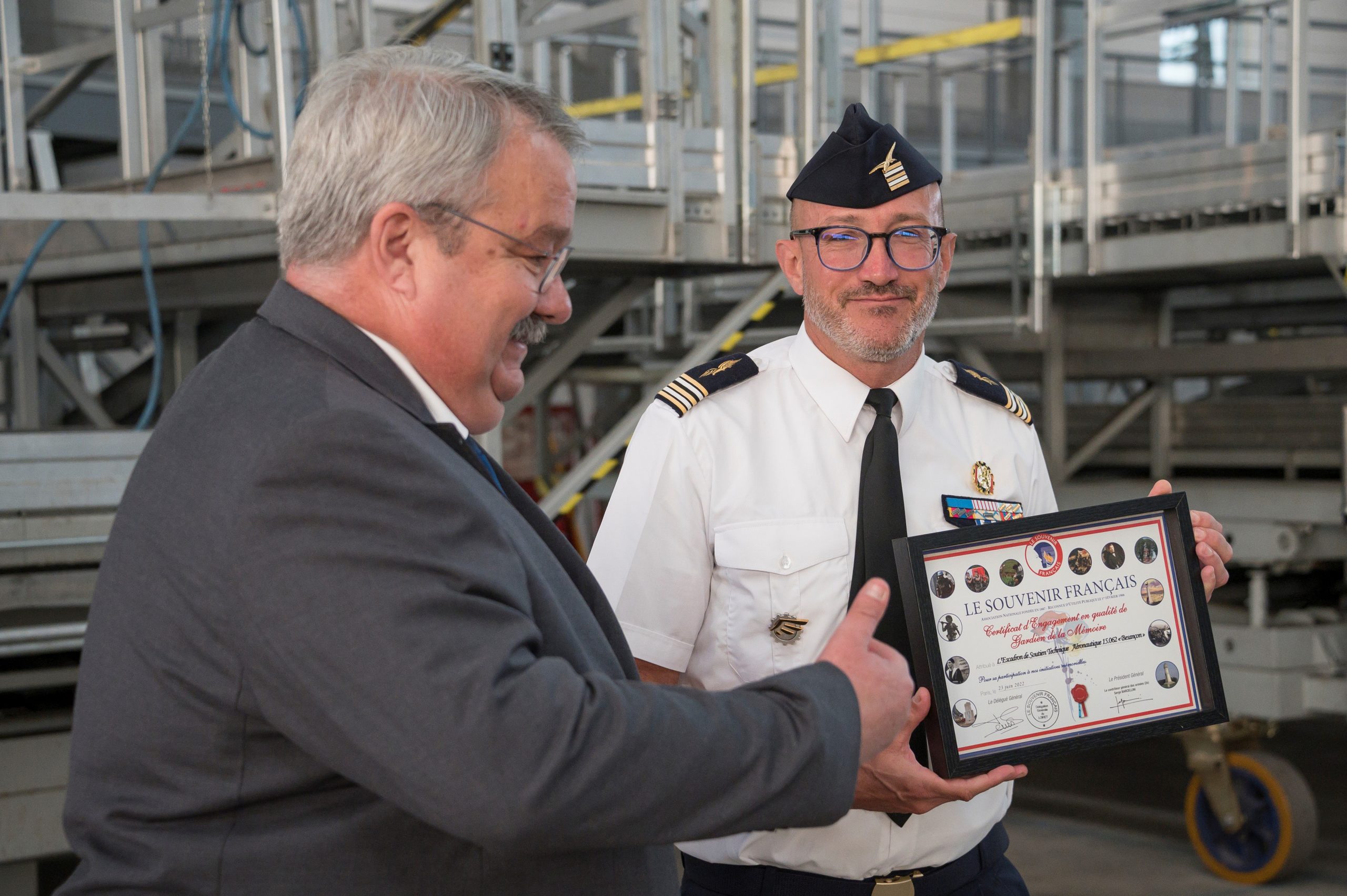 Remise du diplôme de gardien de la mémoire du Souvenir Français par le délégué général du Souvenir Français du Loiret au lieutenant-colonel Yann, commandant l’escadron de soutien technique aéronautique, le 1er juillet 2022 suite à la participation d’une partie des soldats à l’entretien des tombes du carré militaire d’Orléans.