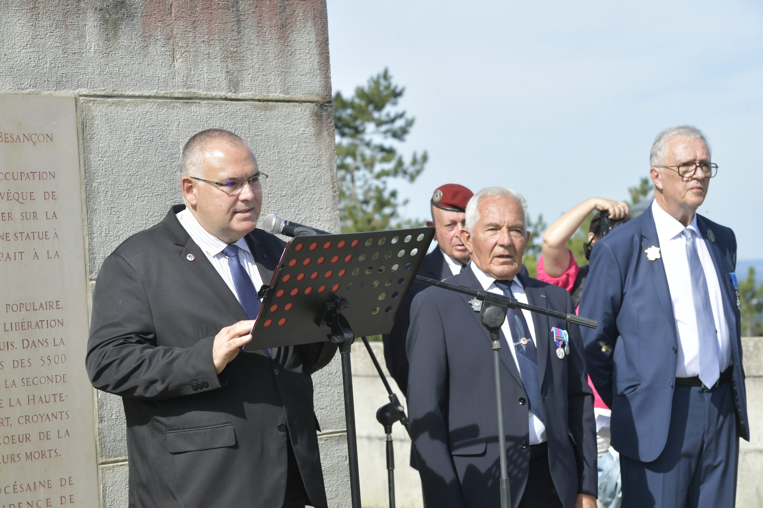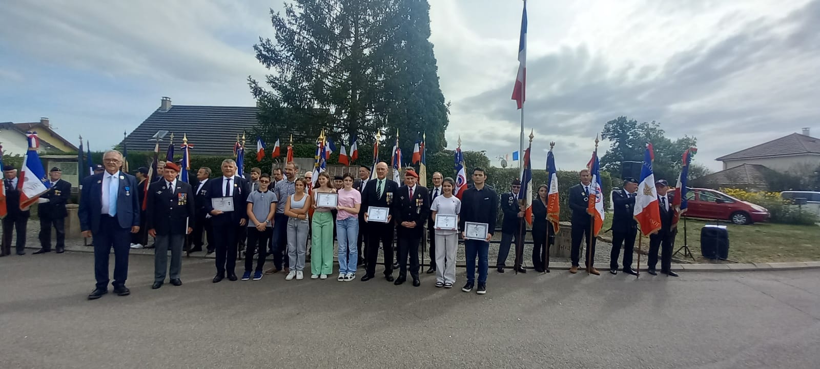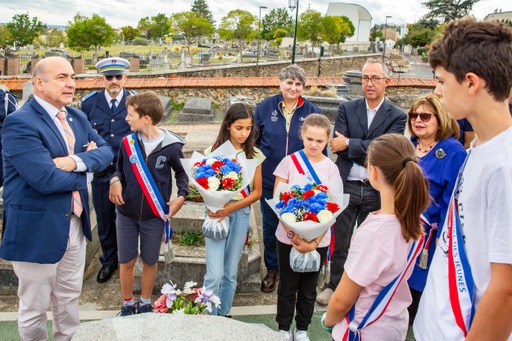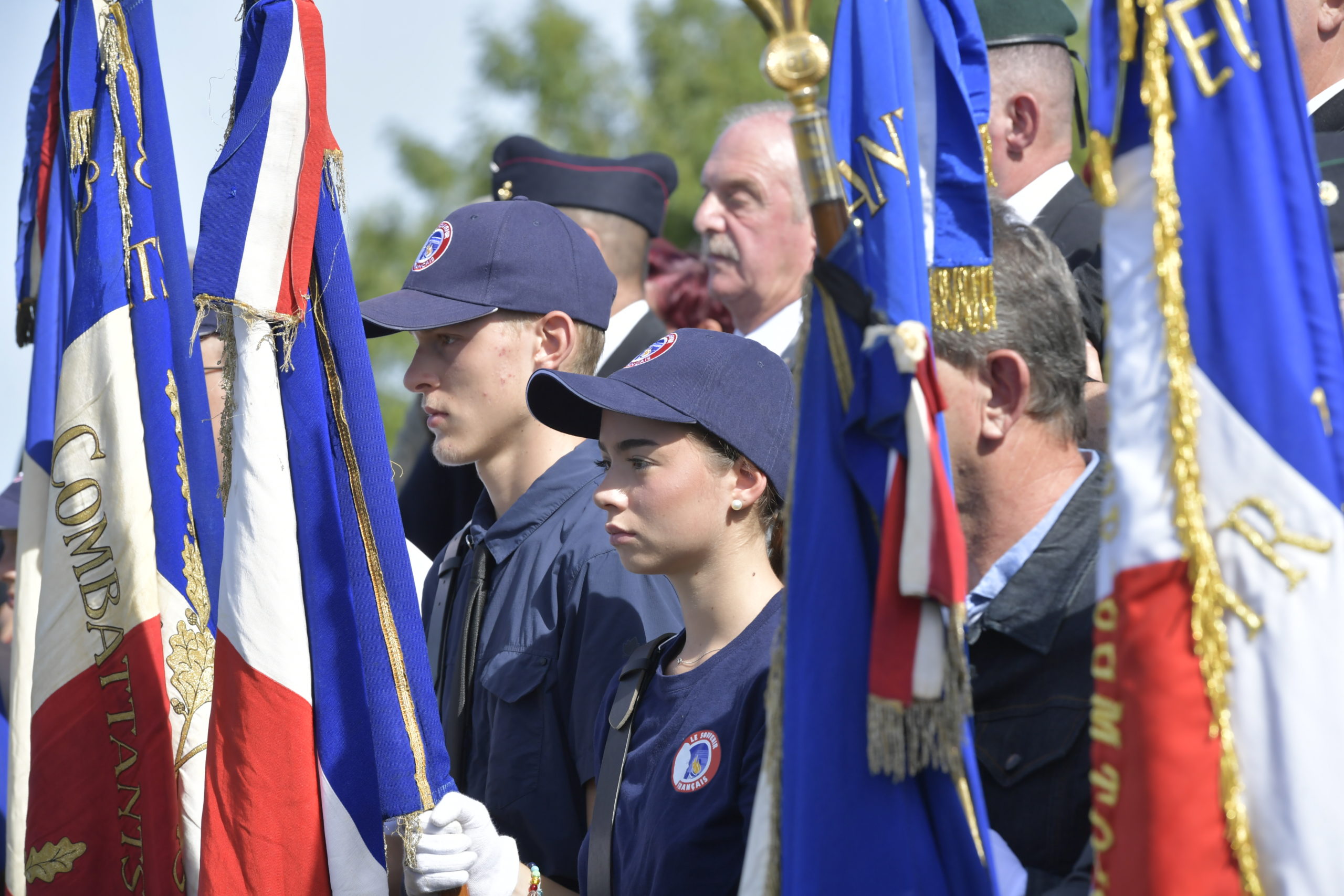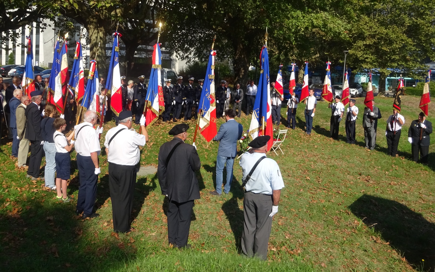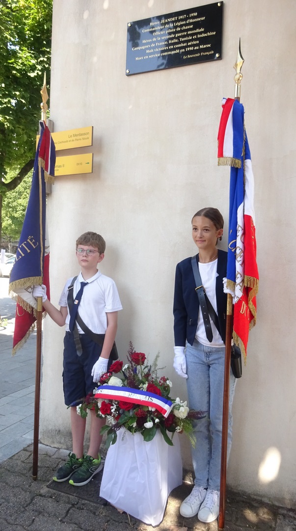 Cérémonie d’inauguration d’une plaque à la mémoire d’un as de la Première Guerre mondiale, le capitaine Guynemer et d’une plaque à la mémoire d’un as de la Seconde Guerre mondiale, le commandant Jeandet, organisée par la délégation générale du Souvenir Français de Savoie, le 10 septembre 2023, dans la commune de Bourget du Lac, en présence des autorités civiles et militaires.