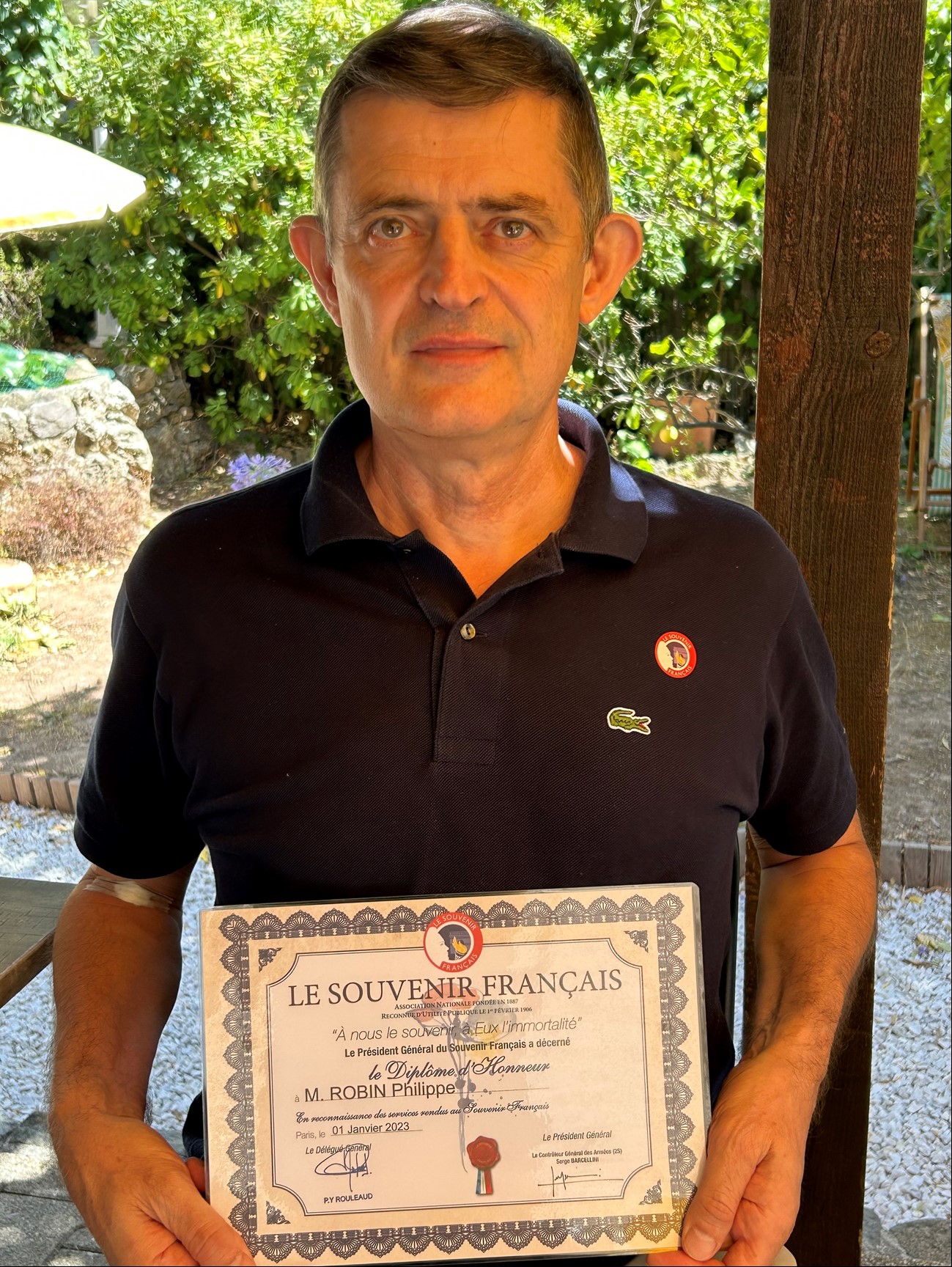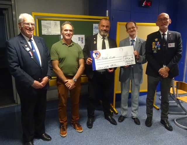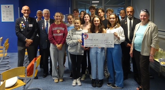Remise de chèque au proviseur du lycée Marlioz d’Aix-les-Bains le 27 septembre 2023 par le délégué général du Souvenir Français de Savoie. Ce chèque permettra aux élèves d’effectuer un voyage scolaire à la base navale de Toulon, au musée du Débarquement en Provence et au Mémorial des guerre d’Indochine à Fréjus.