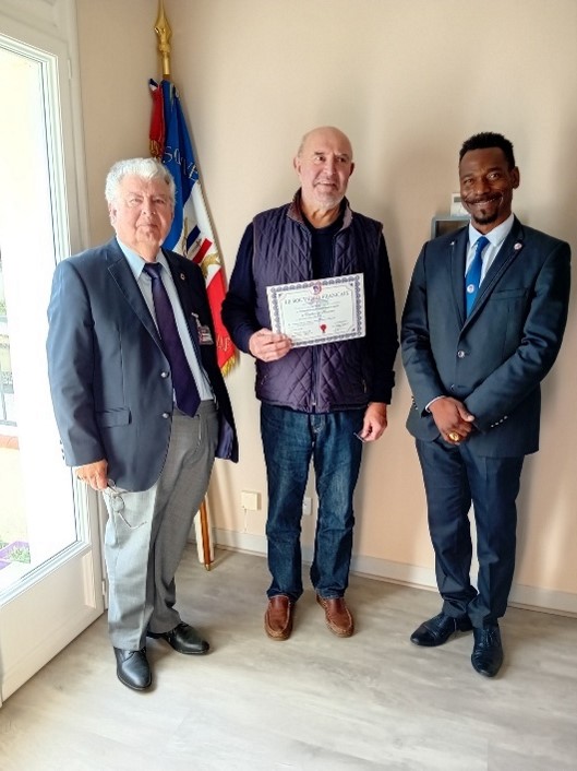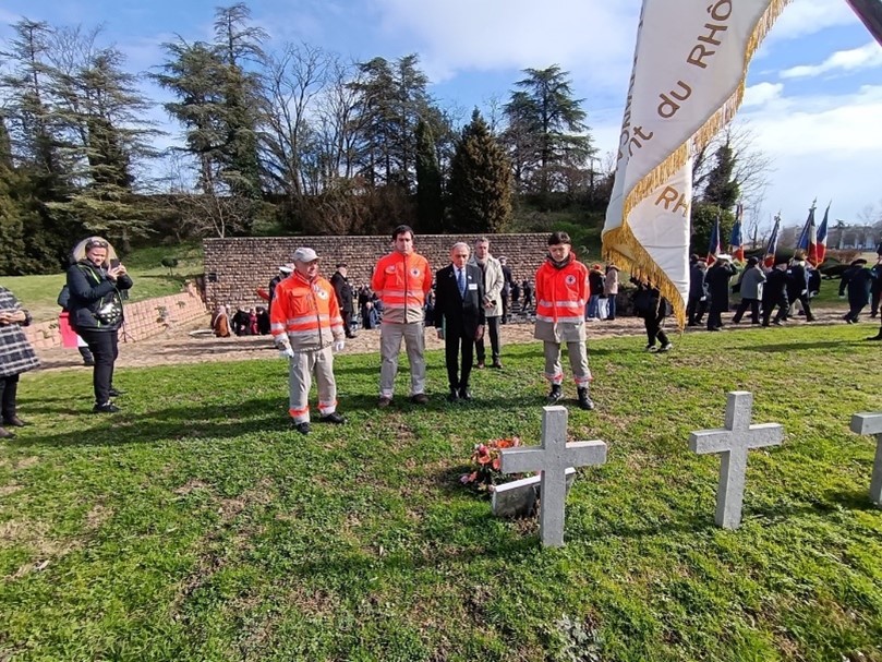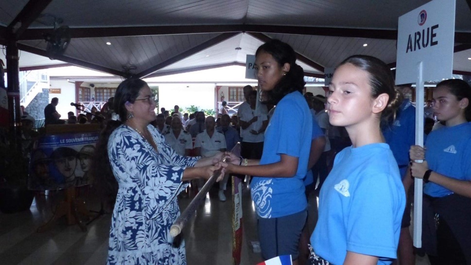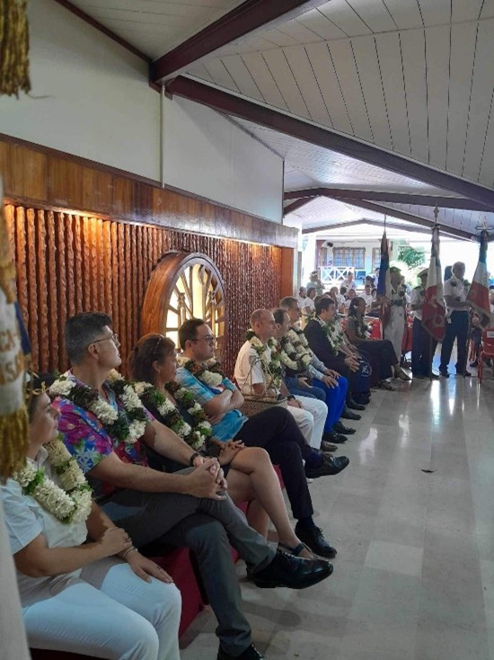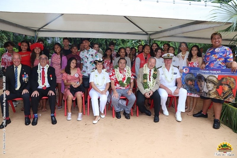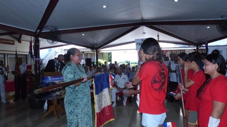 Remise d’un drapeau de la FNDIRP (Fédération Nationale des déportés et internés résistants et patriotes), de la section de Royan, au Lycée Français International de Bangkok (Thaïlande), le 13 février 2024, en présence des autorités.