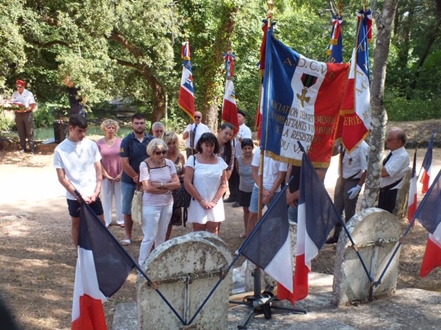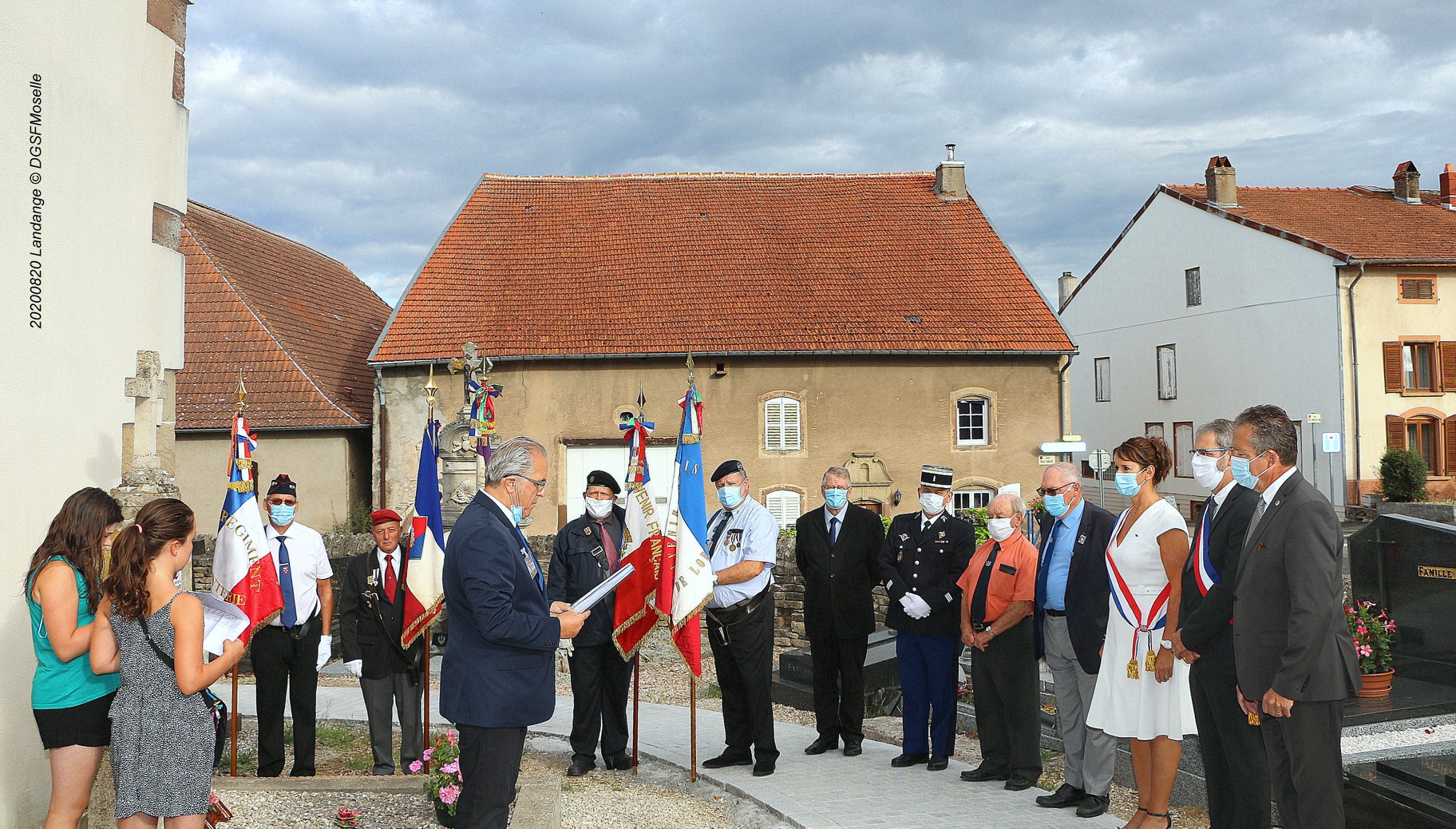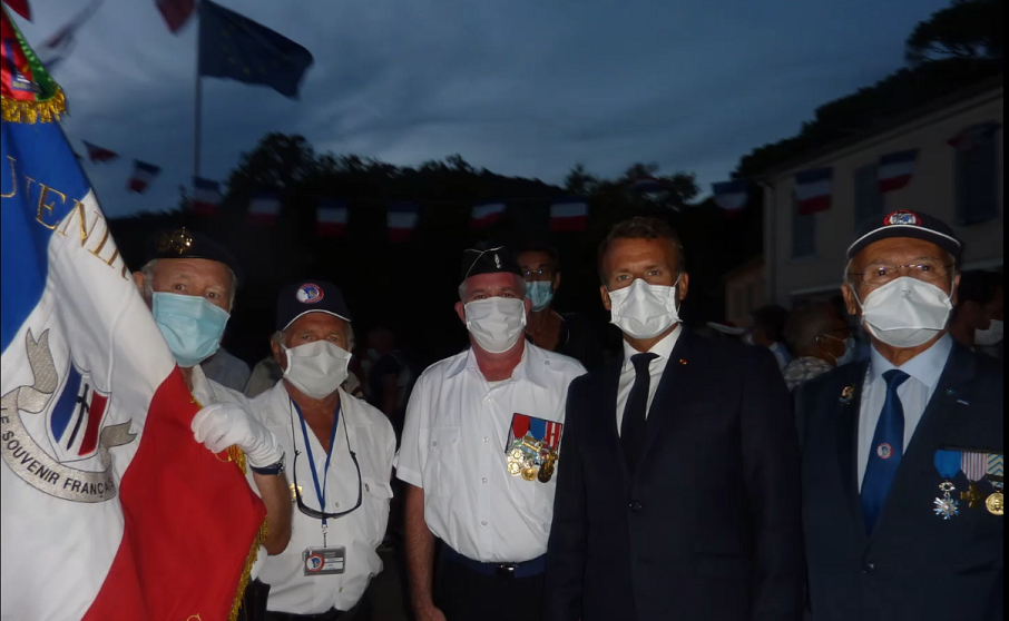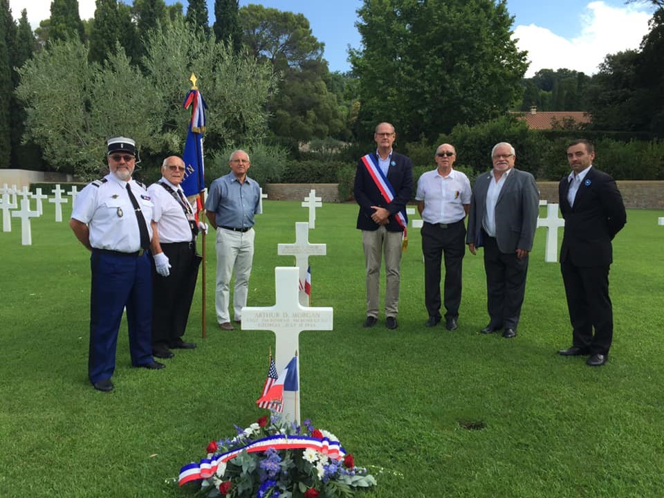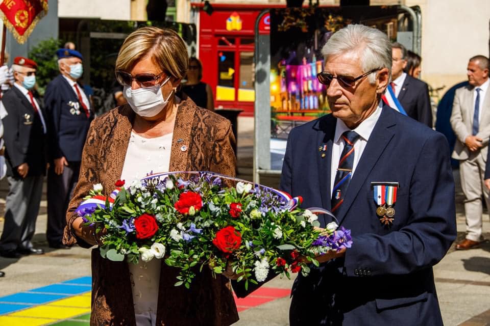 Dépôt de gerbes sur la tombe du Marechal de LATTRE de TASSIGNY, par Claude Jeanty, Président du comité du Souvenir Français de la Chataigneraie (Vendée) et Mme Alexandrine Grolier, adjointe au Maire de Mouilleron-Saint-Germain, le 15 août 2020, à l’occasion du 76ème anniversaire du débarquement de Provence.