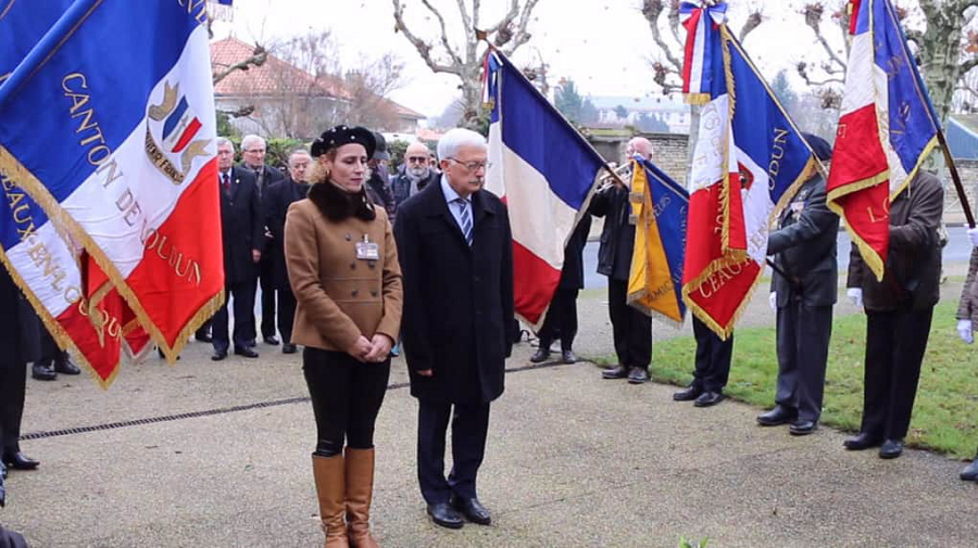 Inauguration d‘une plaque en hommage à trois « Morts pour la France » en Algérie, le 5 décembre 2017 à Loudun en présence de la déléguée générale du Souvenir Français de la Vienne Aïda Jaafar et de Jacques Servent, président du comité du Souvenir Français de Loudun