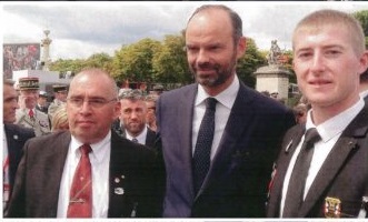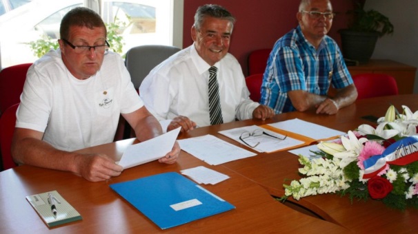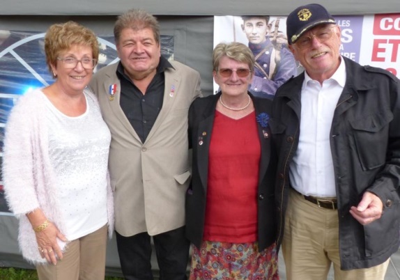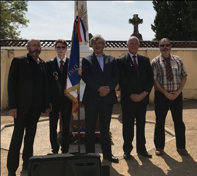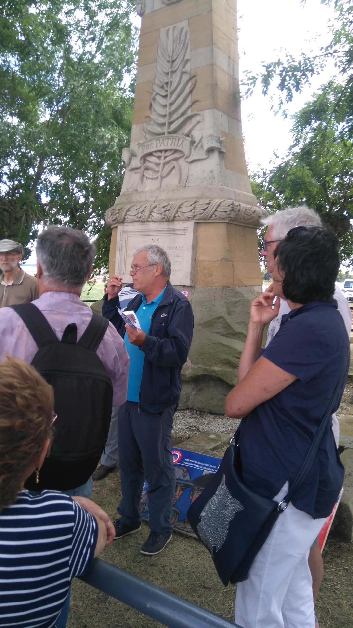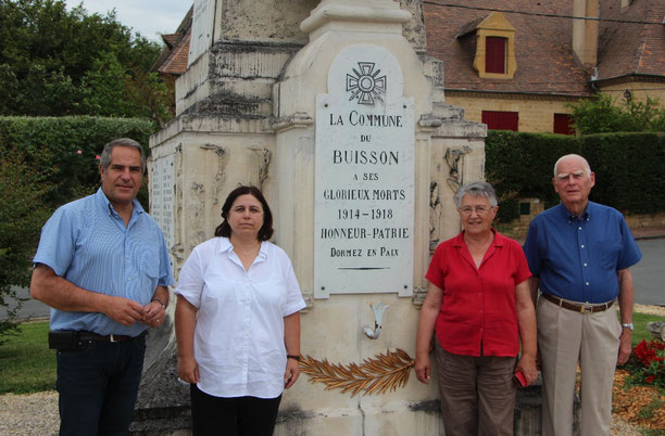 Accueil d’une équipe du comité du Souvenir Français de Bergerac par le Maire du Buisson de Cadouin (24), Jean-Marc Gouin et Michèle Fourtoux, conseillère déléguée à la communication le 10 juillet 2017 suite au projet engagé par M. Bournazel, N. Rigoulet et J. Couleaud du comité de Bergerac qui ont relevé le défi du projet « Un jour, Un poilu – Tour de France ».