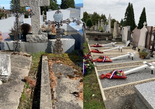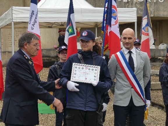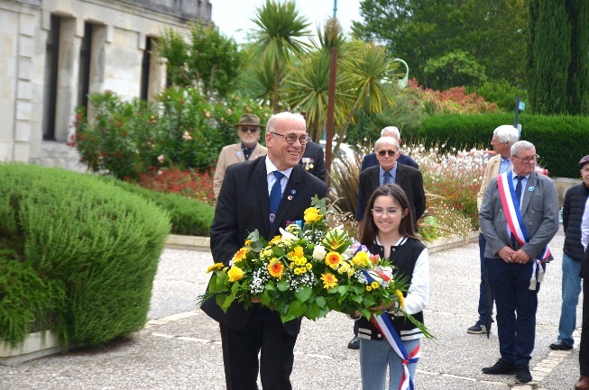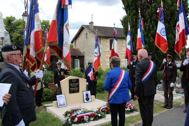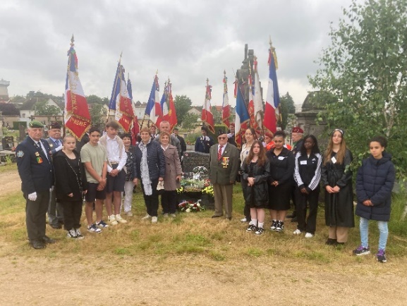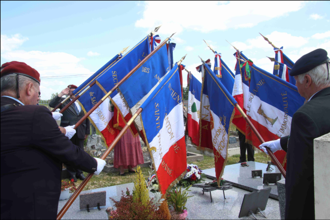 1- L’inauguration de tombes rénovées avec des élèves des écoles, des élus et des drapeaux d’associations mémorielles à St Georges de Longuepierre le vendredi 25 mai 2024 à 11 h au cimetière. Il s’agit de trois tombes de la Grande Guerre (dont deux frères) reconstruites avec la participation du Souvenir Français. Les enfants des écoles ont fait le tour du cimetière, avec un arrêt devant chaque tombe de “Mort pour la France” (sept en tout), lecture de la biographie du soldat, minute de silence, “Aux morts” avec les drapeaux. La journée s’est terminée par la remise d’un chèque géant au Maire lors d’un vin d’honneur à la salle des fêtes.