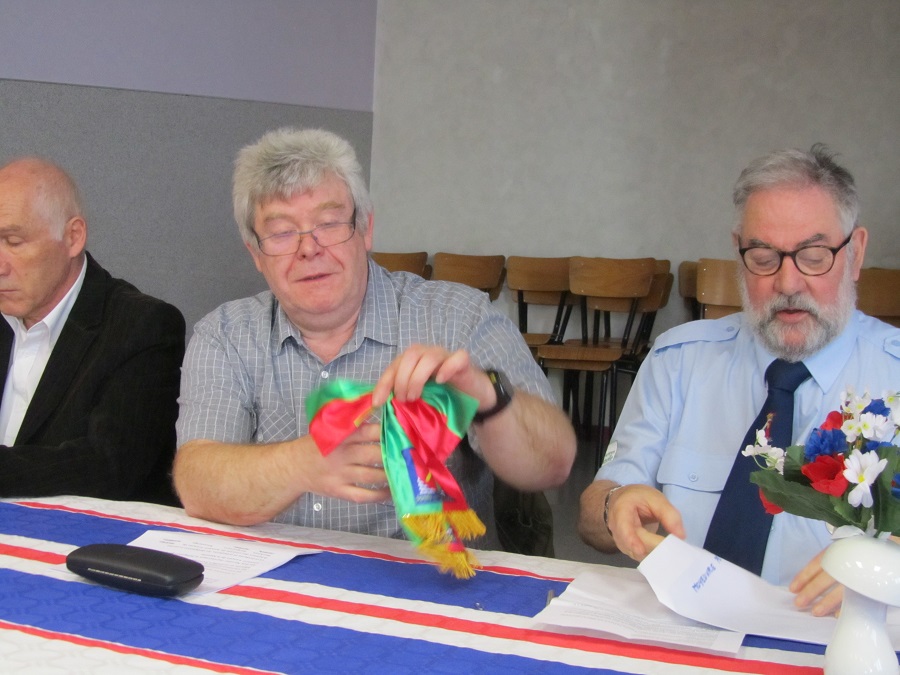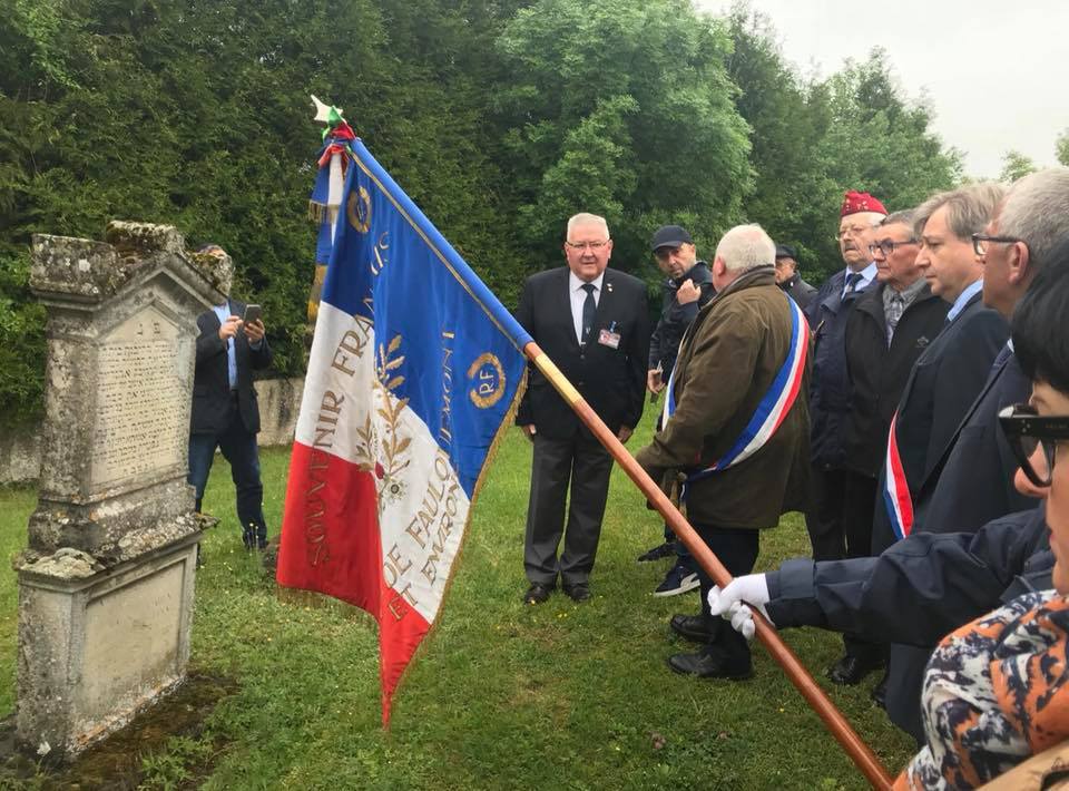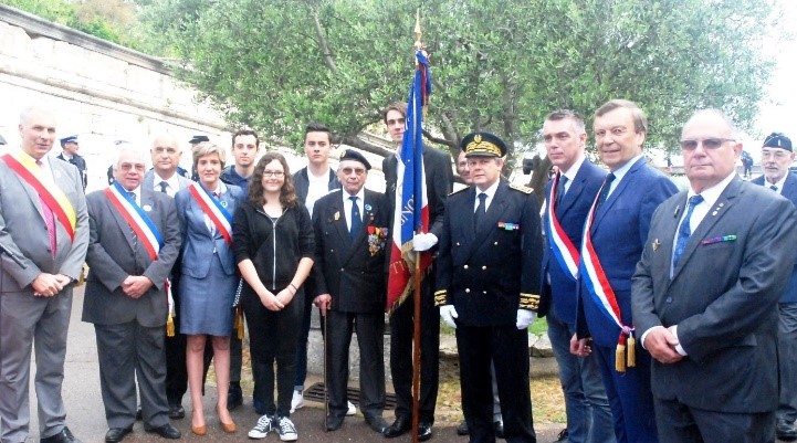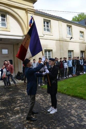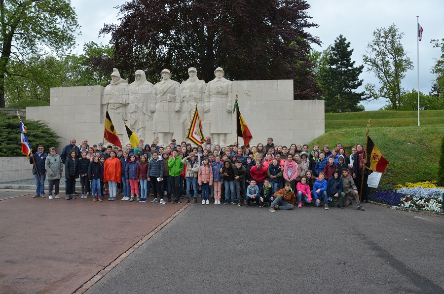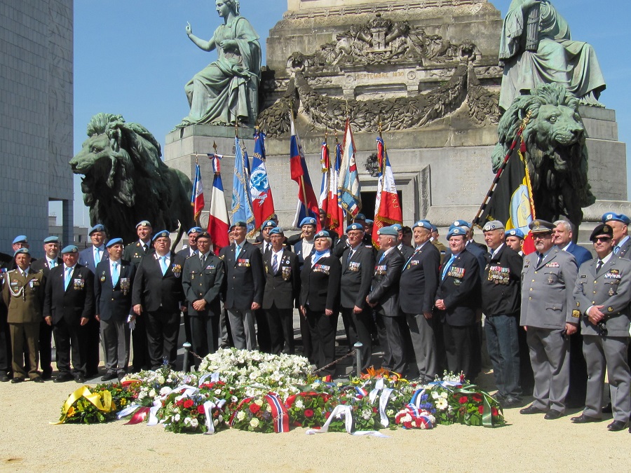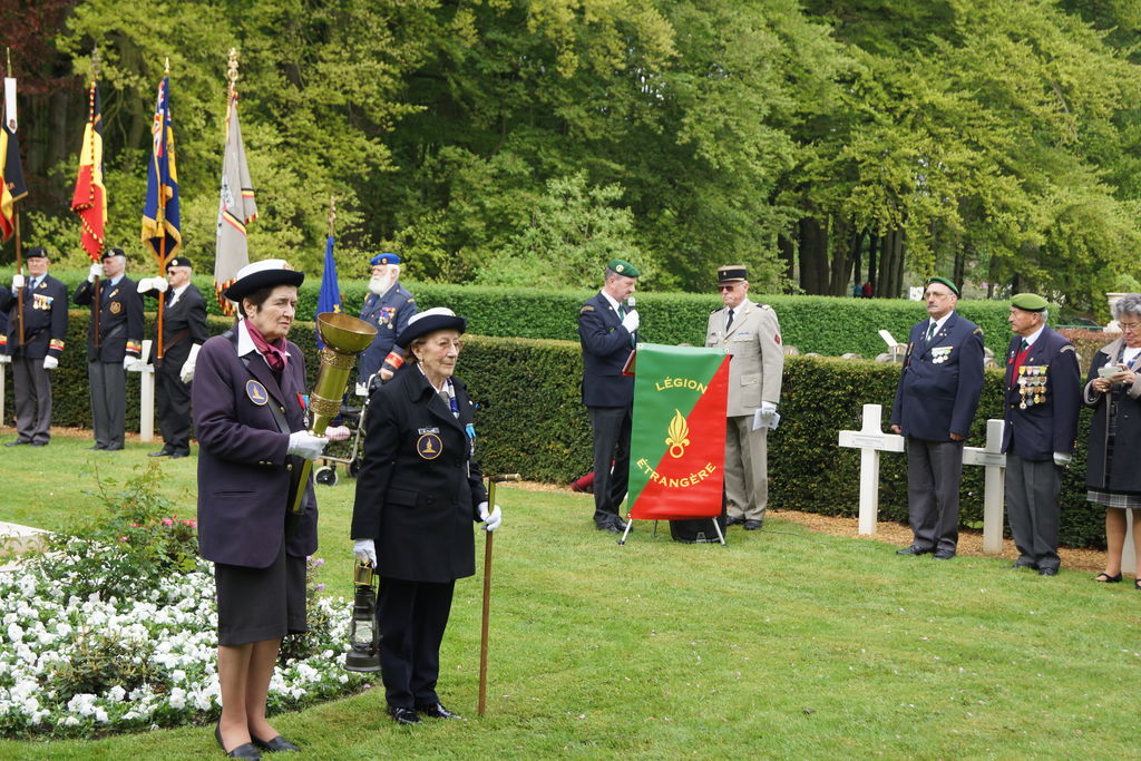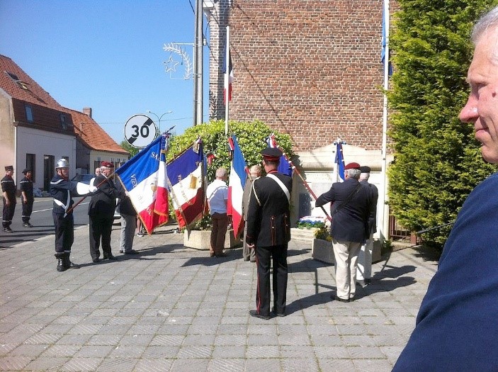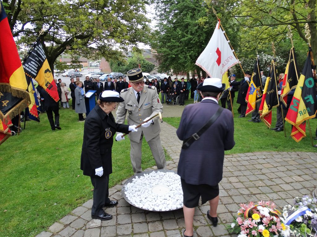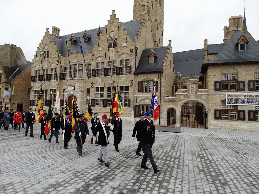 Cérémonie d’hommage aux fusiliers-marins de la brigade Ronarc’h, le samedi 28 avril 2018, à Dixmude. Départ du cortège sur le Grote Markt, avec le drapeau du Comité du Souvenir Français de Flandre Occidentale en tête. Arrivée de la flamme prélevée sur la tombe du Soldat Inconnu à Paris par le Relais Sacré.
