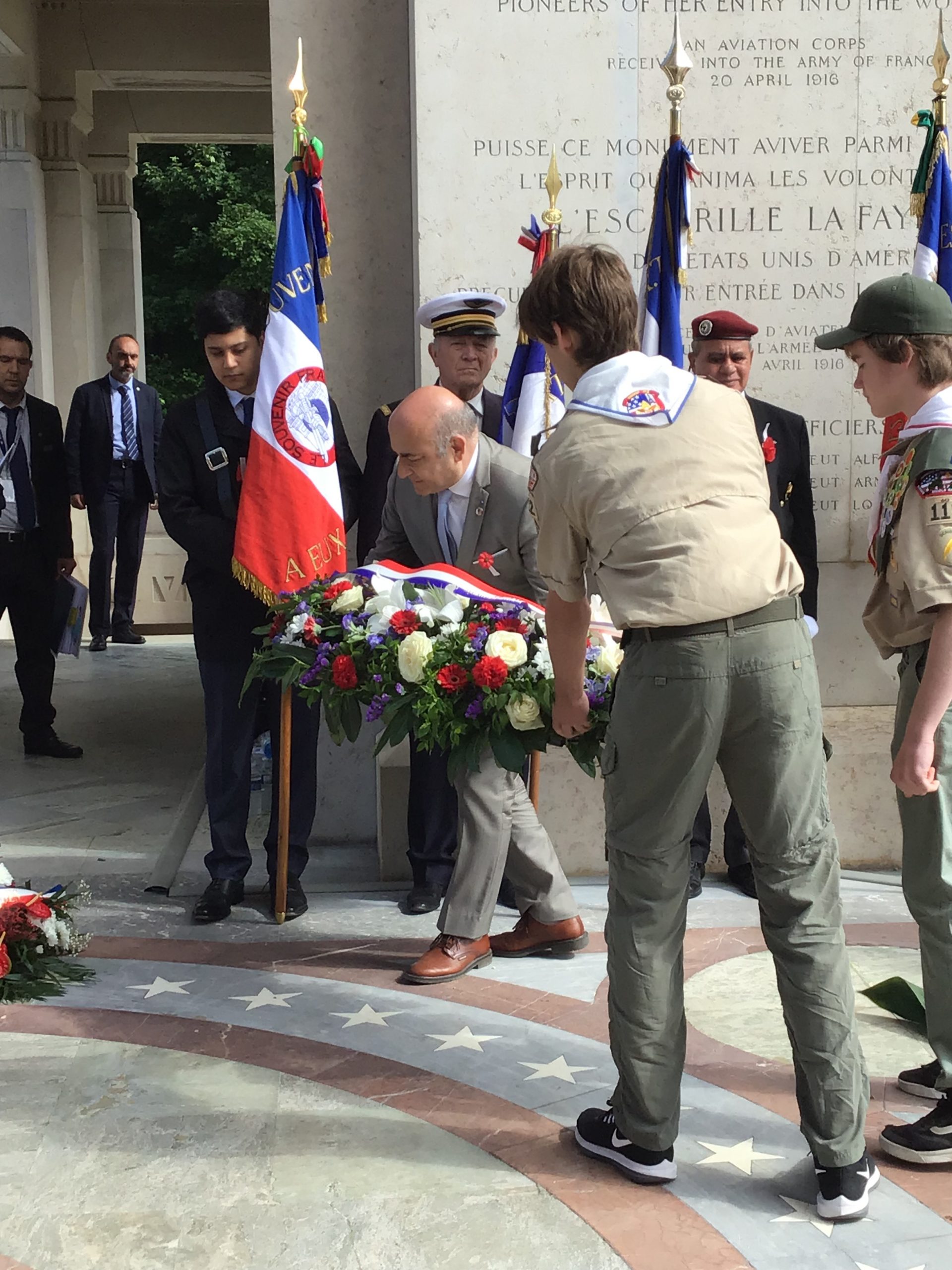 Dépôt de gerbe par le délégué général du Souvenir Français pour les Hauts-de-Seine, Claude GUY, lors de la cérémonie franco-américaine au mémorial de l’escadrille Lafayette, le 26 mai 2019.