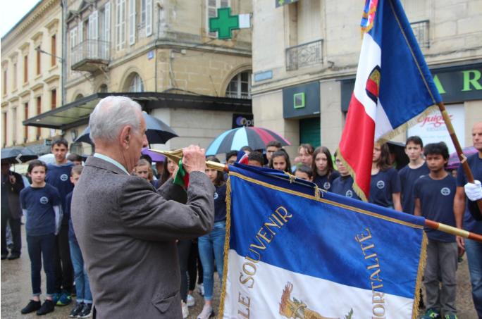 Remise de la cravate Rhin et Danube au drapeau du comité du Souvenir Français de Bergerac (Dordogne) par Roger Landolfi, Ancien de la 1ère Armée Française, le 8 mai 2019.