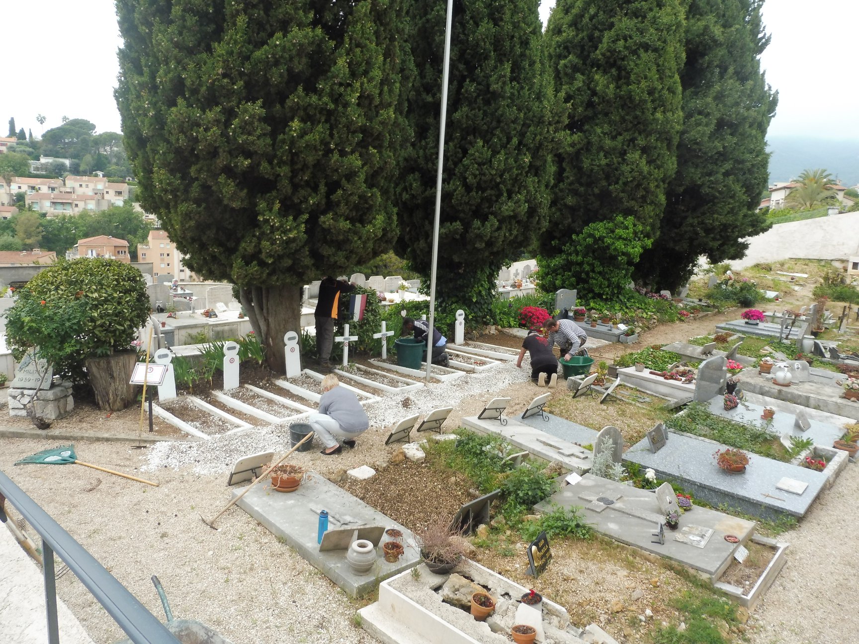 Nettoyage du carré militaire du cimetière du centre-ville de Vence (Alpes-Maritimes) par les bénévoles du Souvenir Français, le 3 mai 2019.