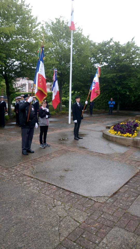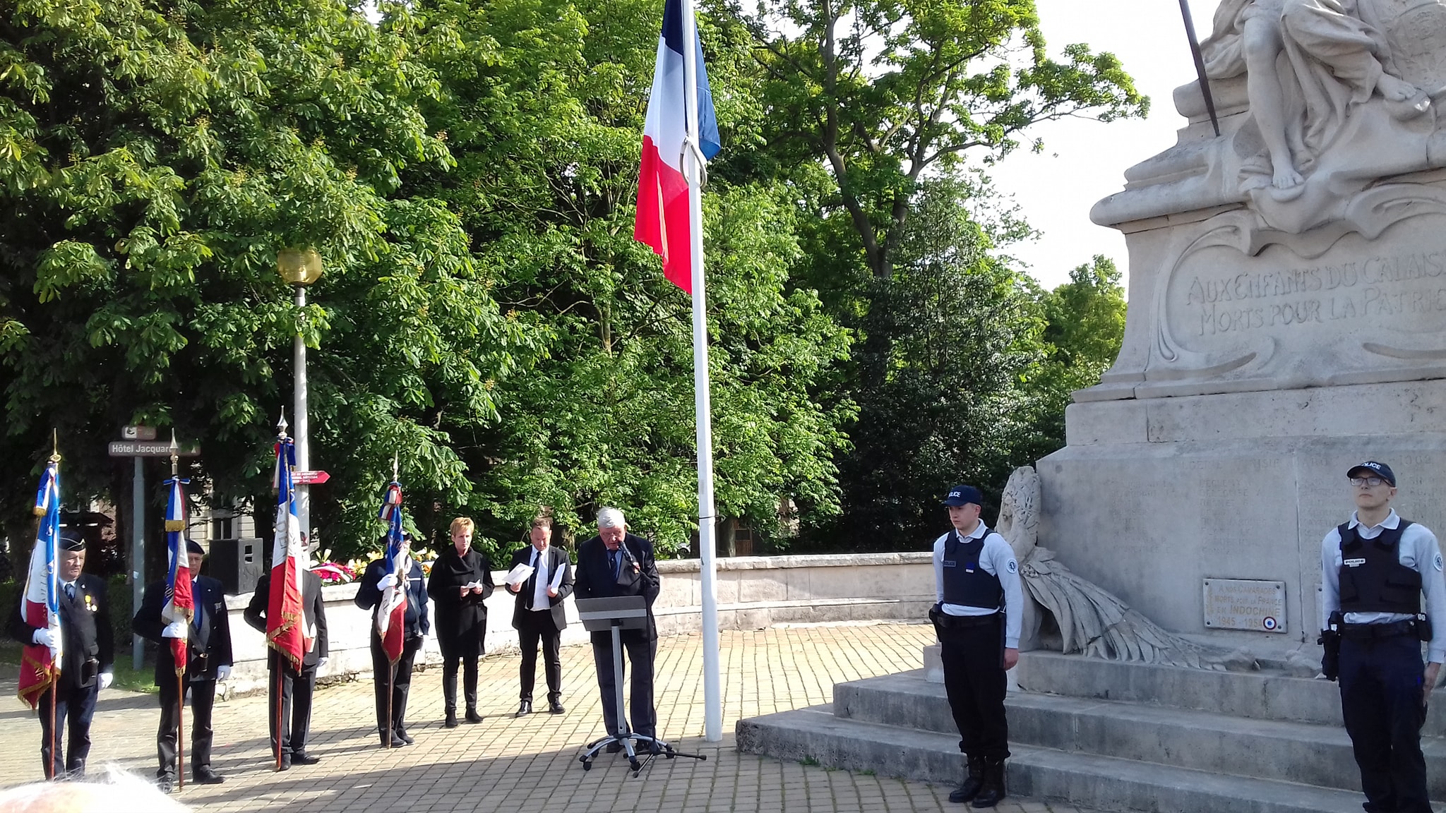 Première sortie du jeune porte-drapeau du comité du Souvenir Français de Roye (Somme), lors de la cérémonie du 8 mai 2019