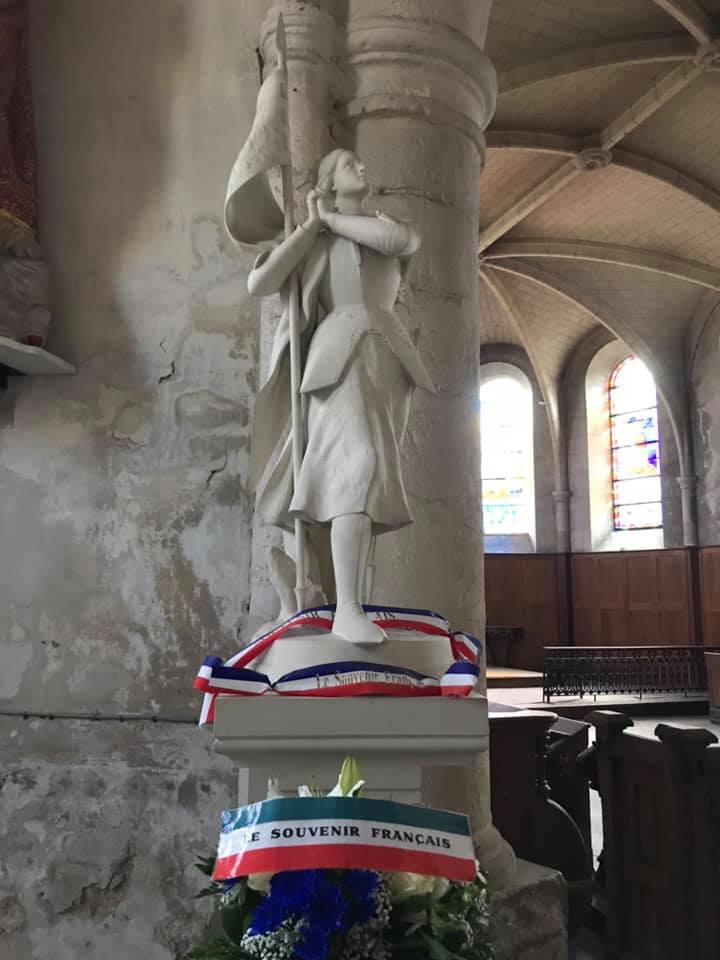 Dépôt de gerbe par le comité du Souvenir Français de Nangis (Seine-et-Marne) au pied de la statue de Jeanne d’Arc dans l’Eglise Saint-Martin-et-Saint-Magne de Nangis à l’occasion de la fête nationale de Jeanne d’Arc et du patriotisme, le 12 mai 2019.