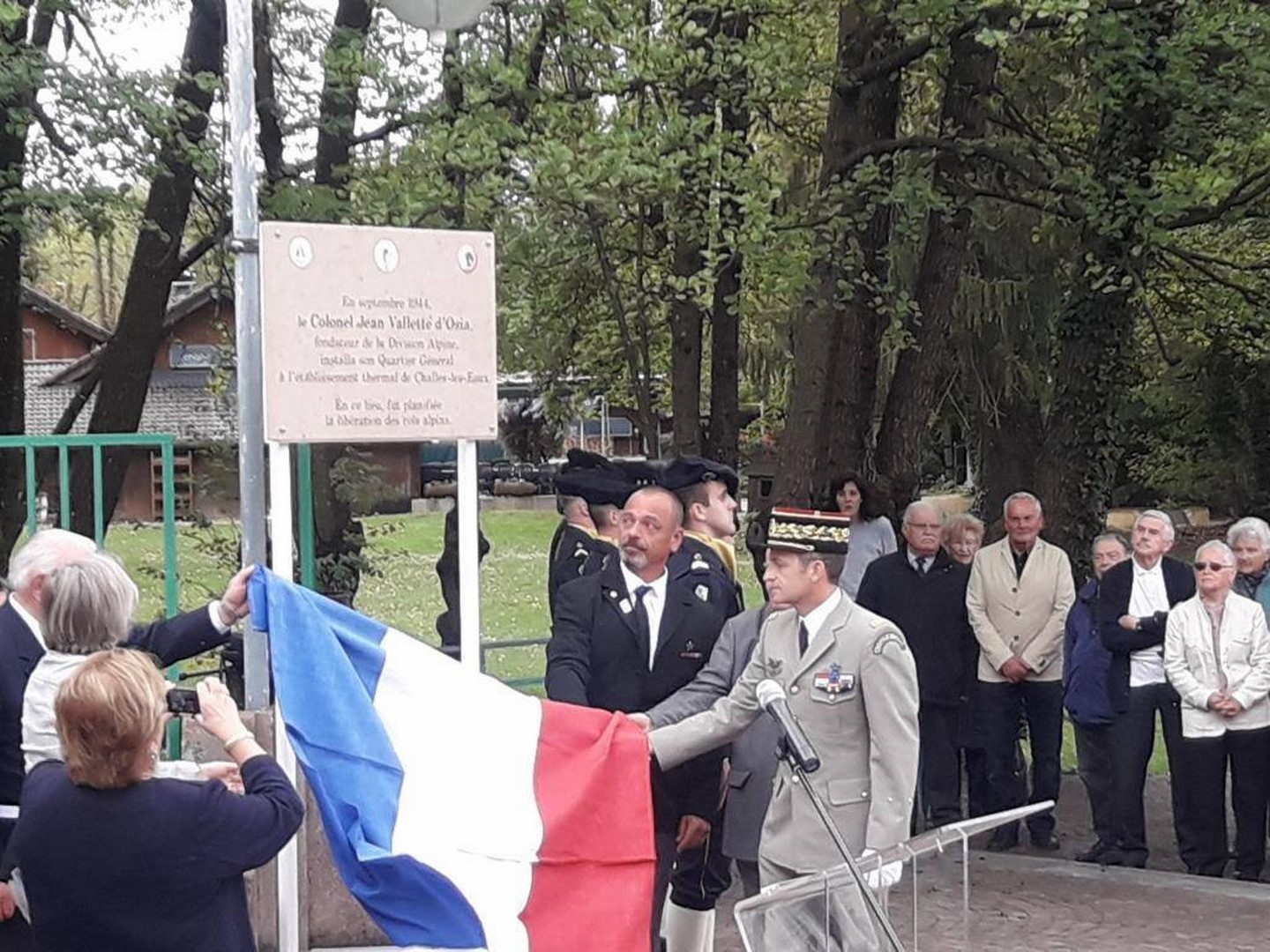 Dévoilement de la plaque en hommage au général Jean Vallette d’Osia, créateur de l’Armée des Alpes en 1944, dans son Quartier Général à Challes-les-Eaux par le délégué général du Souvenir Français, Frédéric Mareschal, le 27 avril 2019.