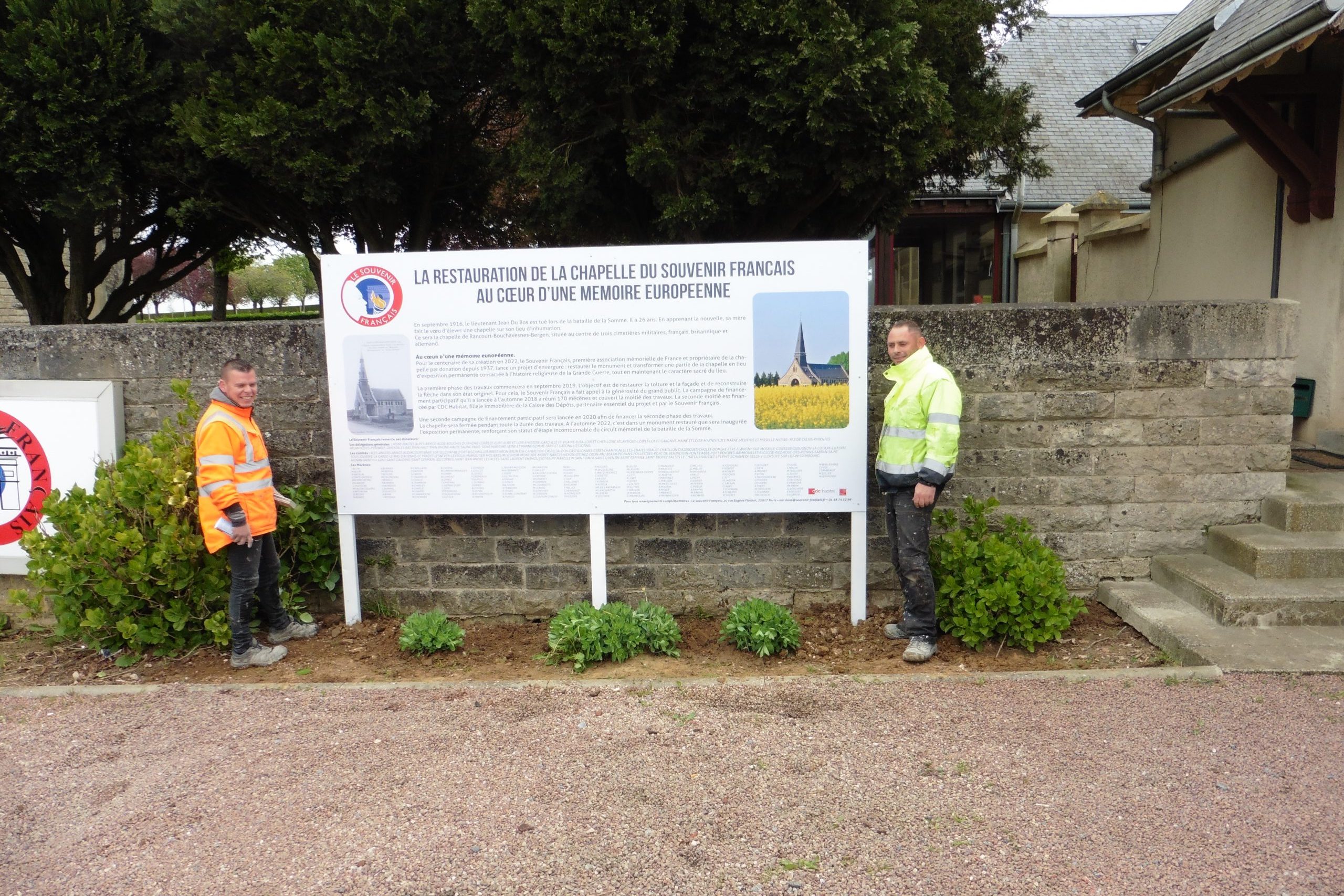 Installation d’un panneau pédagogique devant la Chapelle du Souvenir Français à Rancourt, Bouchavesne-Bergen.