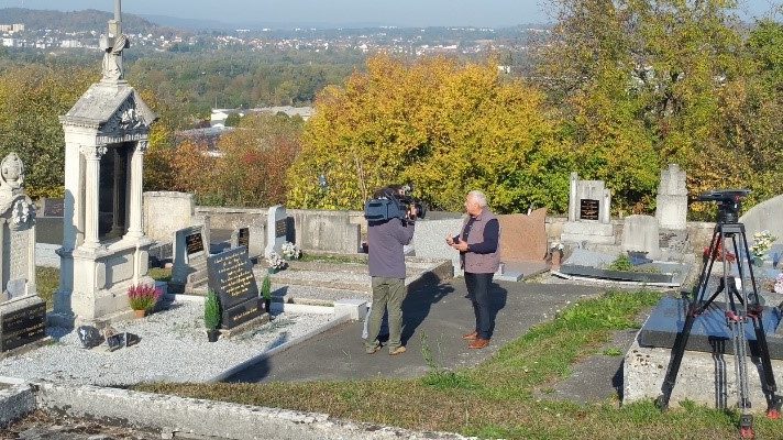 Interview du président du comité du Souvenir Français de Montbéliard, Mr Jean Marie Ali, pour un reportage sur le caporal Peugeot, premier tué de la Première Guerre mondiale devant sa tombe.