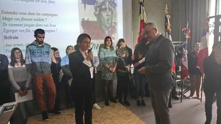 Remise d’un drapeau Rhin et Danube au lycée Ernest Ferroul à Lézignan Corbières par le délégué général du Souvenir Français pour l’Aude Jean-Louis Béziat le 12 octobre.