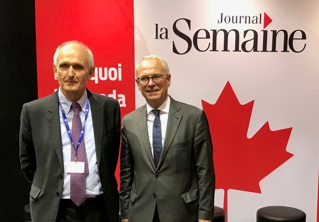 Serge Barcellini sur le stand de l’hebdomadaire La Semaine, à la Foire internationale de Metz, avec le rédacteur en chef du journal le 29 septembre 2018.