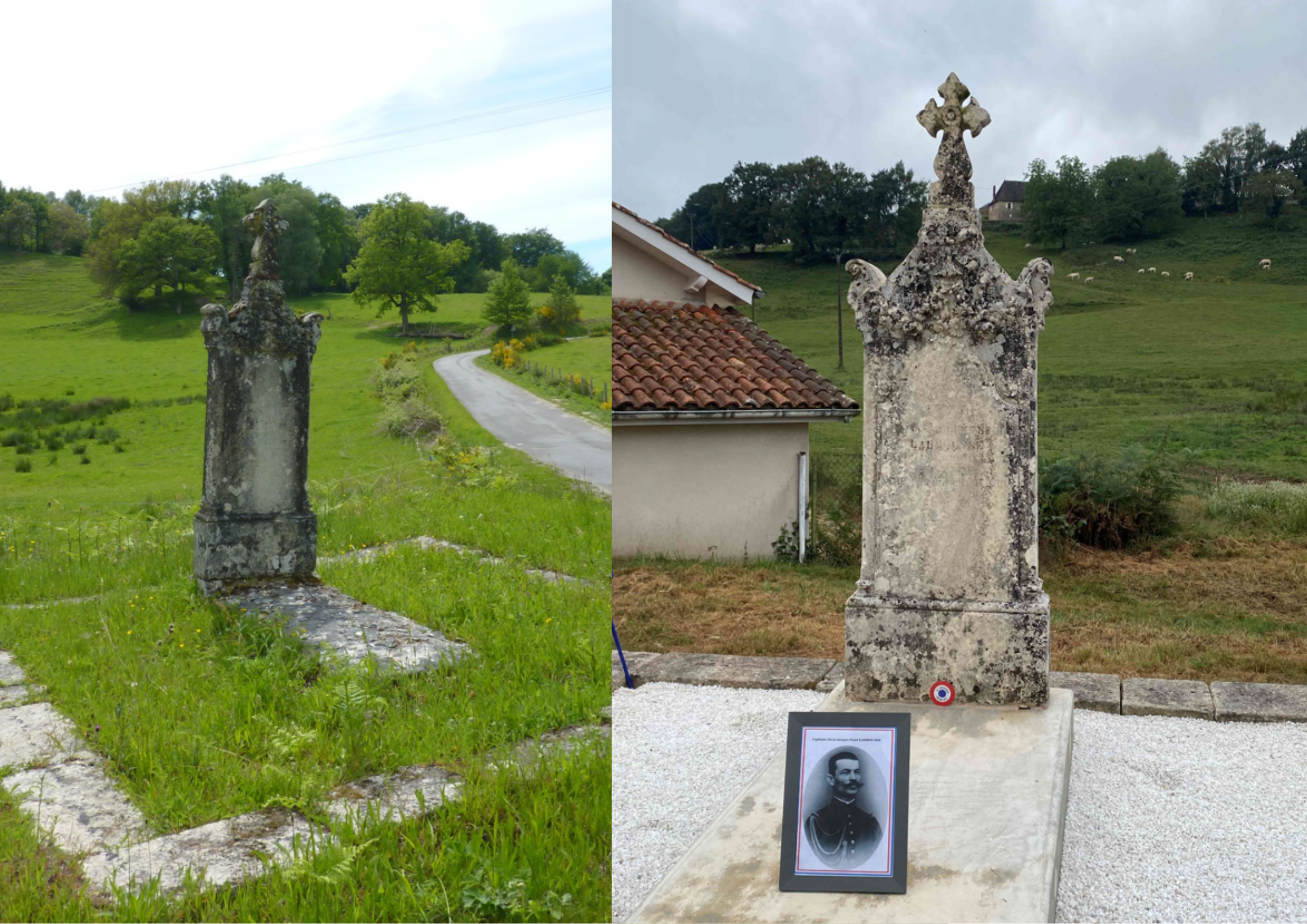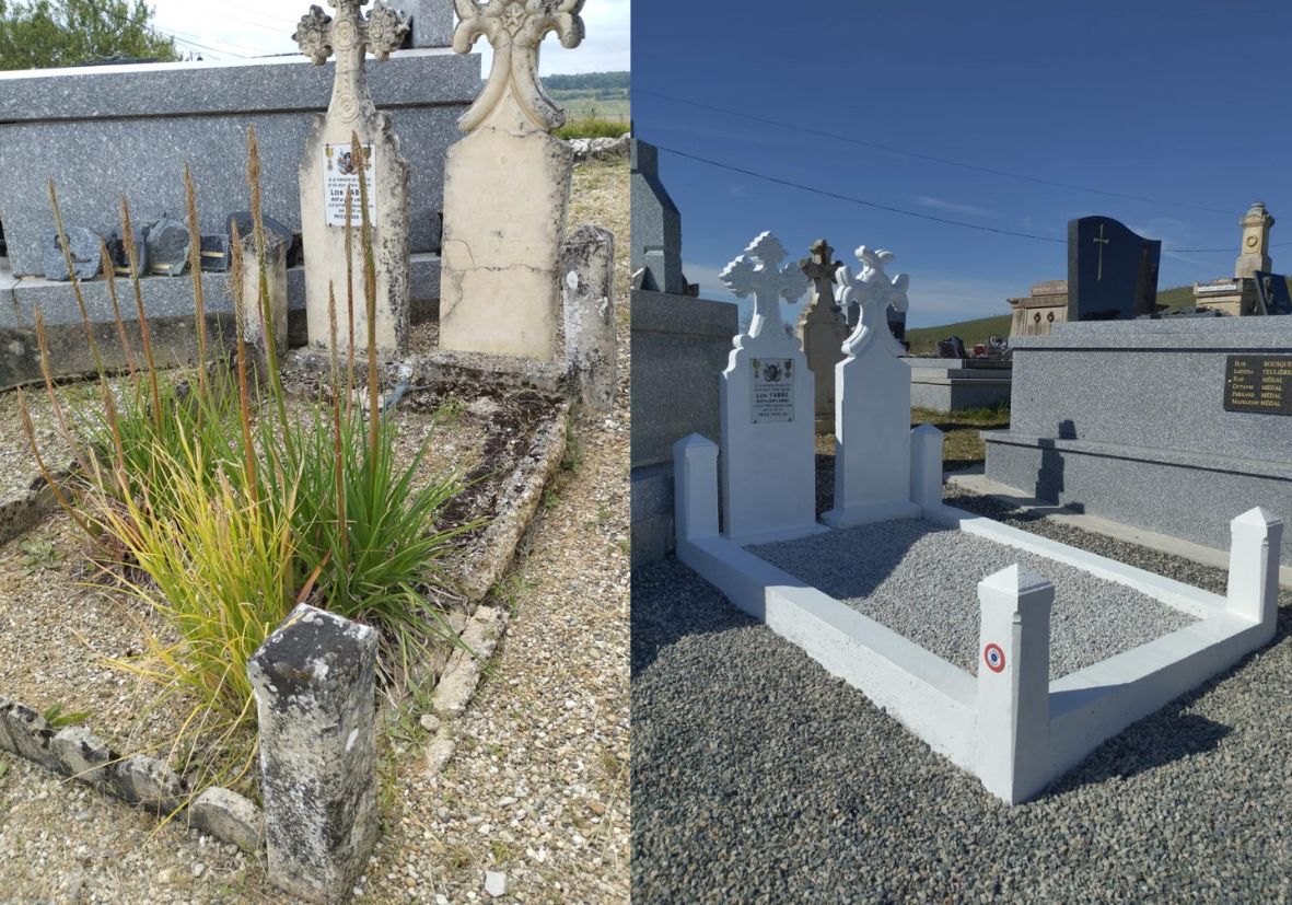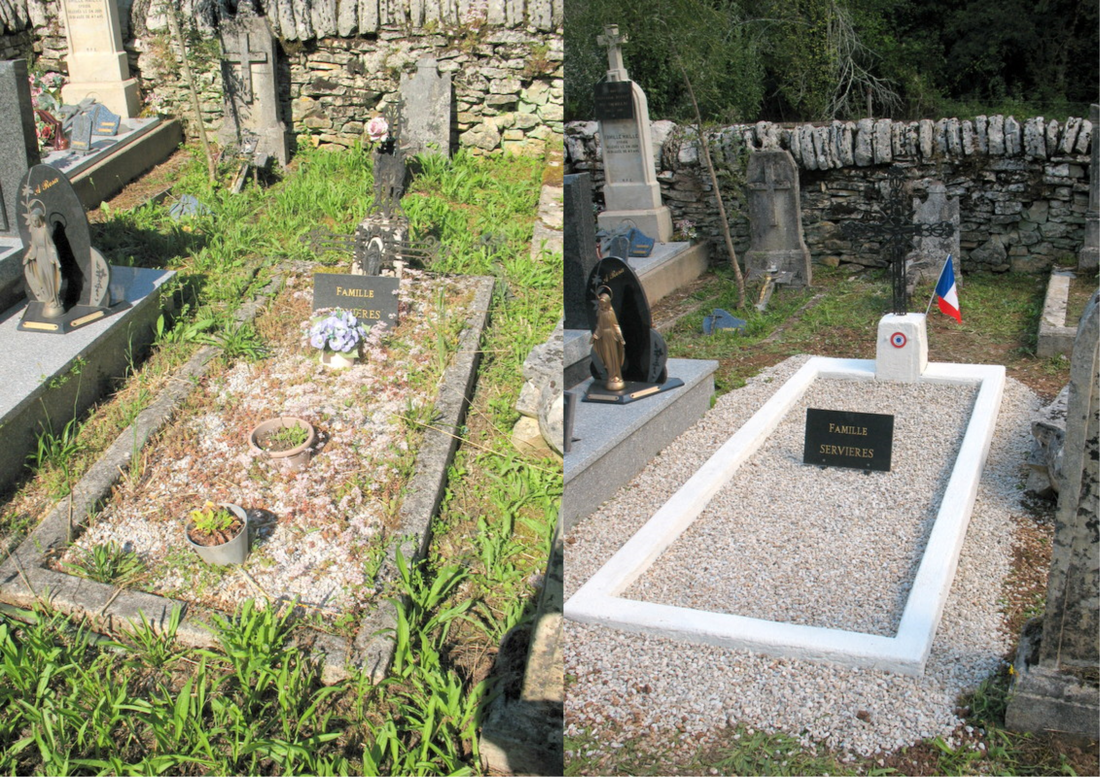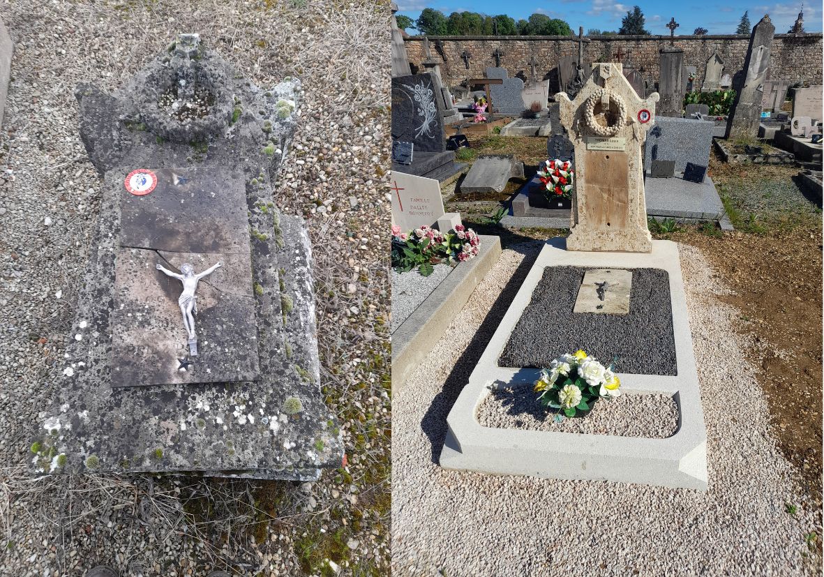 Un avant et un après de la réfection de la tombe appartenant à la famille Servières, dans le cimetière des Espiémont à Caylus (Tarn-et-Garonne).