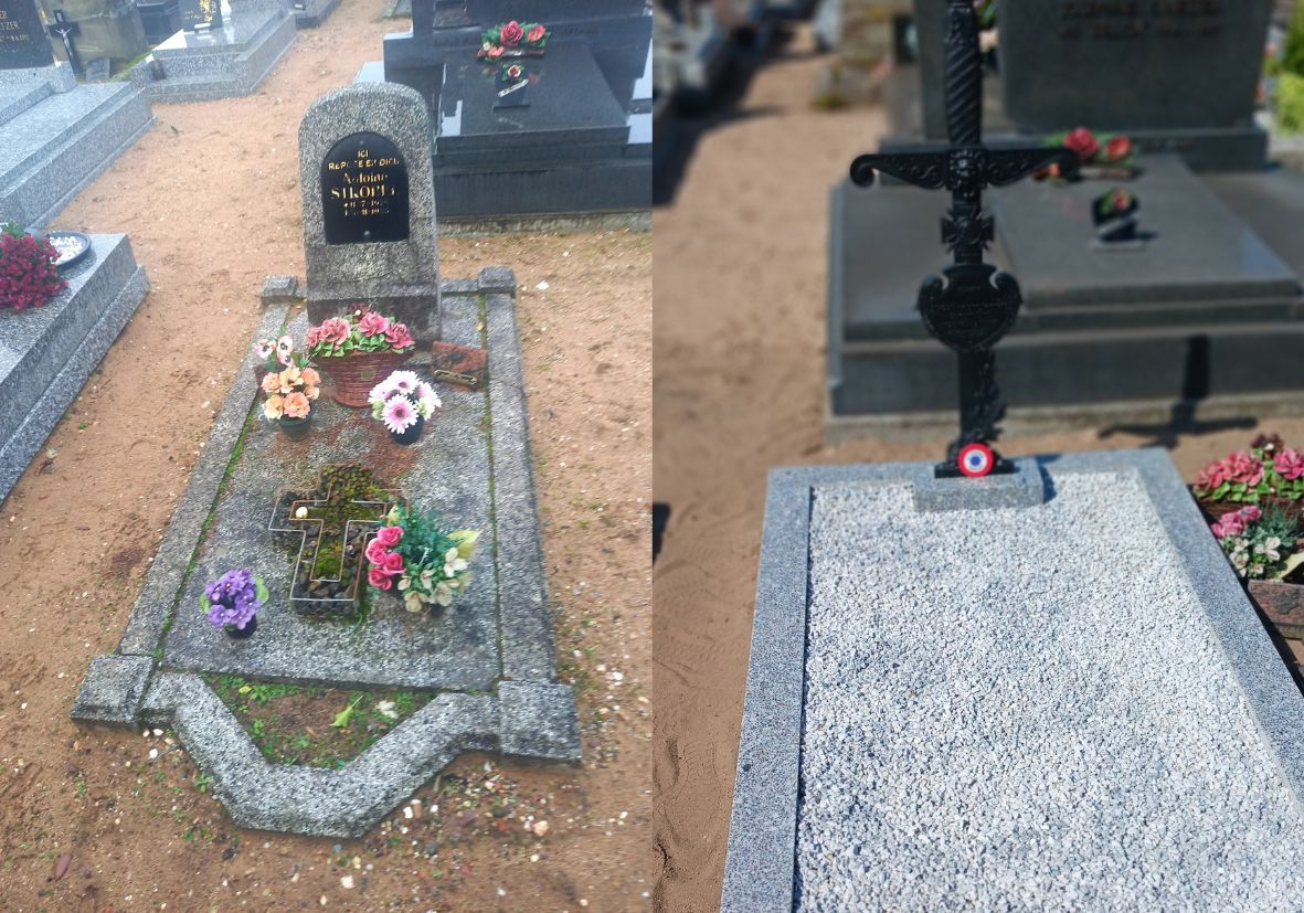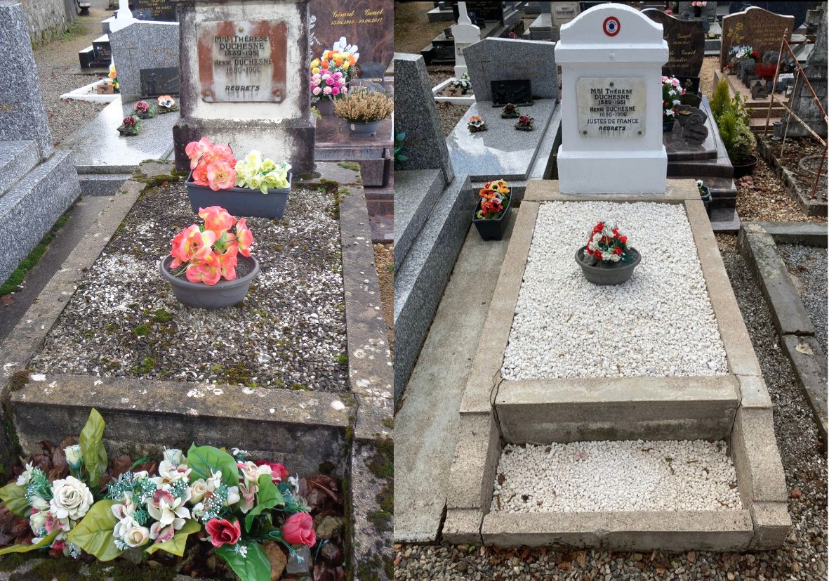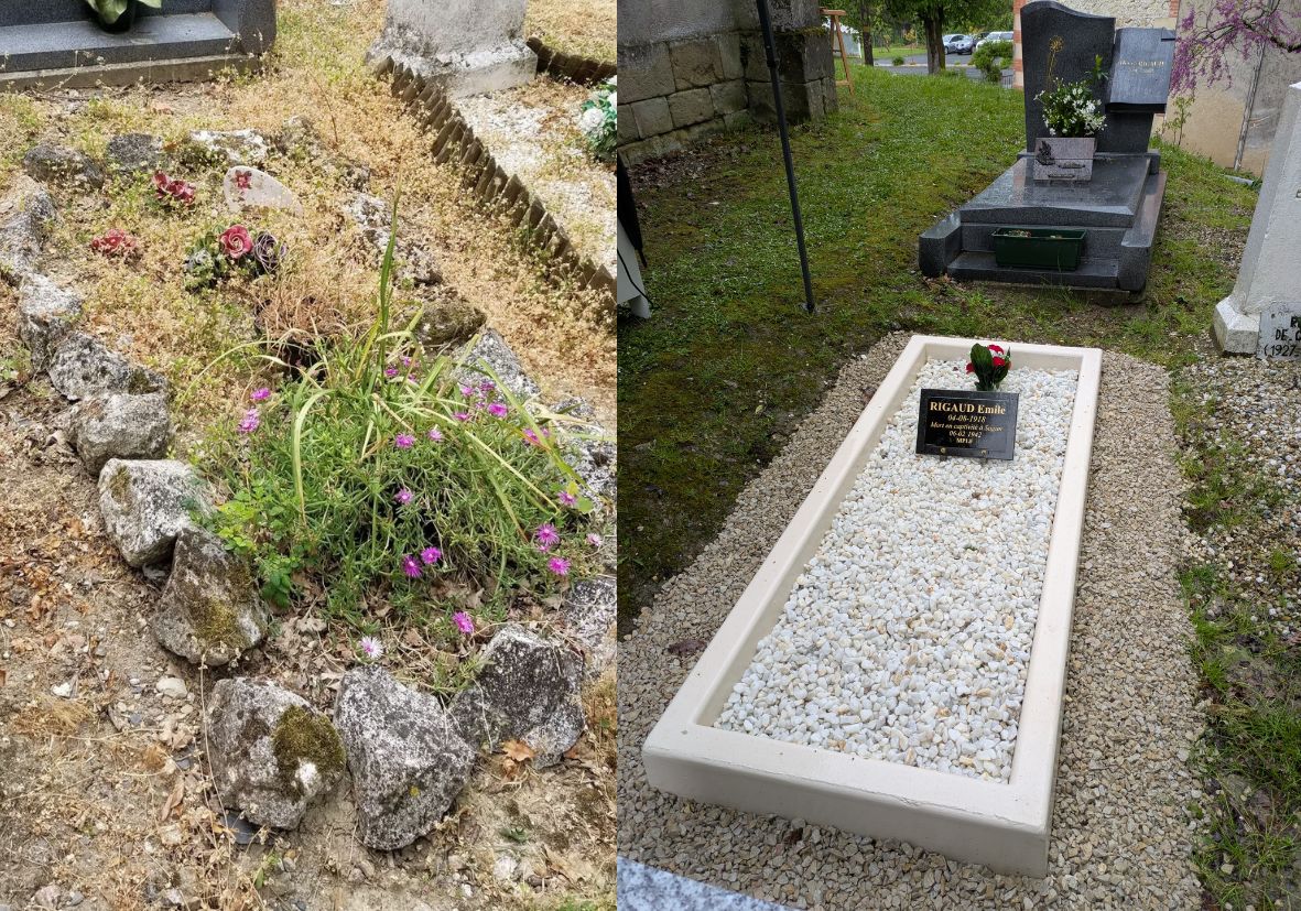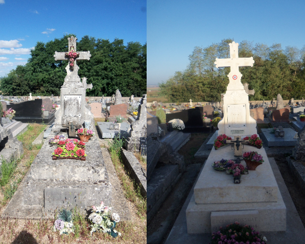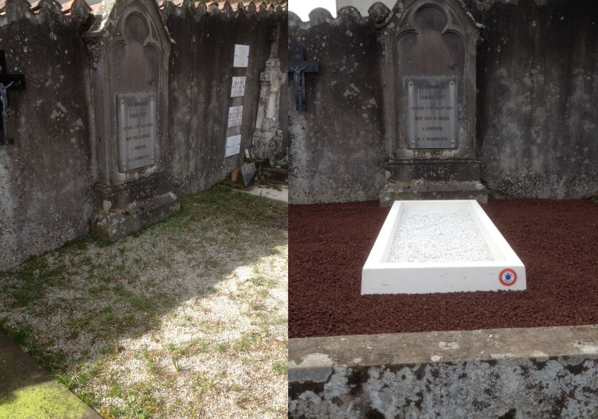Un avant et un après de la réfection de la tombe appartenant à la famille Servières, dans le cimetière des Espiémont à Caylus (Tarn-et-Garonne).