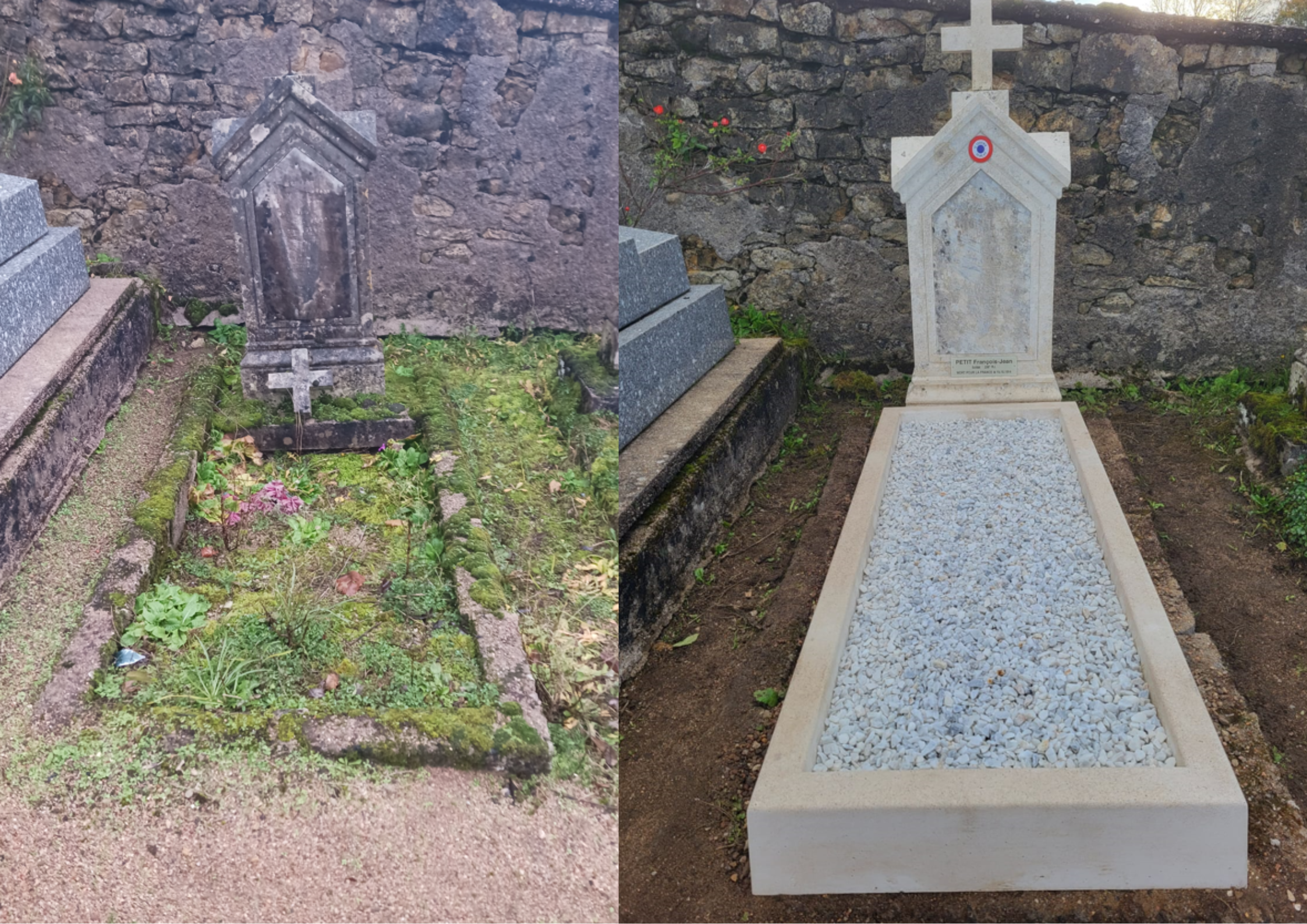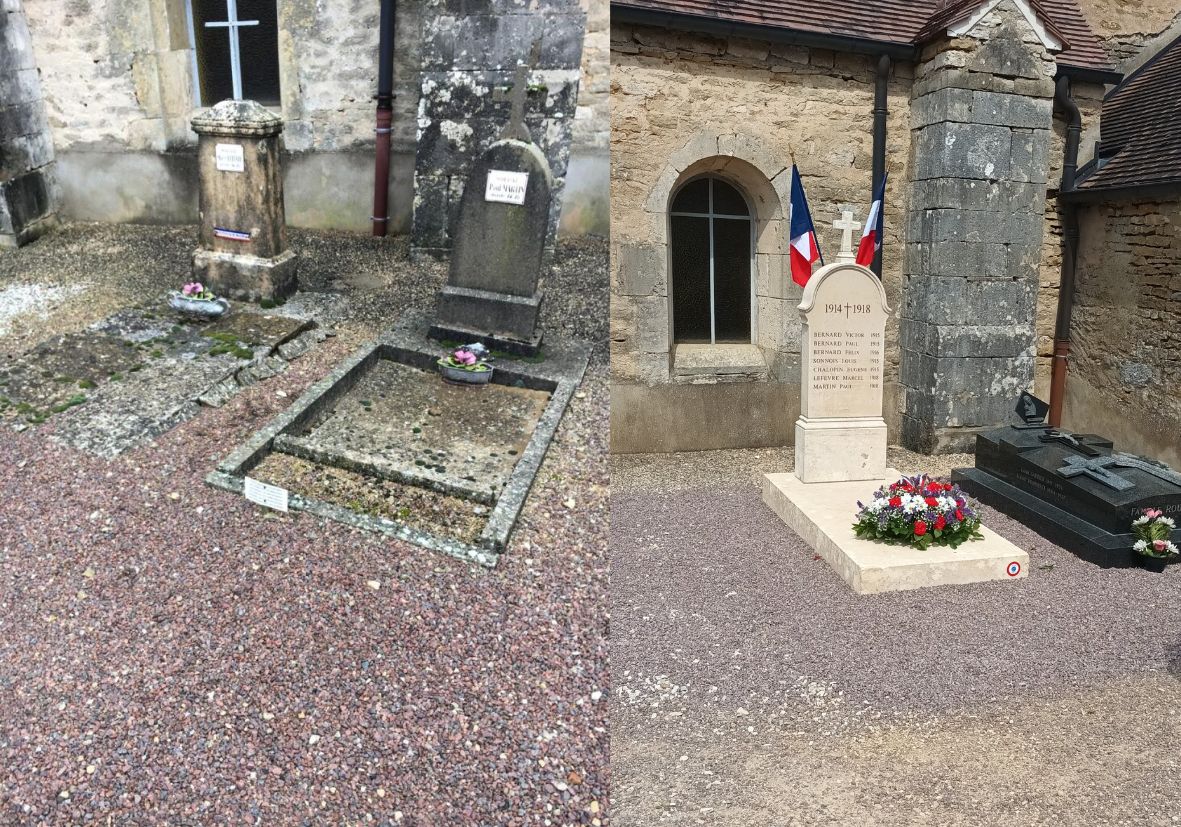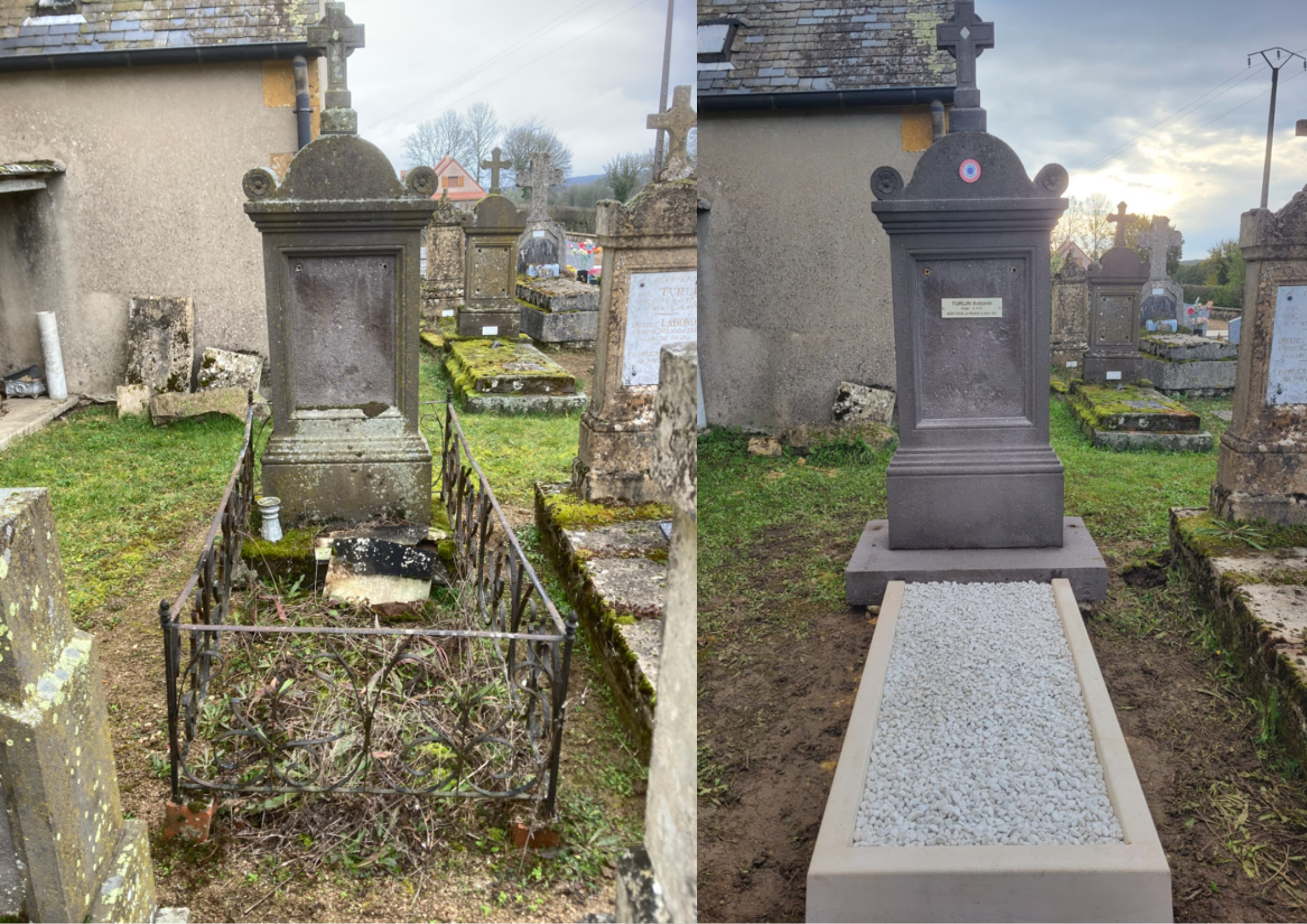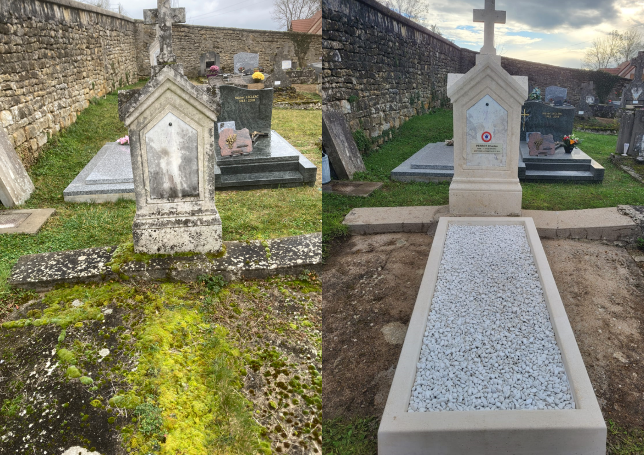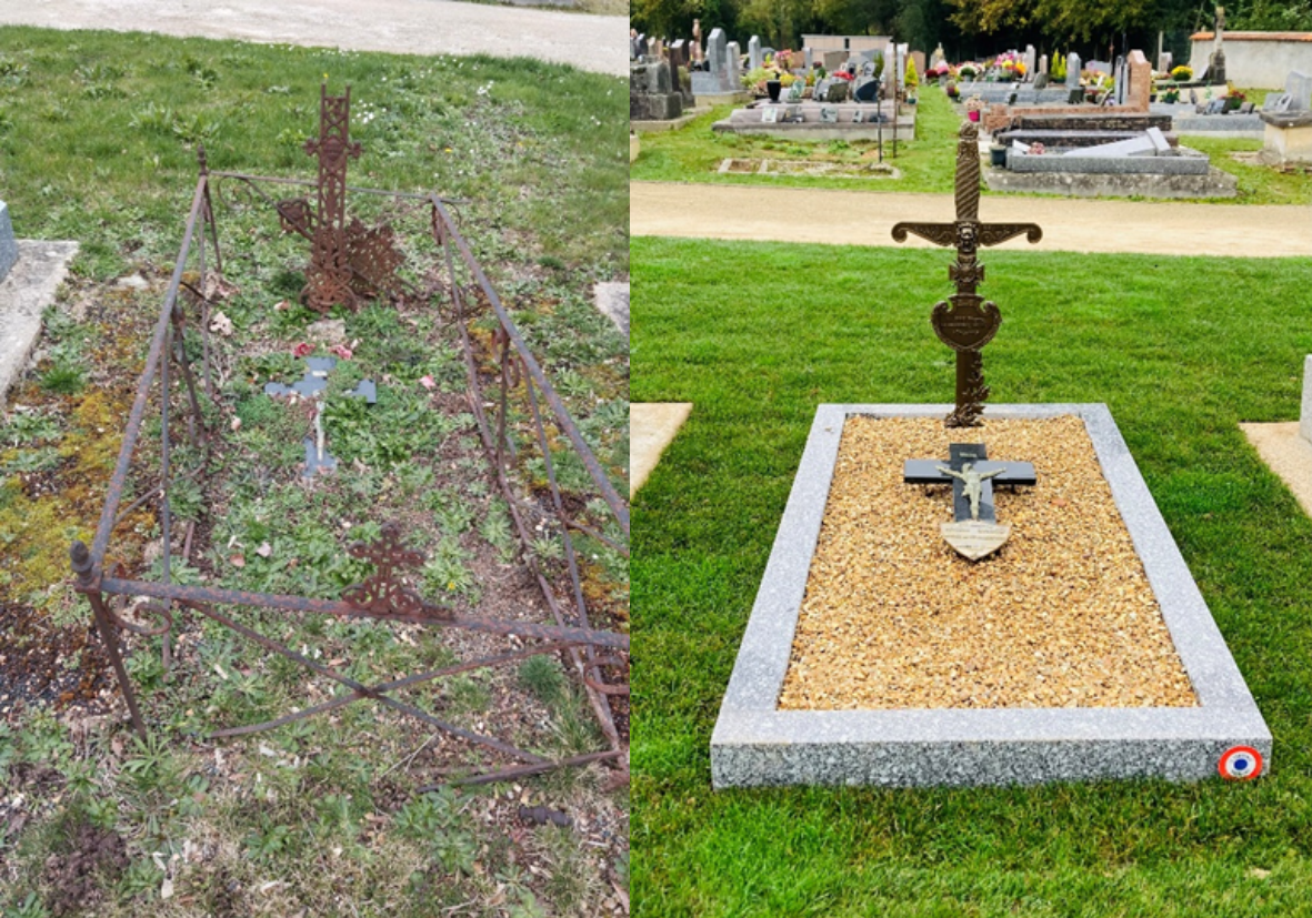 Restauration de la tombe du soldat Jobin, mort en 1918, à Parcy-et-Tigny, dans le cimetière d’Hautvillers (Marne).