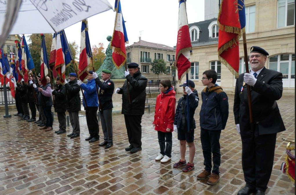 Des enfants accompagnent leurs anciens devant le monument aux morts de Sceaux, à l’occasion du congrès départemental de la Délégation Générale des Hauts-de-Seine le 19 octobre 2024.