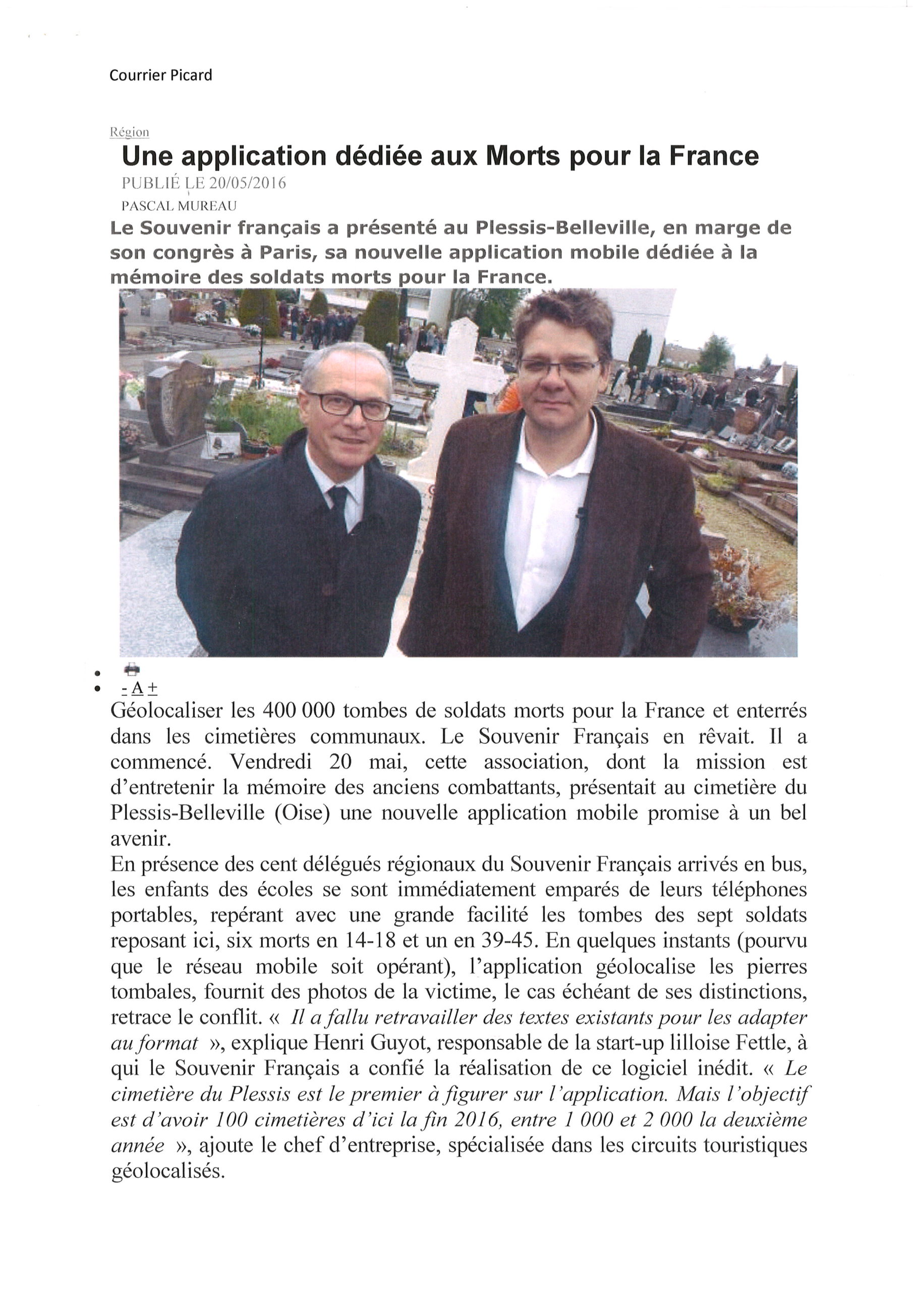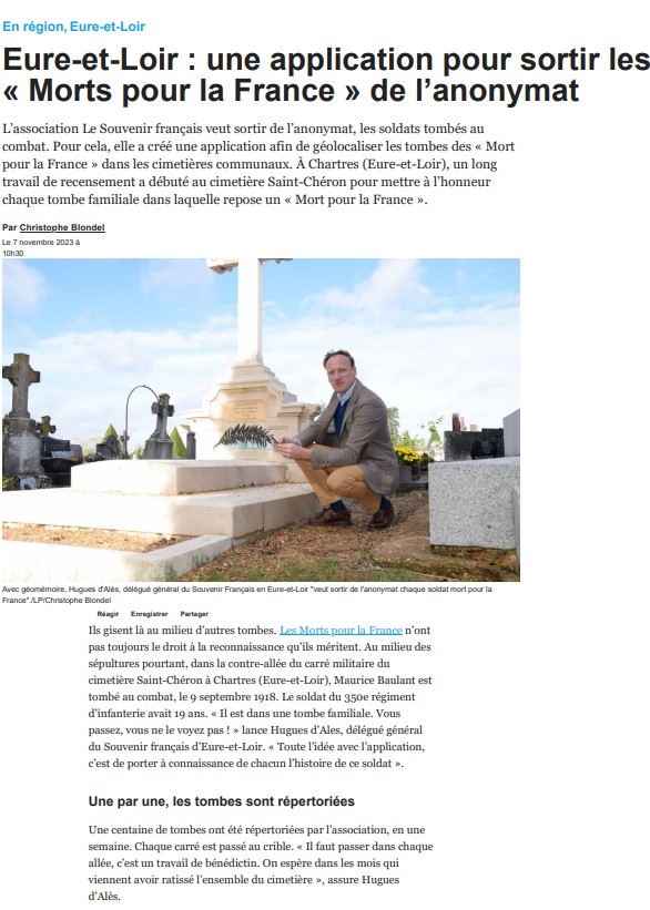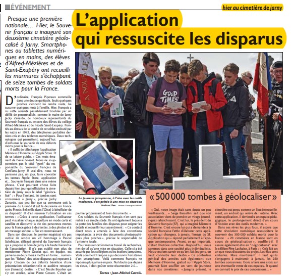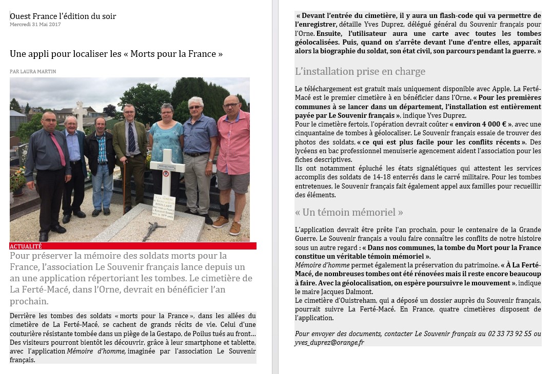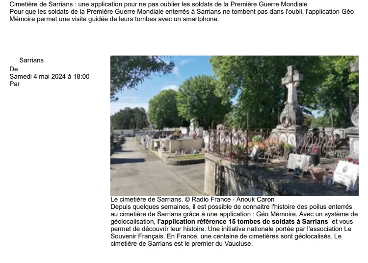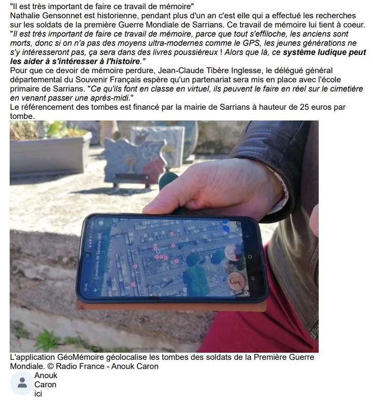 En 2016, Le Souvenir Français a créé l’application GéoMémoire. Téléchargeable gratuitement sur smartphone et tablette, elle géolocalise les tombes des « Morts pour la France » dans les cimetières communaux.