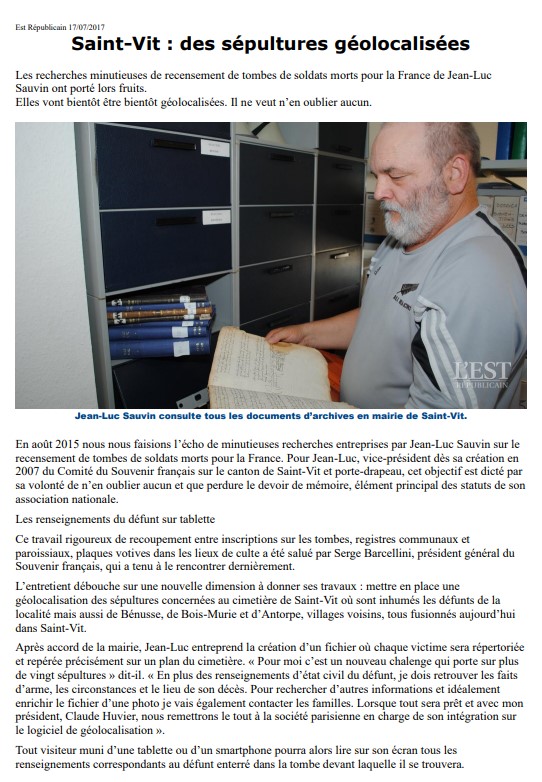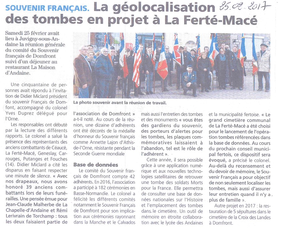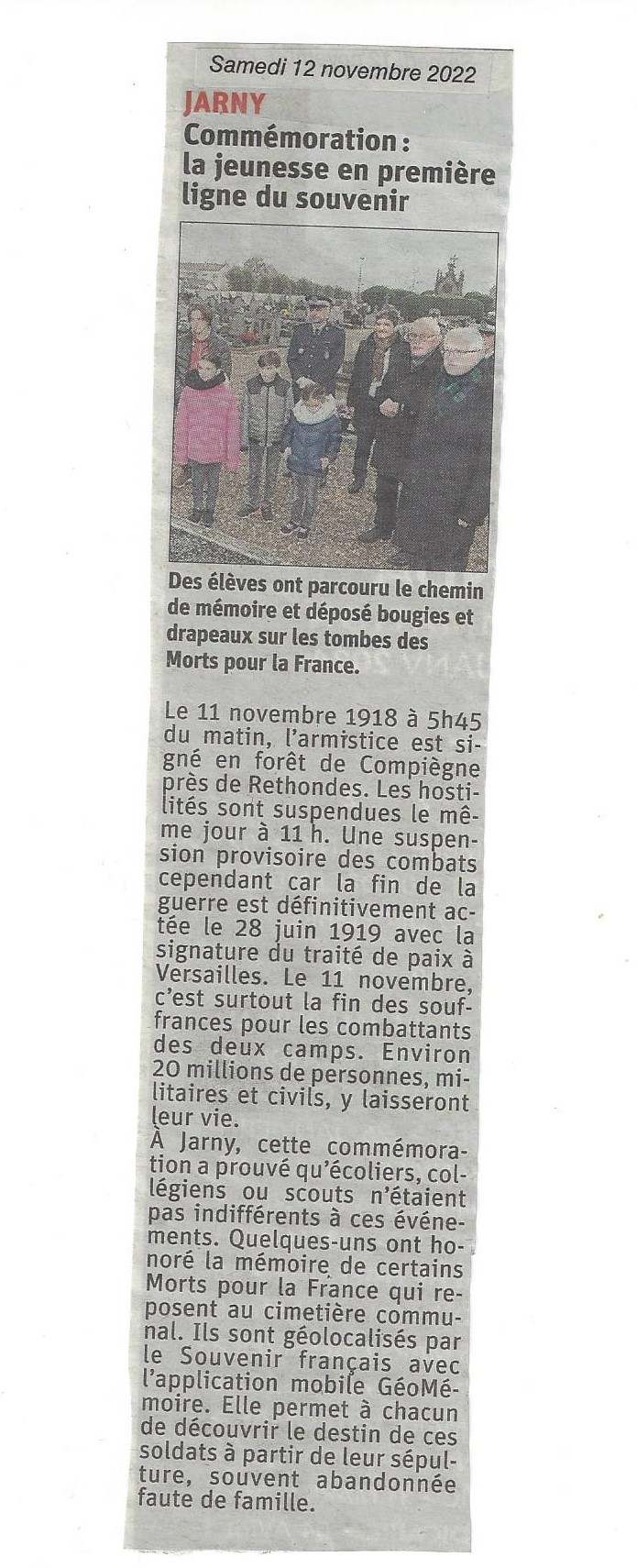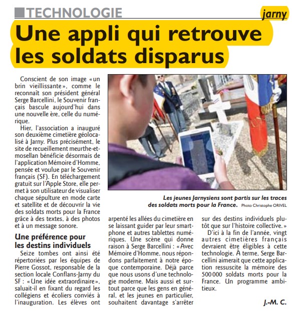 Le mardi 2 mai 2017 à 14h, cérémonie d’inauguration du projet GéoMémoire au cimetière de Jarny en Meurthe-et-Moselle. Les 16 fiches biographiques des combattants « Morts pour la France » ont été intégrées et sont désormais disponibles gratuitement sur l’application mobile GéoMémoire. L’inauguration a eu lieu en présence du Maire de Jarny, Monsieur Jacky Zanardo et du CGA(2s) Serge Barcellini, Président Général du Souvenir Français.