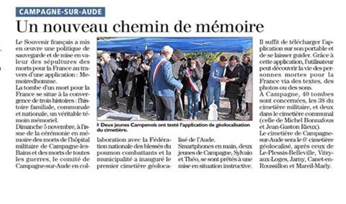 Le 11 novembre 2017, une belle initiative sous l’égide de la commune menée par les associations Le Souvenir Français et la Fédération Nationale des Blessés du Poumon Combattants a été inaugurée. Les 38 fiches biographiques des combattants inhumés dans le cimetière de Campagne-sur-Aude sont désormais disponibles dans l’application mobile GéoMémoire !